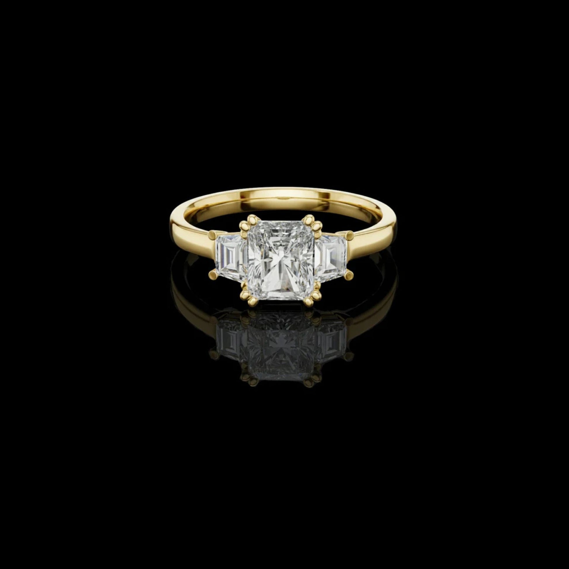Discover unmatched elegance with this stunning Radiant -cut diamond ring crafted in premium gold. The captivating center stone is enhanced by two dazzling step-cut side diamonds, creating a bold and luxurious three-stone design. This masterpiece offers exceptional brilliance, clarity, and a sophisticated geometric sparkle that stands out effortlessly. Perfect for engagements, anniversaries, or anyone who desires a truly luxury statement piece.