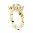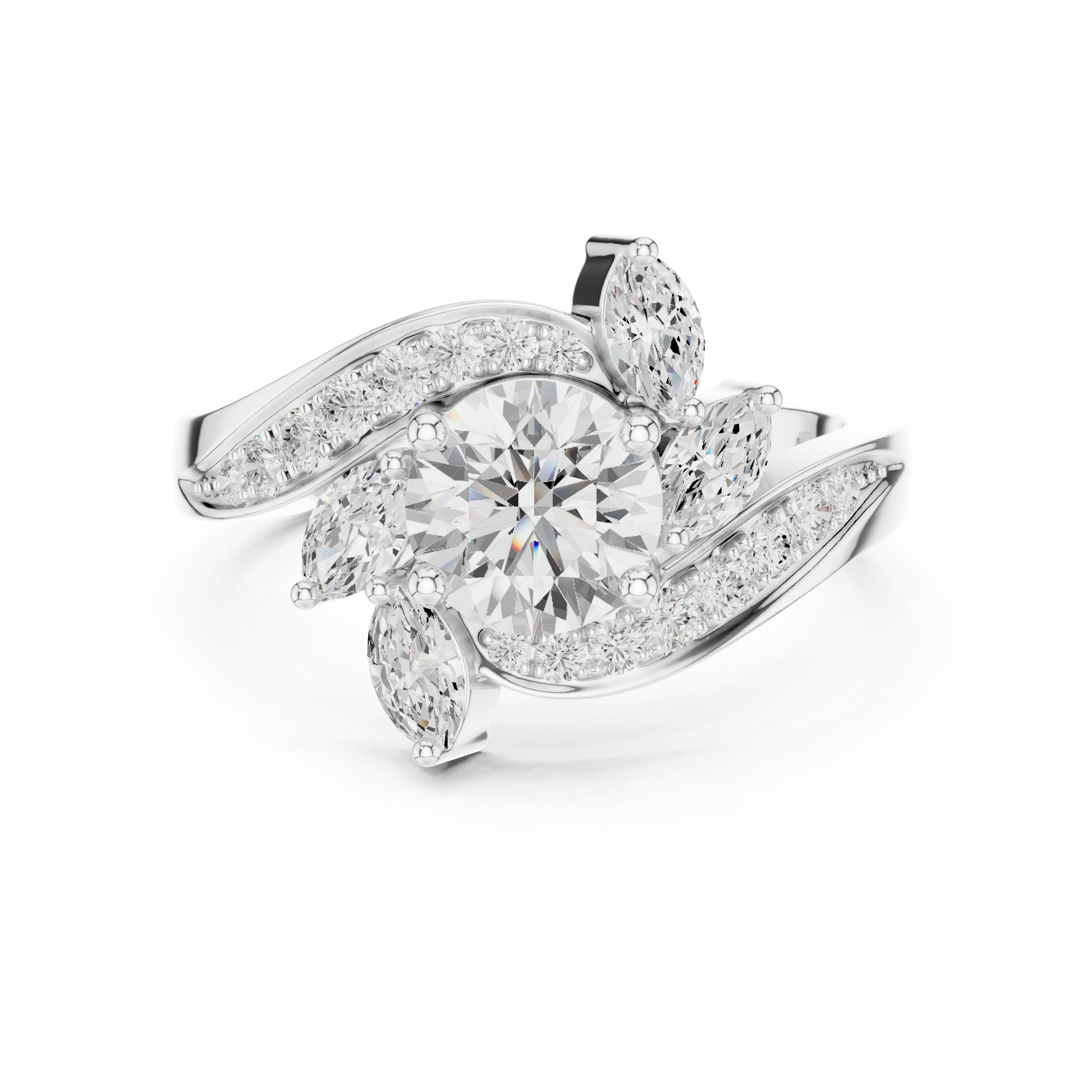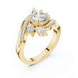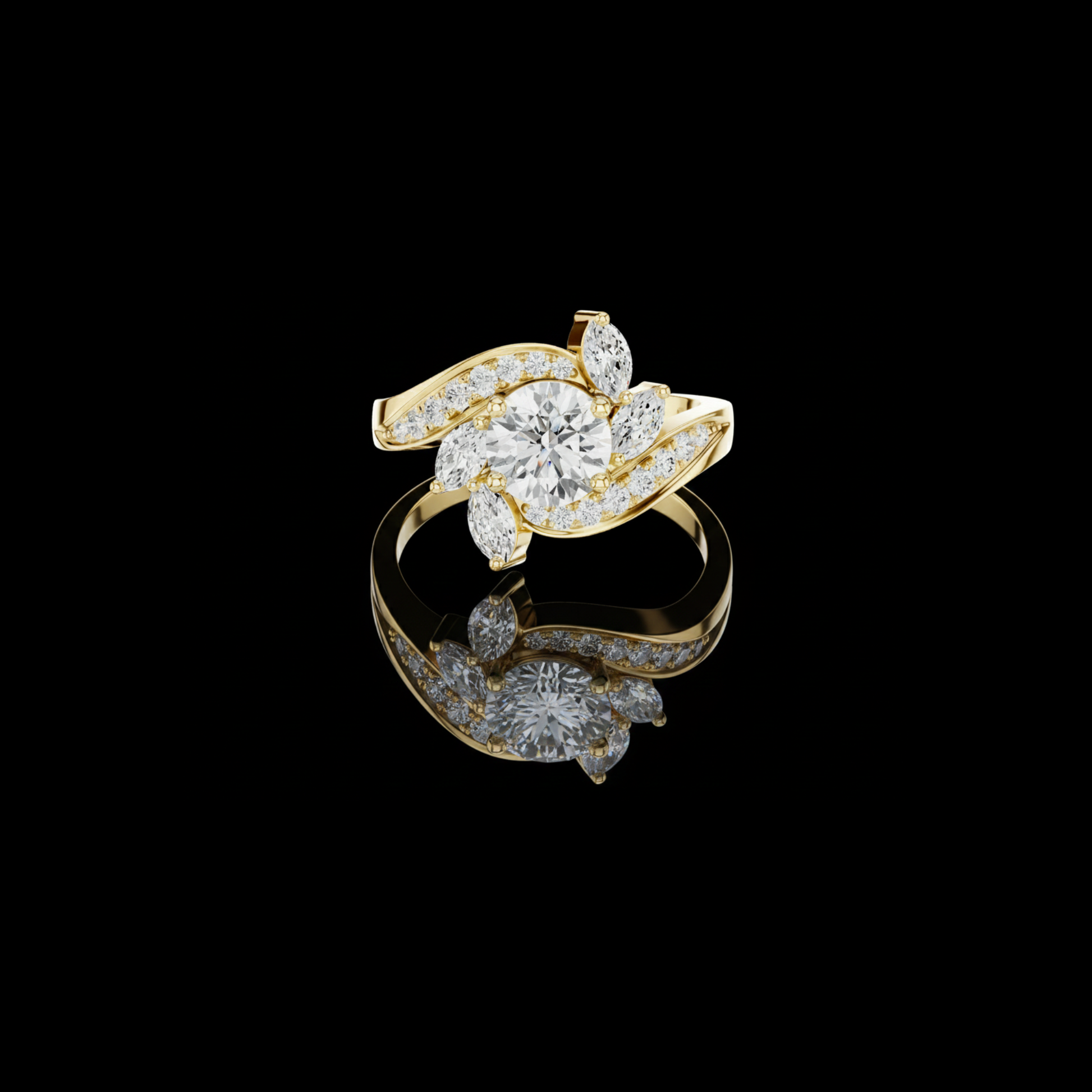 This exquisite gold diamond ring showcases a radiant round brilliant center stone embraced by elegant marquise-cut diamonds that form a graceful floral silhouette. A flowing split shank adorned with shimmering pave-set diamonds adds depth, sparkle, and a sense of movement, beautifully framing the centerpiece from every angle. The warm glow of polished gold enhances the brilliance of each diamond, creating a romantic yet sophisticated design that feels both timeless and distinctive—perfect for an engagement or a statement of enduring love by Ivevar.