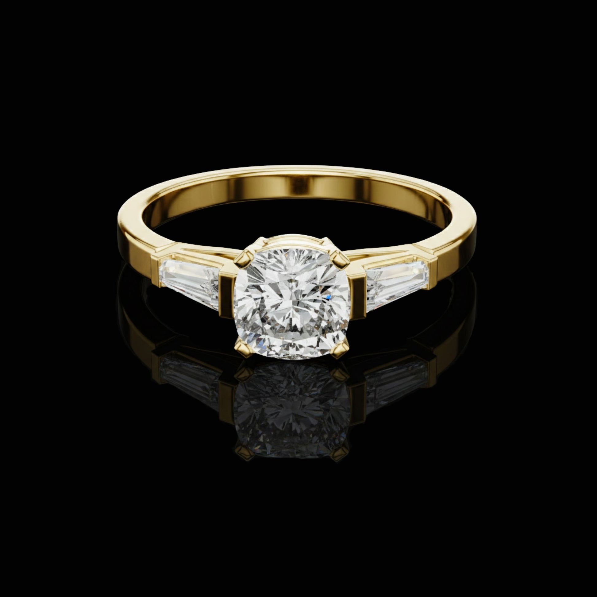 Experience luxury with this stunning cushion cut diamond ring crafted in premium gold. The center diamond shines with exceptional brilliance, enhanced by elegant baguette side stones that add a touch of refined glamour. Designed for those who love timeless elegance, this ring is the perfect choice for engagements, anniversaries, or a truly luxury gift. Its flawless craftsmanship and bold sparkle make it a statement of pure sophistication.