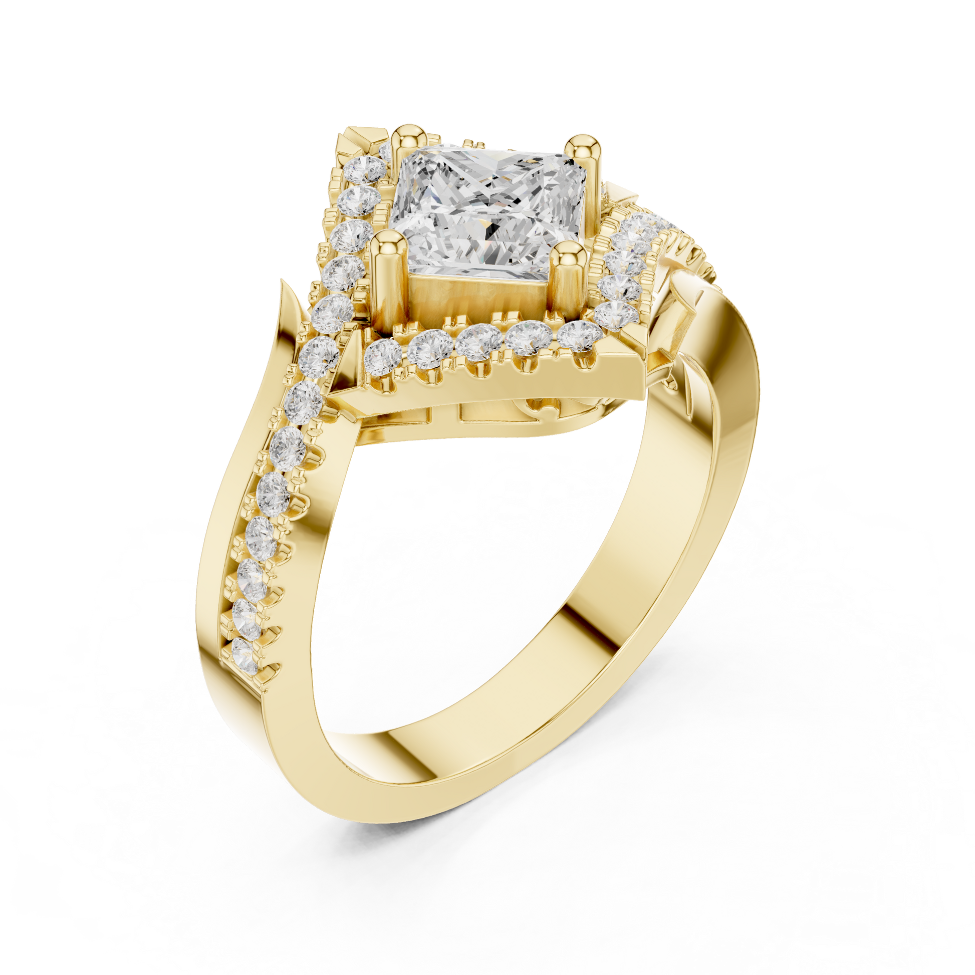 This exquisite princess cut diamond ring showcases a brilliant princess center stone framed by a shimmering halo of round diamonds. Crafted in polished yellow gold, the elegant split shank band is adorned with pavé-set diamonds, adding depth, brilliance, and a luxurious finish. The bold geometric silhouette blends modern glamour with timeless elegance, making it a perfect choice for engagements, anniversaries, or statement jewelry lovers who appreciate refined craftsmanship and radiant sparkle.