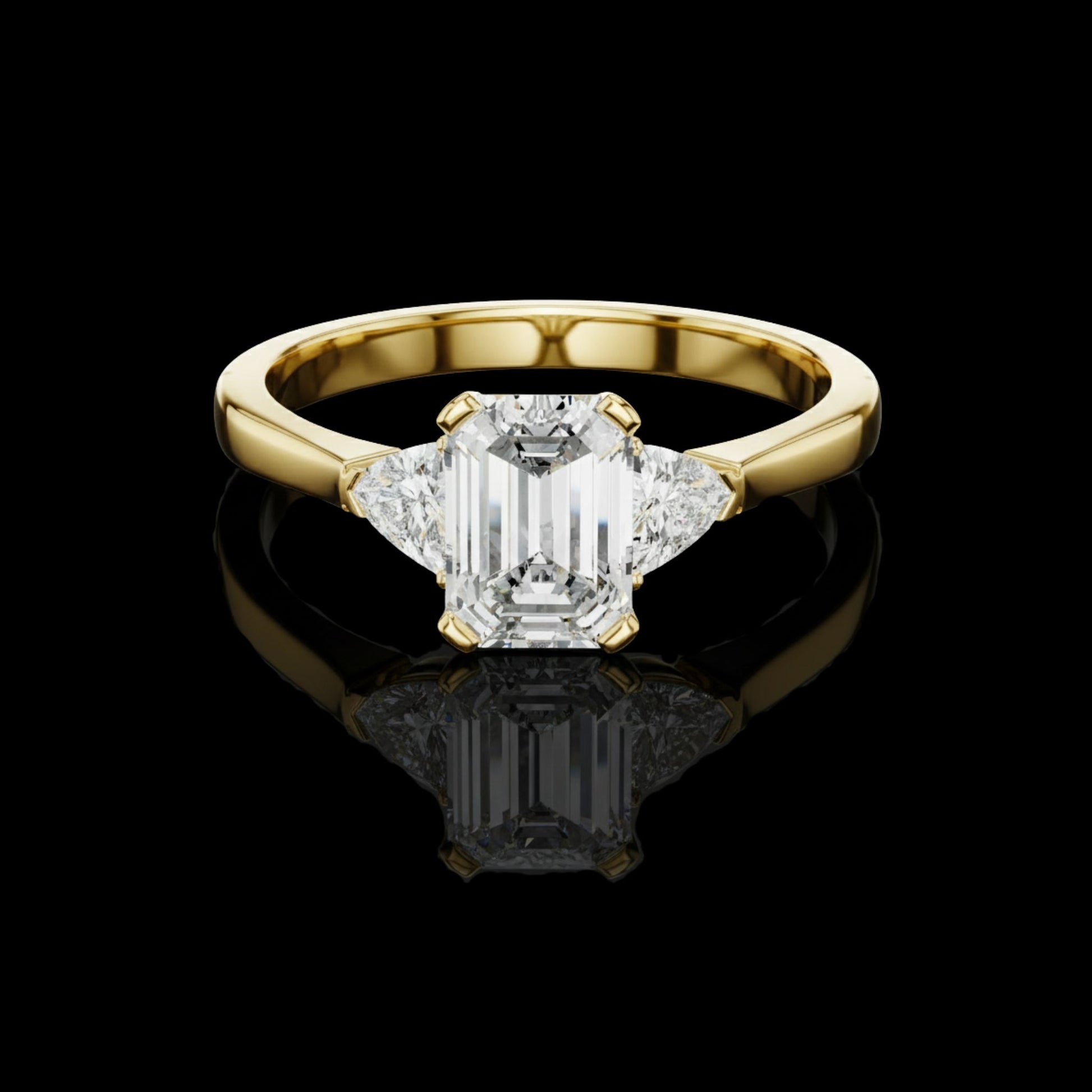 Indulge in refined luxury with this exquisite emerald-cut diamond ring crafted in radiant gold. The striking center stone features mesmerizing step-cut facets, delivering exceptional clarity and a mirror-like sparkle. Flanked by two brilliant trillion side diamonds, this elegant three-stone design symbolizes timeless beauty and balanced sophistication. A perfect choice for engagements, anniversaries, or anyone seeking a bold luxury statement piece.