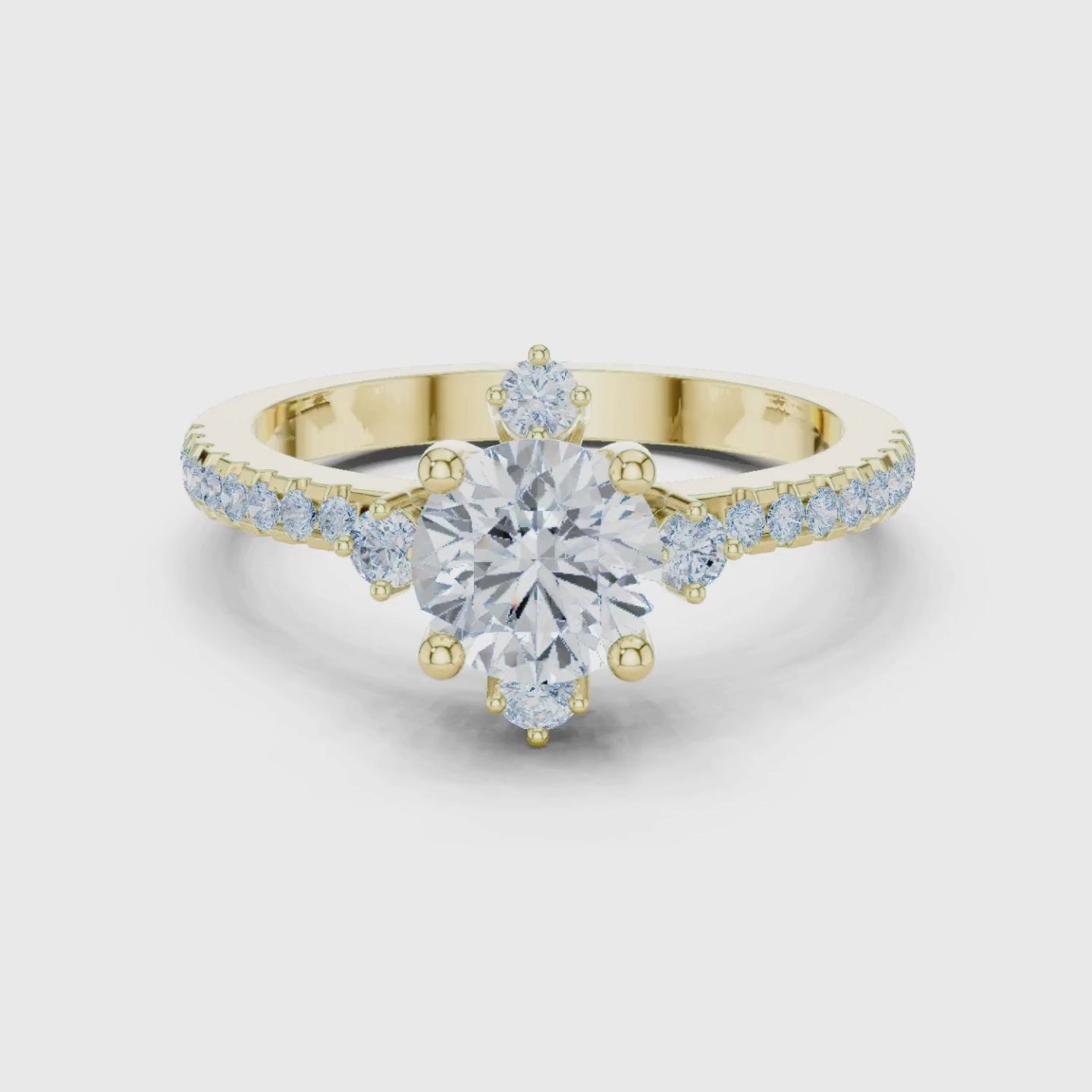 This elegant gold ring showcases a radiant round-cut diamond held in a refined four-prong setting, accented by delicate round diamonds set above and below the center for added dimension and brilliance. The slender band is adorned with pavé-set diamonds that extend along the shoulders, creating a seamless flow of sparkle from every angle. Designed to balance timeless romance with modern refinement, this ring offers a graceful silhouette that feels both classic and contemporary. A sophisticated choice for engagements, anniversaries, or elevated everyday luxury.
