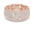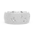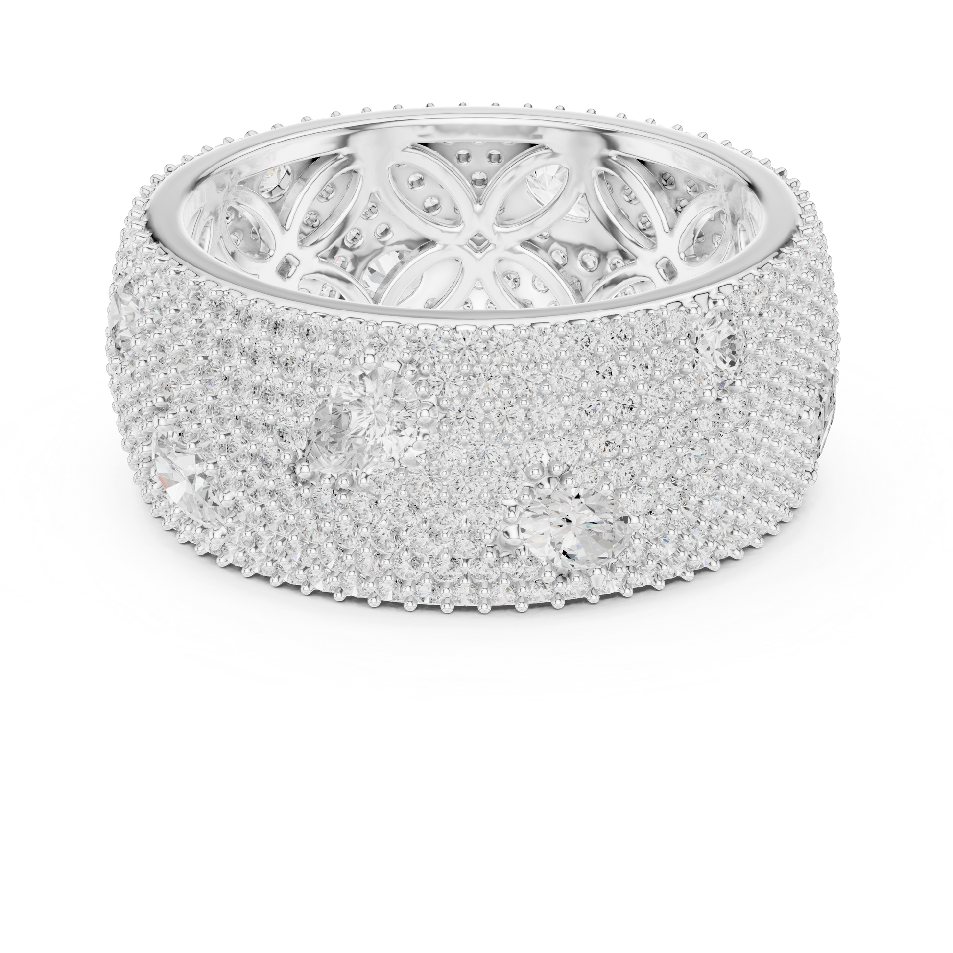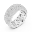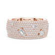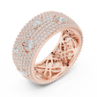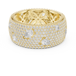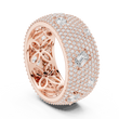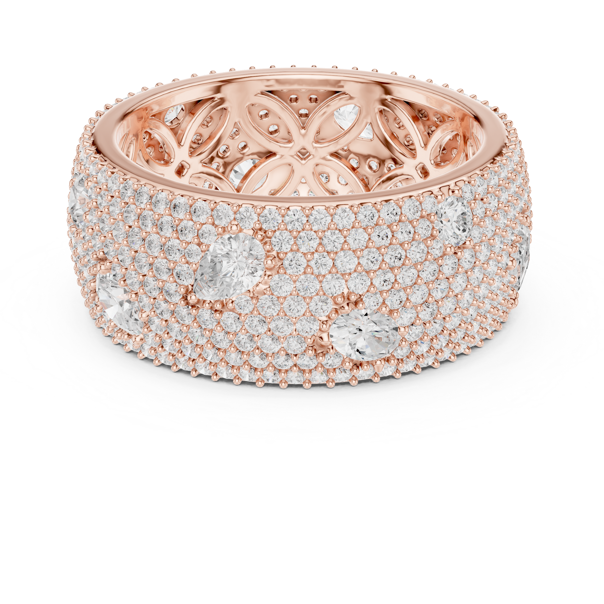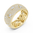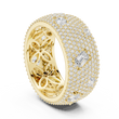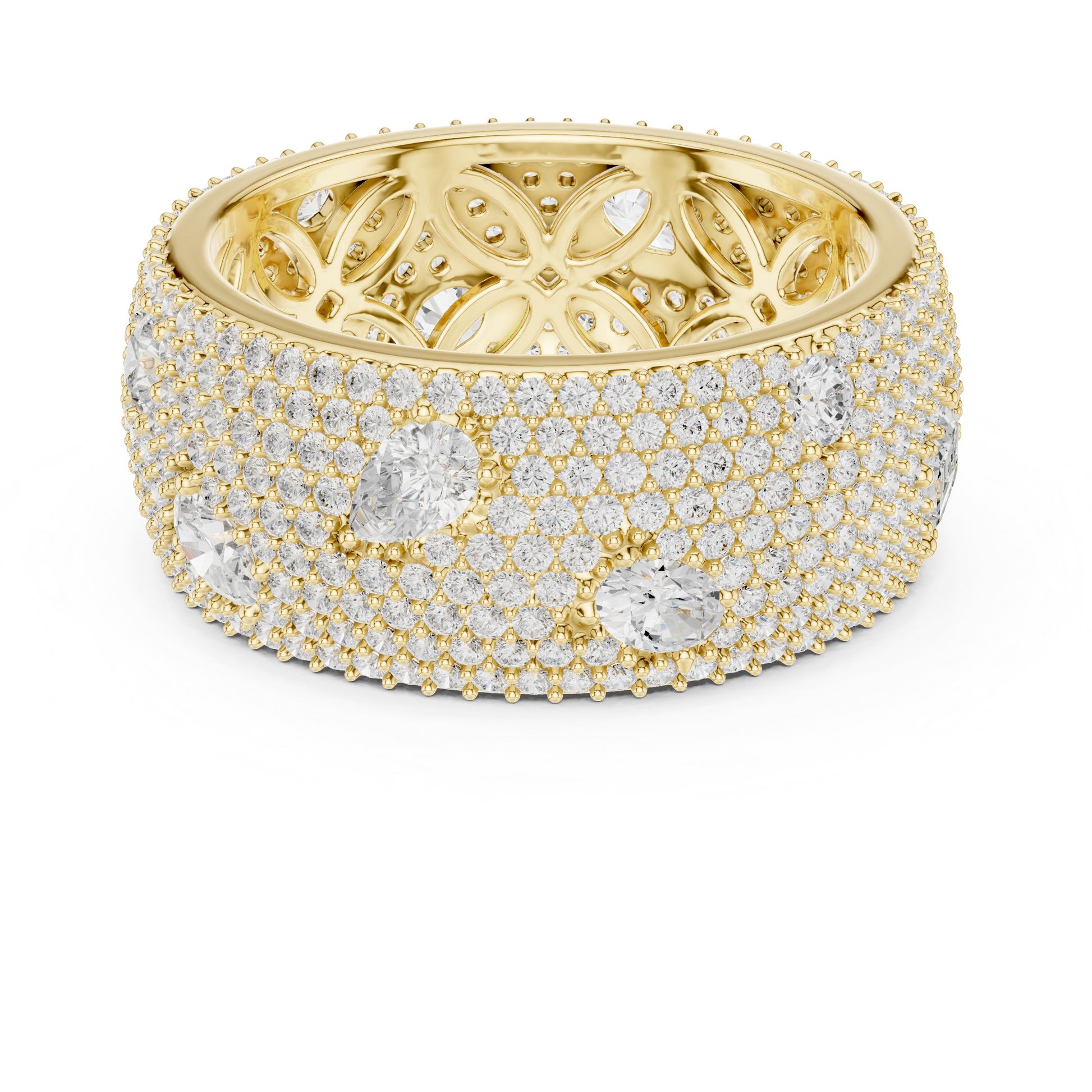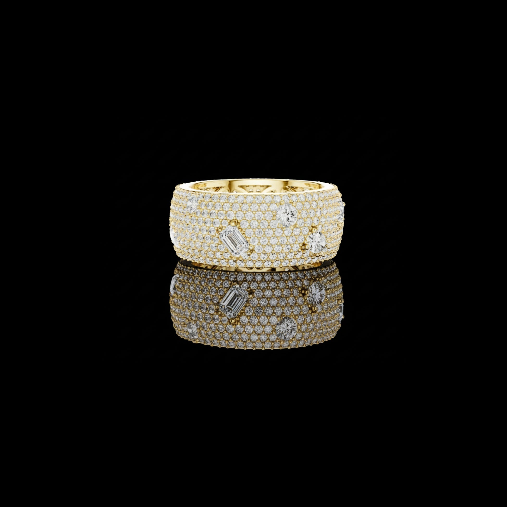 This bold gold band features an opulent pavé surface of meticulously set round diamonds, highlighted by larger scattered statement stones for striking visual depth. The wide silhouette is complemented by an intricate openwork interior, delivering both comfort and refined craftsmanship. Designed for those who favor dramatic luxury, this ring is ideal as a statement piece, anniversary band, or elevated fashion jewelry.