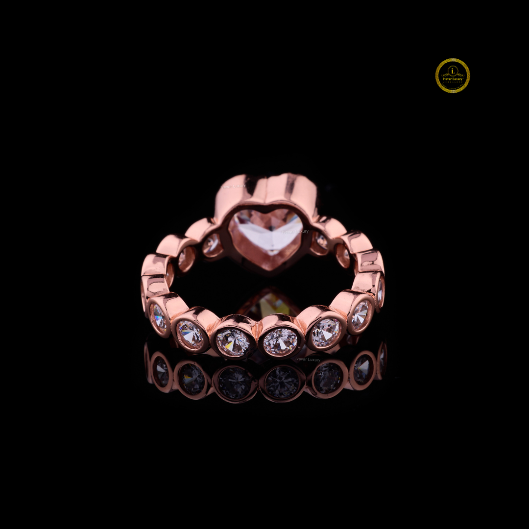 This stunning heart-cut diamond ring from Ivevar Luxury is designed for those who adore romance and brilliance in every detail. The center stone features bold heart-shaped sparkle, beautifully complemented by full bezel-set round diamonds that wrap around the band in a radiant eternity style. Crafted in warm rose gold, the ring combines elegance, sentiment, and modern artistry. Each stone is set to maximize fire, shine, and symmetry, creating a piece that feels both luxurious and meaningful. Whether chosen for love, gifting, or celebration, this Ivevar Luxury creation stands as a timeless expression of beauty.