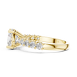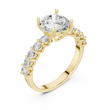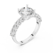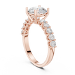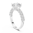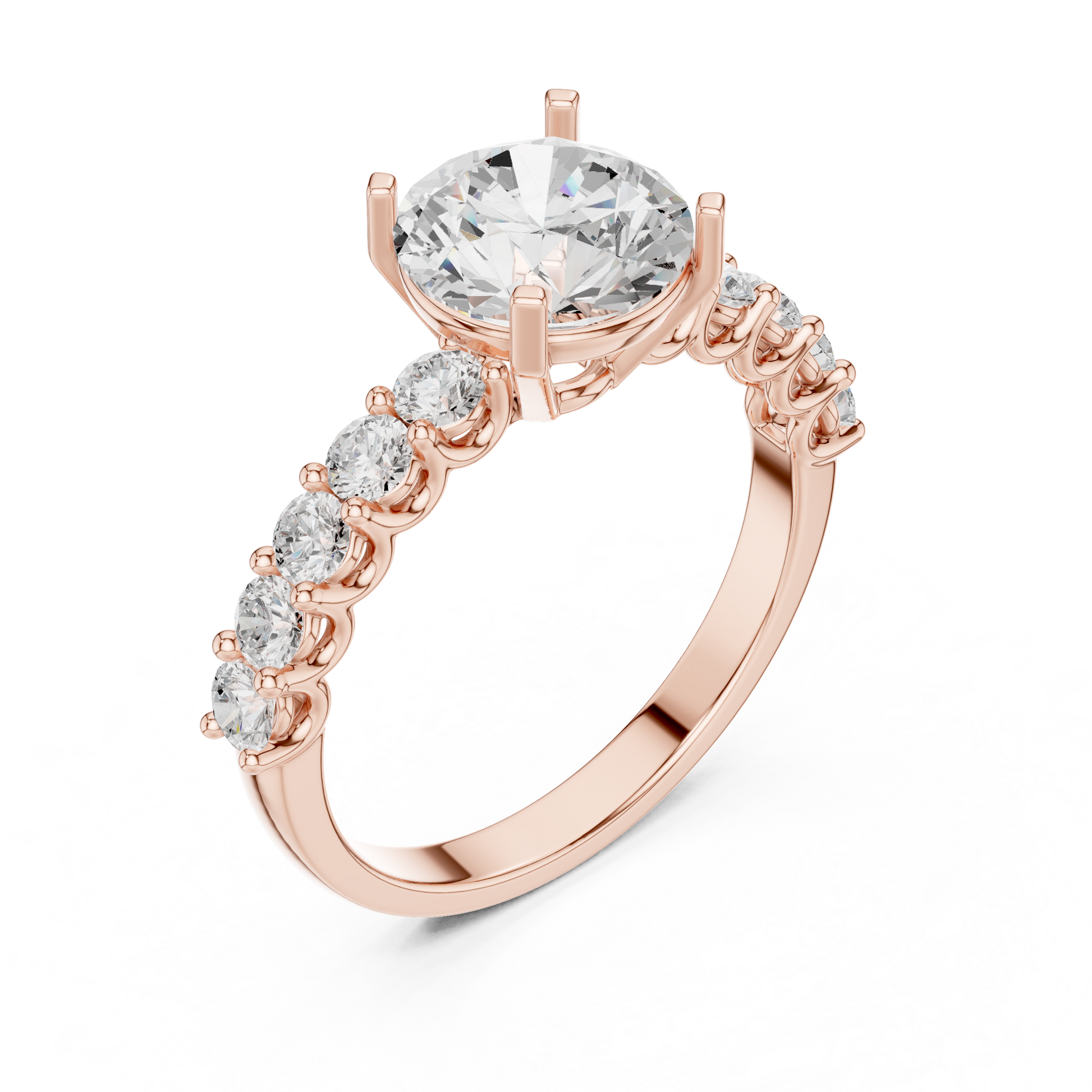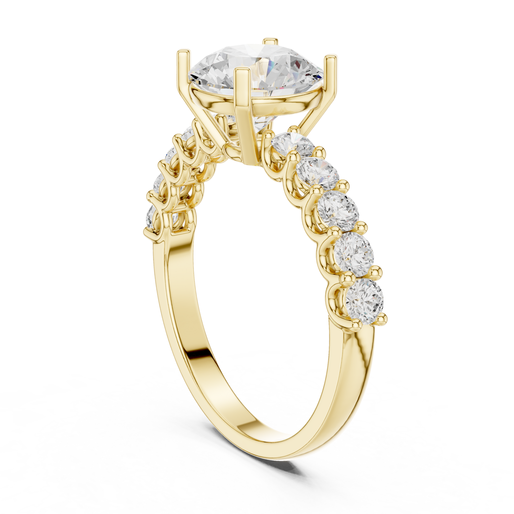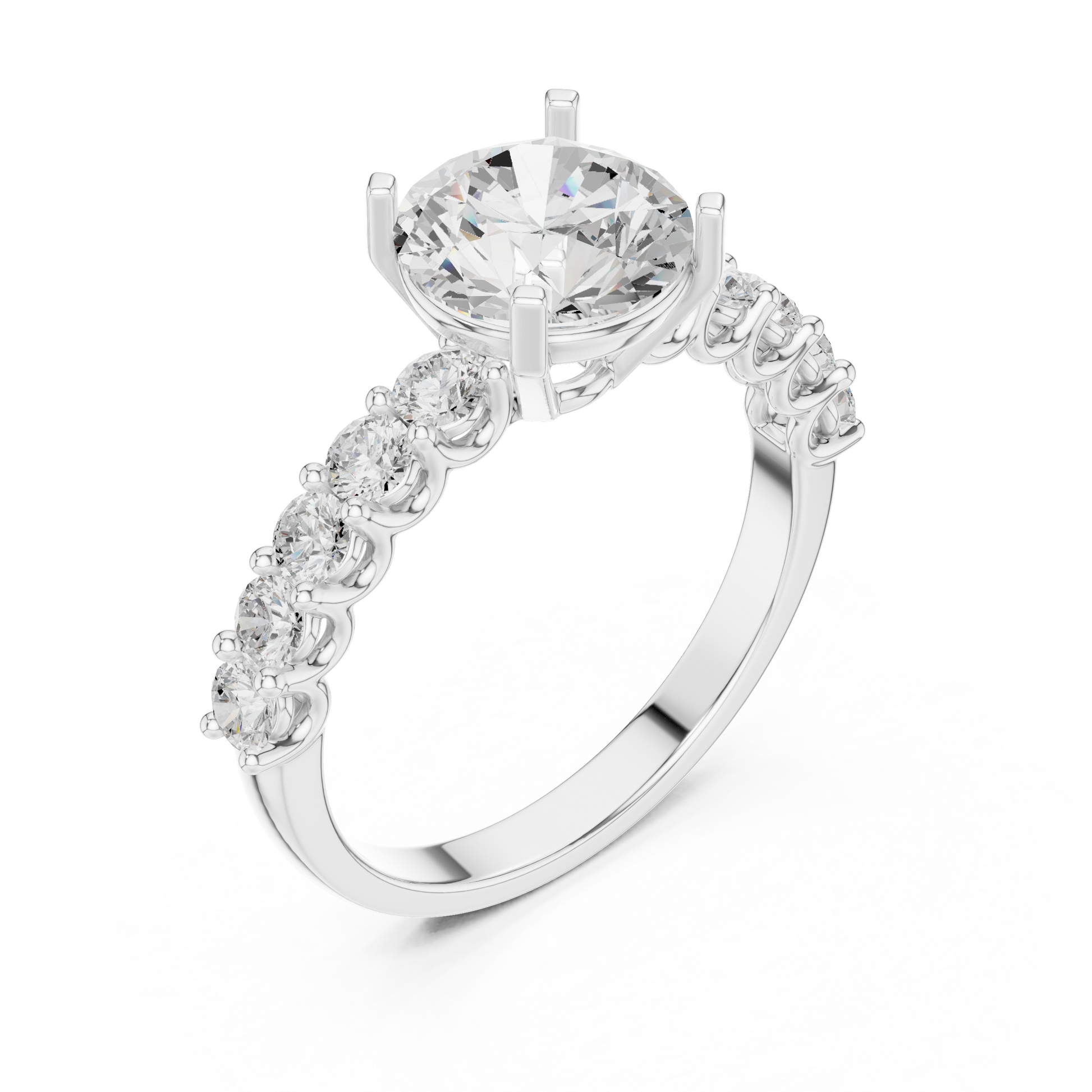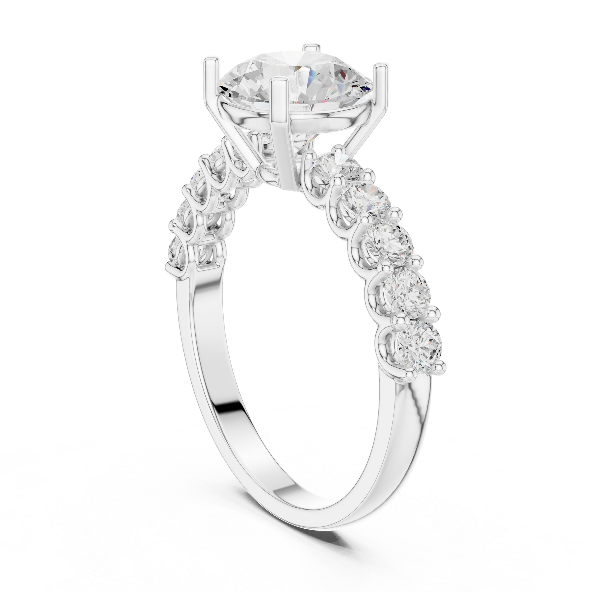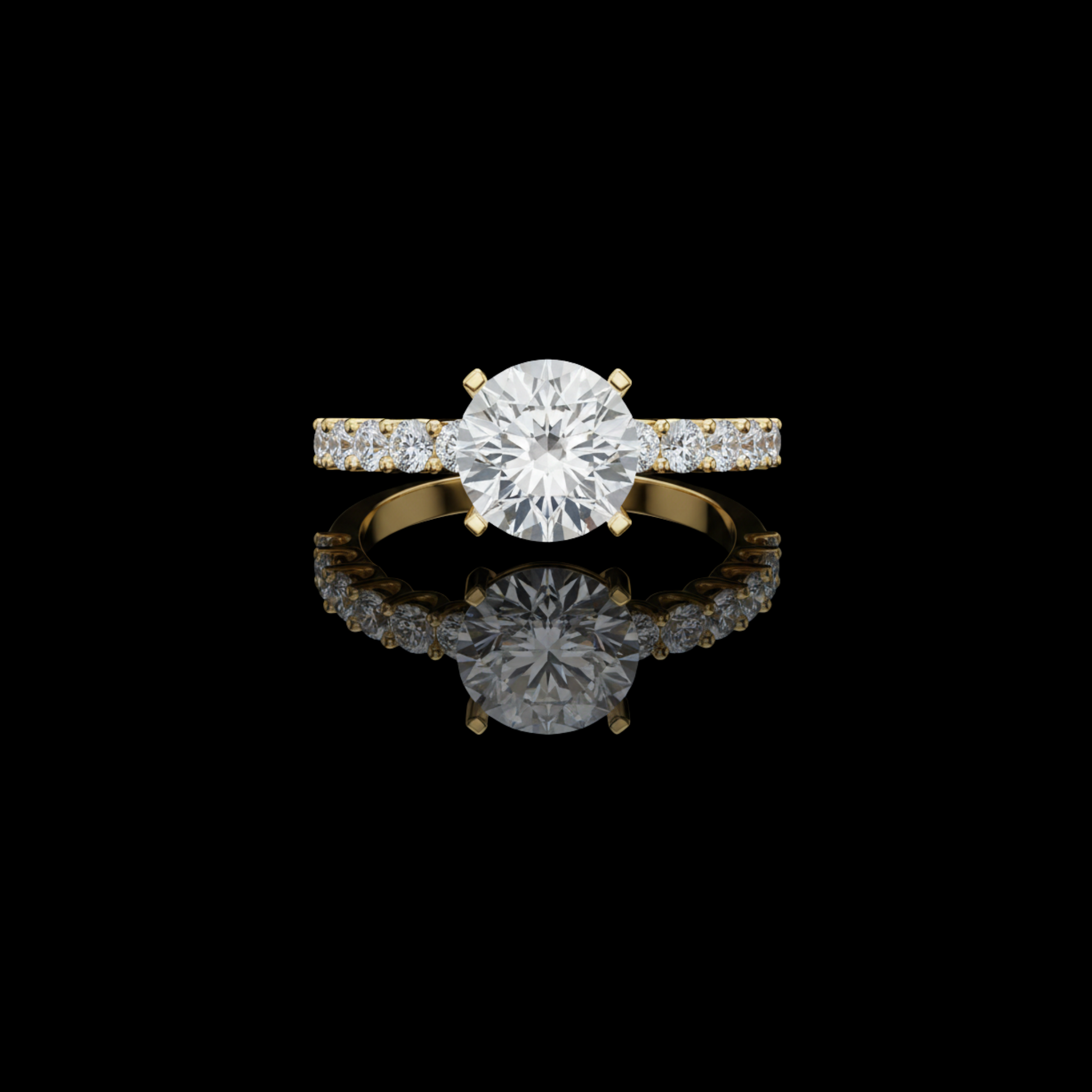 This elegant ring features a striking round center diamond supported by a band lined with brilliant pavé-set stones, creating a seamless flow of radiant sparkle. Crafted the design balances classic refinement with modern brilliance, offering a sophisticated shimmer from every angle. Perfect for those who seek a ring that expresses elegance, shine, and timeless craftsmanship.