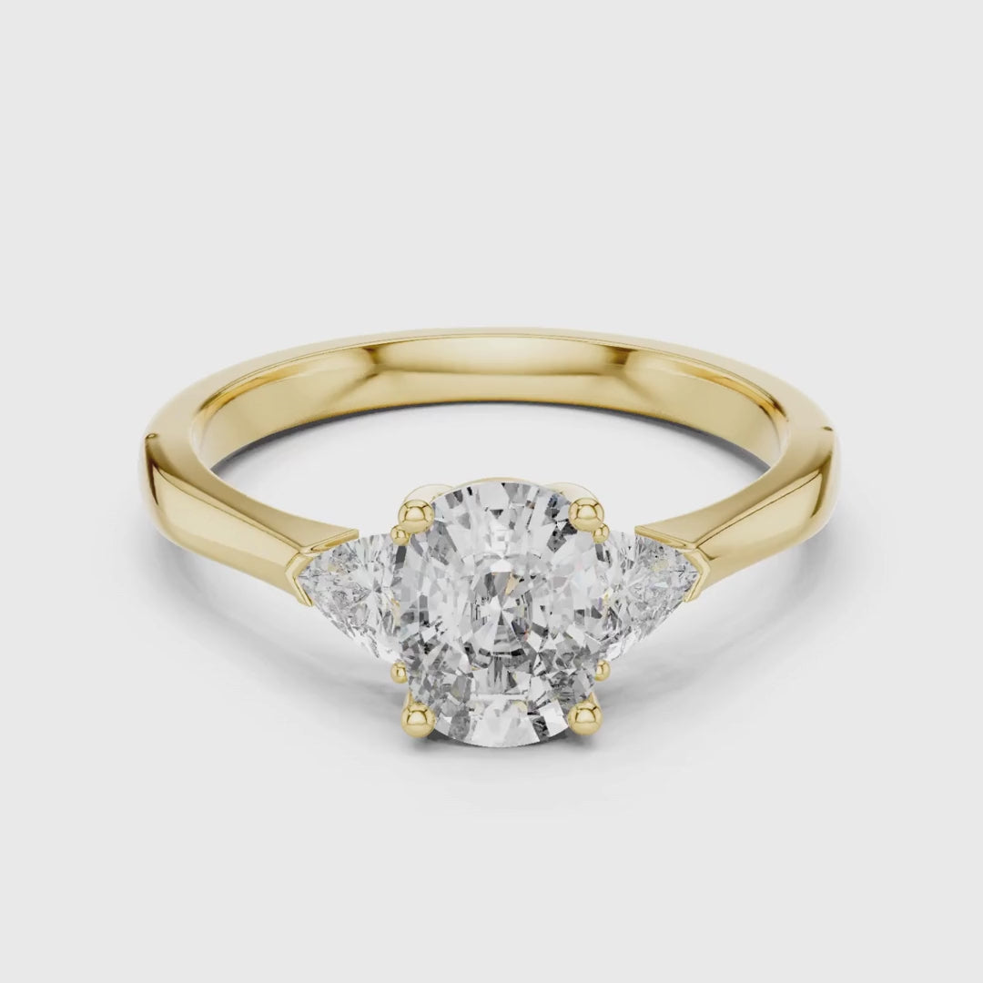 Indulge in timeless luxury with this stunning cushion-cut diamond ring set in brilliant gold. The radiant center stone is beautifully enhanced by two sparkling trillion side diamonds, creating a graceful and balanced three stone design. Known for its captivating brilliance, fire, and elongated elegance, this masterpiece is crafted for those who desire true sophistication. Perfect for engagements, anniversaries, or anyone seeking a refined luxury statement piece.