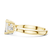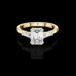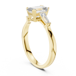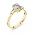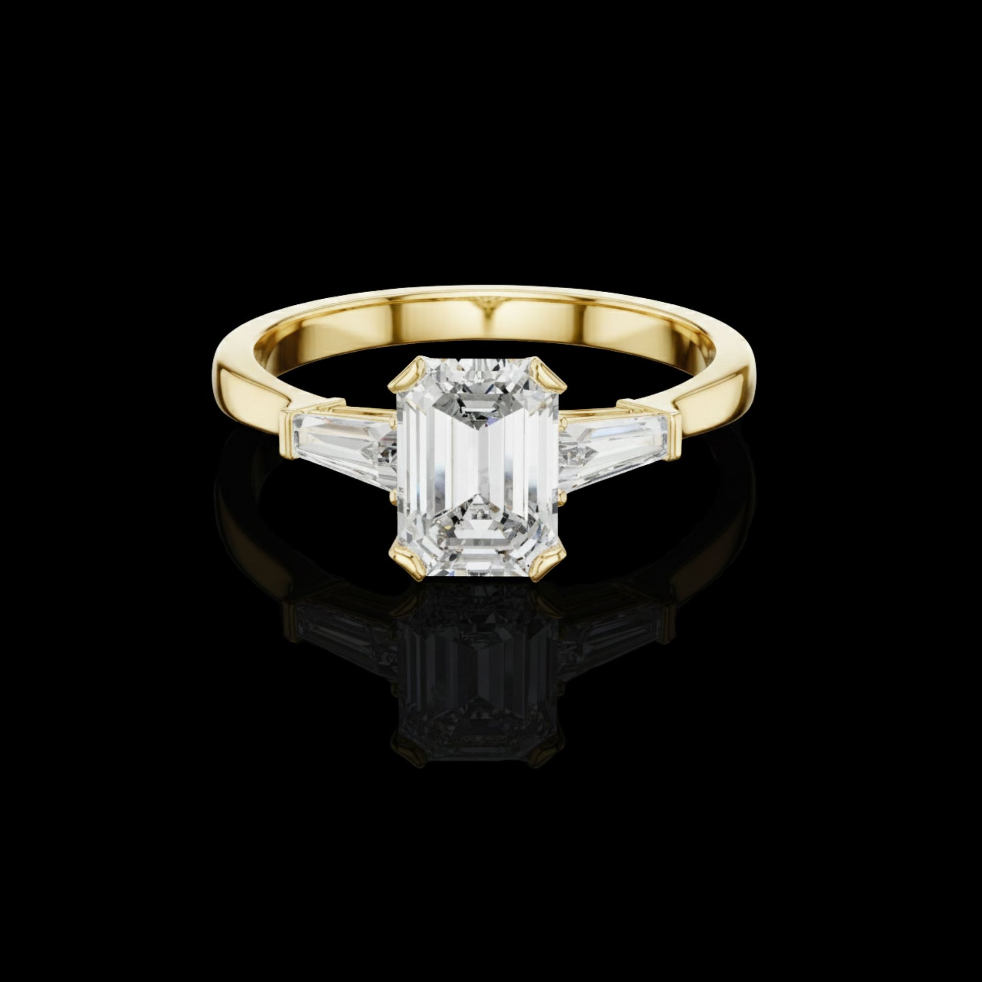This exquisite engagement ring features a stunning emerald cut center diamond flanked by two tapered baguette diamonds, all set in a polished gold band. The clean lines of the emerald cut highlight its exceptional clarity and create a timeless, sophisticated look. Perfect for someone who appreciates classic elegant design, this ring blends modern geometry with traditional luxury. Its craftsmanship and sparkle make it an enduring symbol of lasting true love.