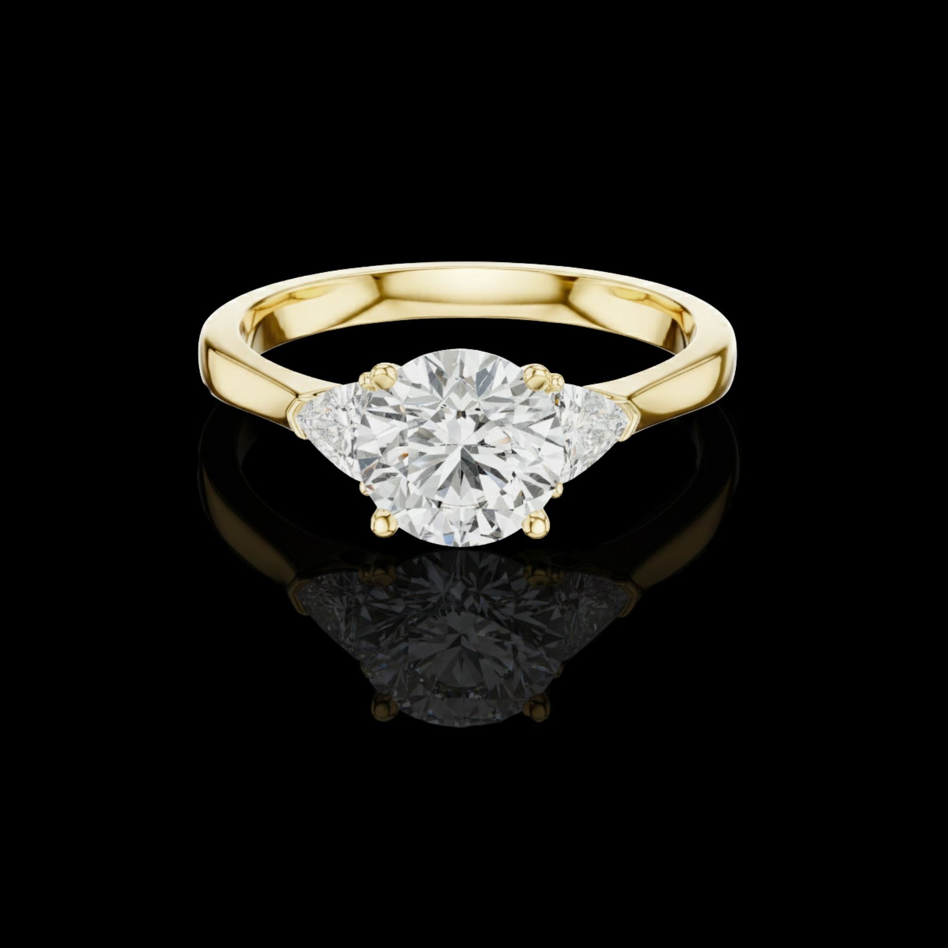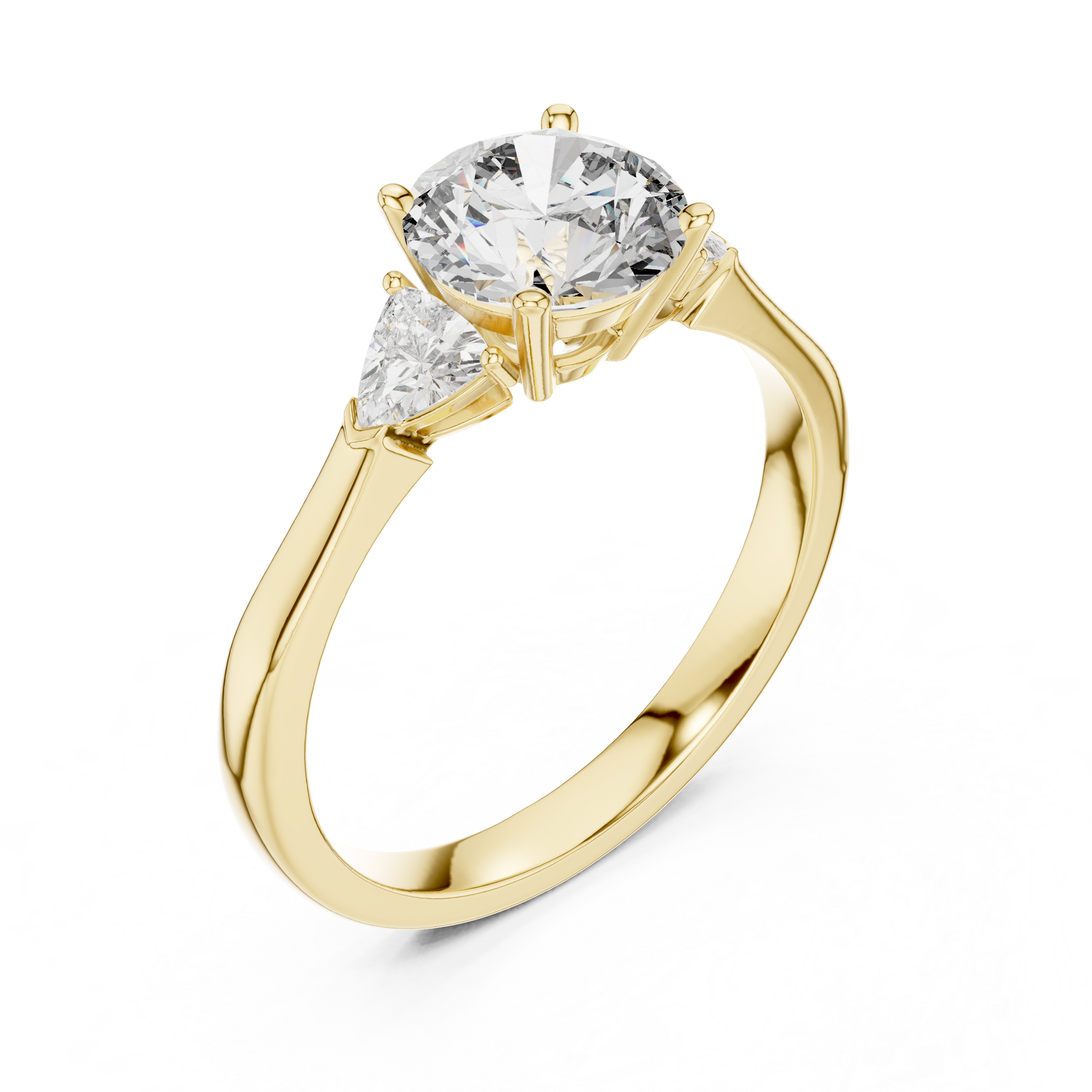 Discover timeless elegance with this stunning round brilliant diamond ring, crafted in luxurious gold. The flawless center round diamond is beautifully complemented by two sparkling trillion-cut side stones, creating a classic three-stone design symbolizing past, present, and future. Its exceptional brilliance, clarity, and hand-crafted detailing make it a must-have piece for engagements, anniversaries, or any premium jewelry collection. Designed to shine with sophistication, luxury, and unmatched sparkle.