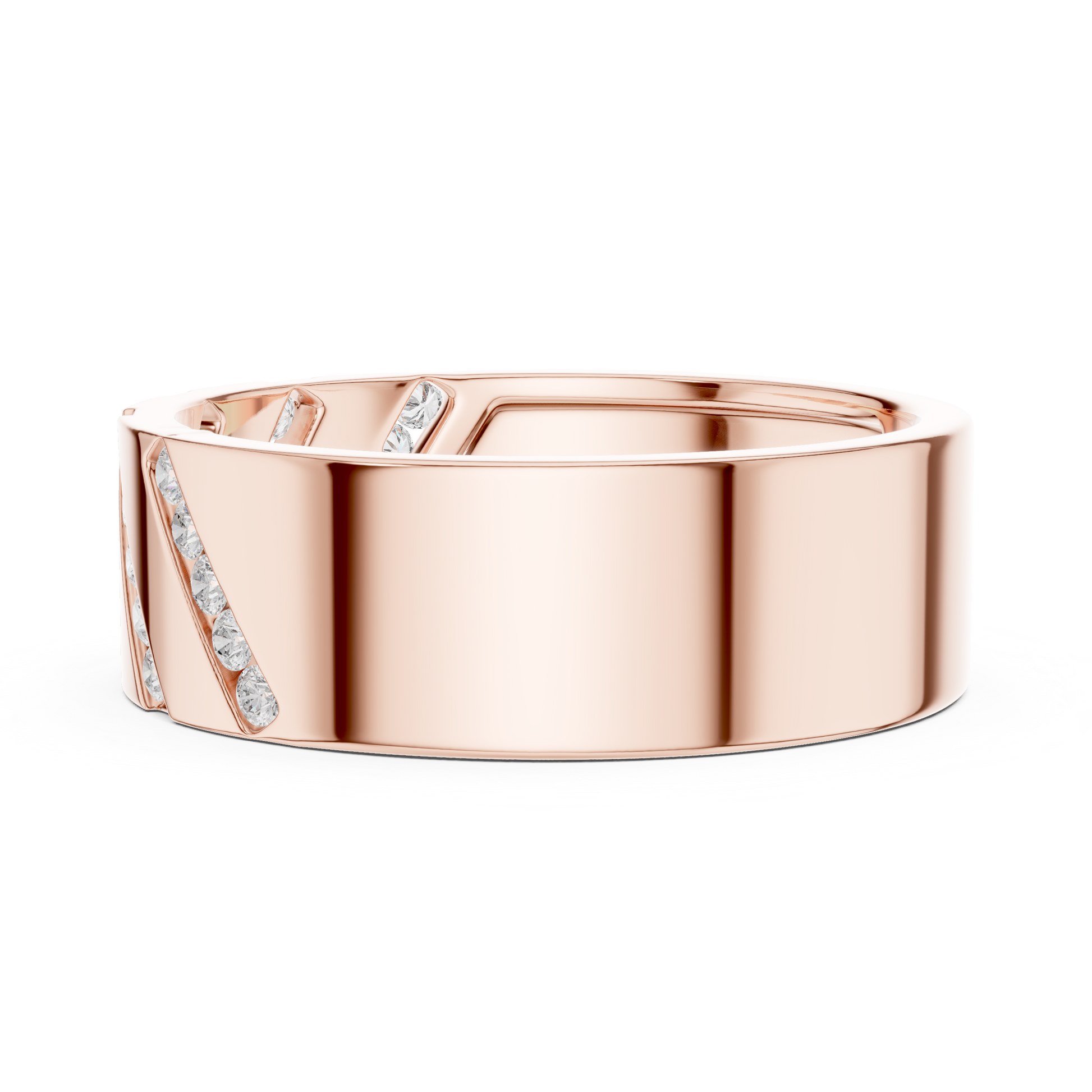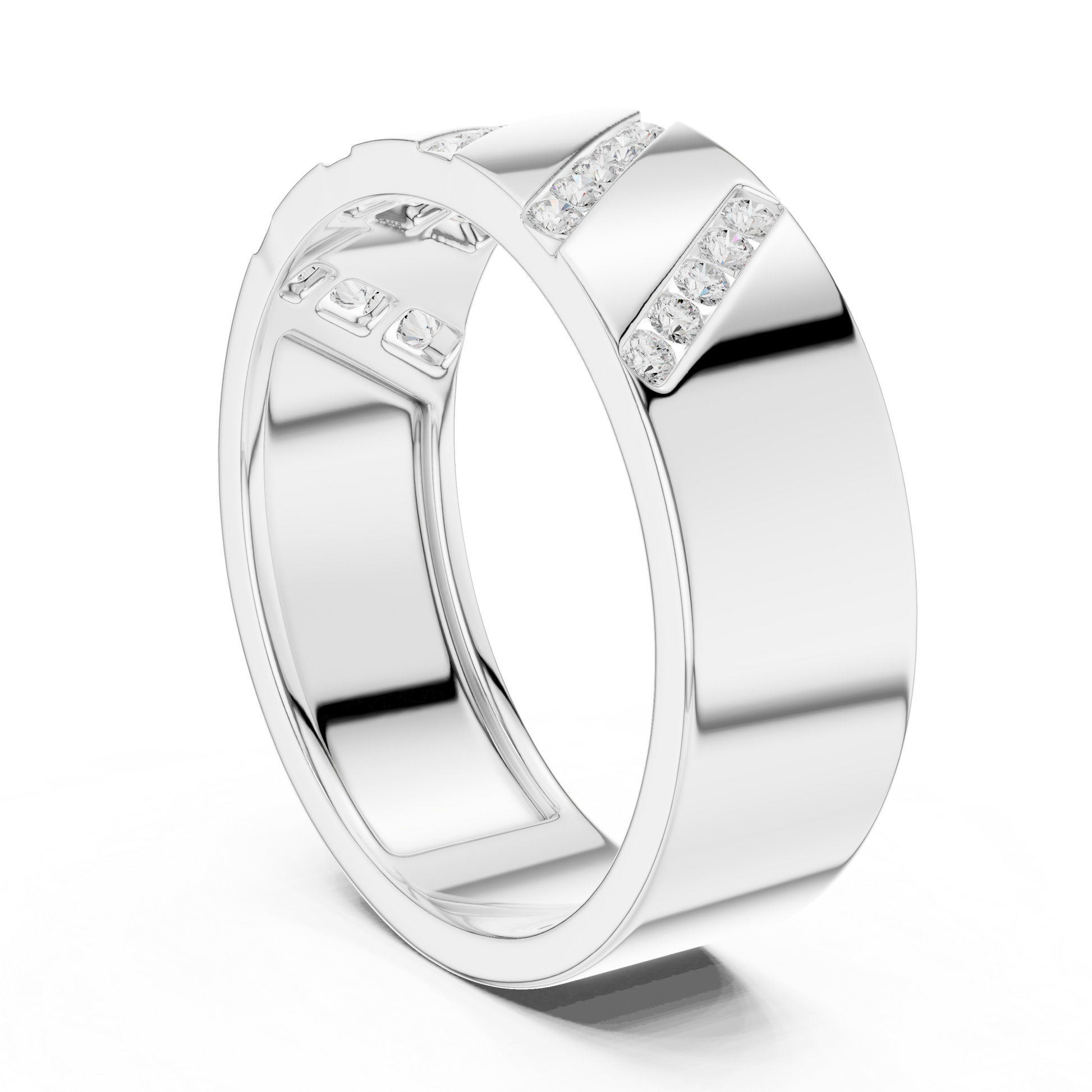 Step into refined brilliance with the Lumière Chevron Diamond Band, a striking expression of modern sophistication. Crafted in high, this bold band is adorned with precision-set diagonal diamond inlays, creating a dynamic chevron Round Diamond pattern that captures light from every angle.The wide silhouette and clean architectural lines give this ring a powerful yet refined presence, making it ideal as a luxury wedding band, statement ring, or signature everyday piece.