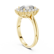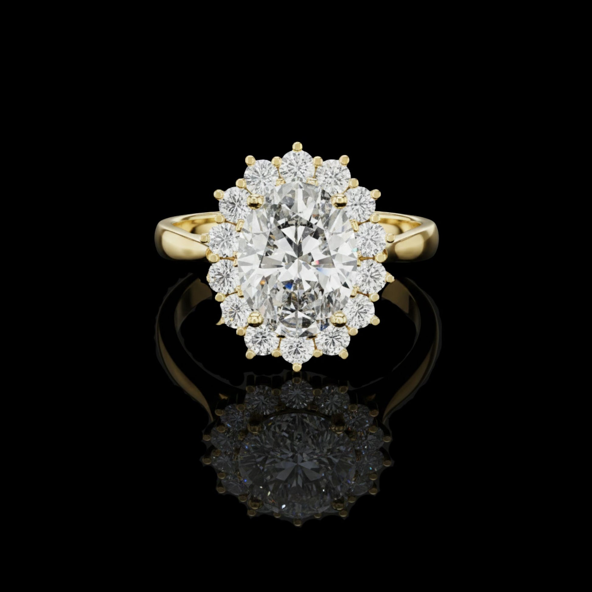 This stunning ring showcases an oval-cut diamond at its center, surrounded by a oval halo of brilliant round diamonds that enhance its sparkle and presence. Set in a sleek gold band, the design blends timeless elegance with luxurious craftsmanship. Perfect for marking a special moment, this piece delivers exceptional brilliance, sophistication, and refined beauty.