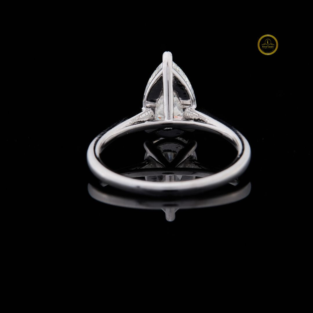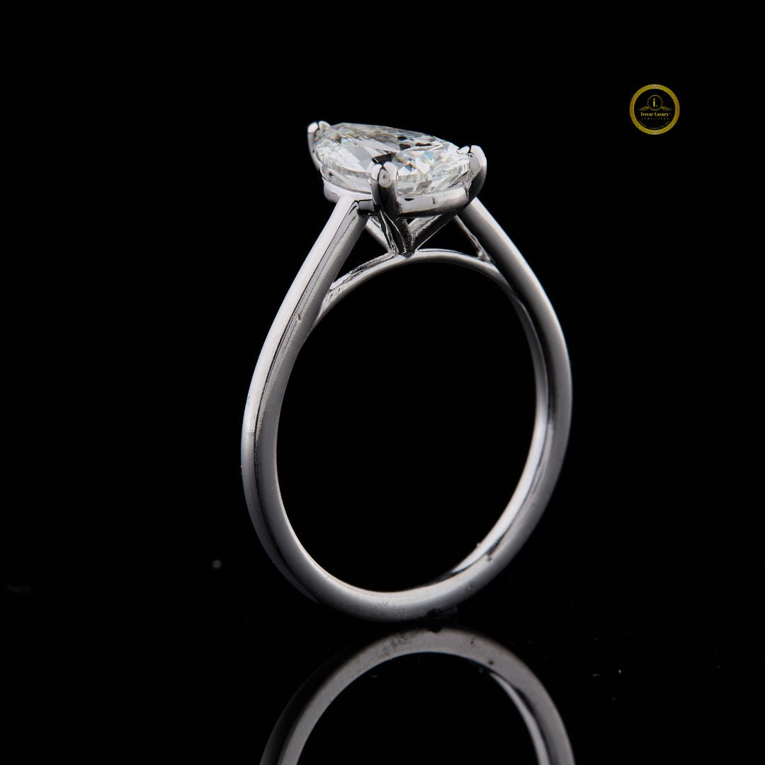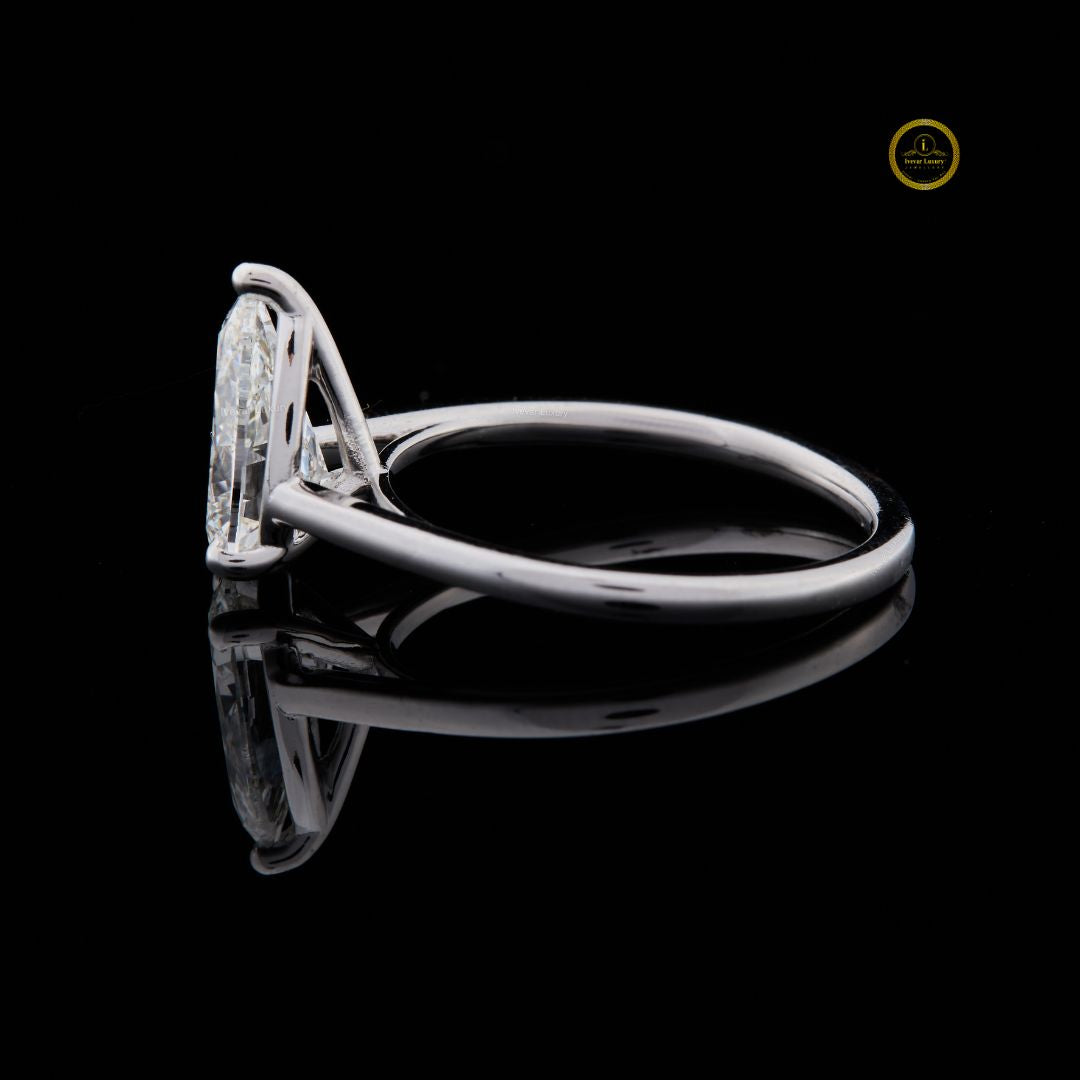 This striking ring showcases a brilliantly cut pear-shaped diamond set in a refined, minimalist band that highlights the stone’s exceptional clarity and sparkle. The secure three-prong setting elevates the diamond, allowing maximum light to reflect through its facets for a dazzling, luminous effect. With its clean lines and modern elegance, this piece embodies timeless sophistication—perfect for someone who appreciates both simplicity and extraordinary brilliance.