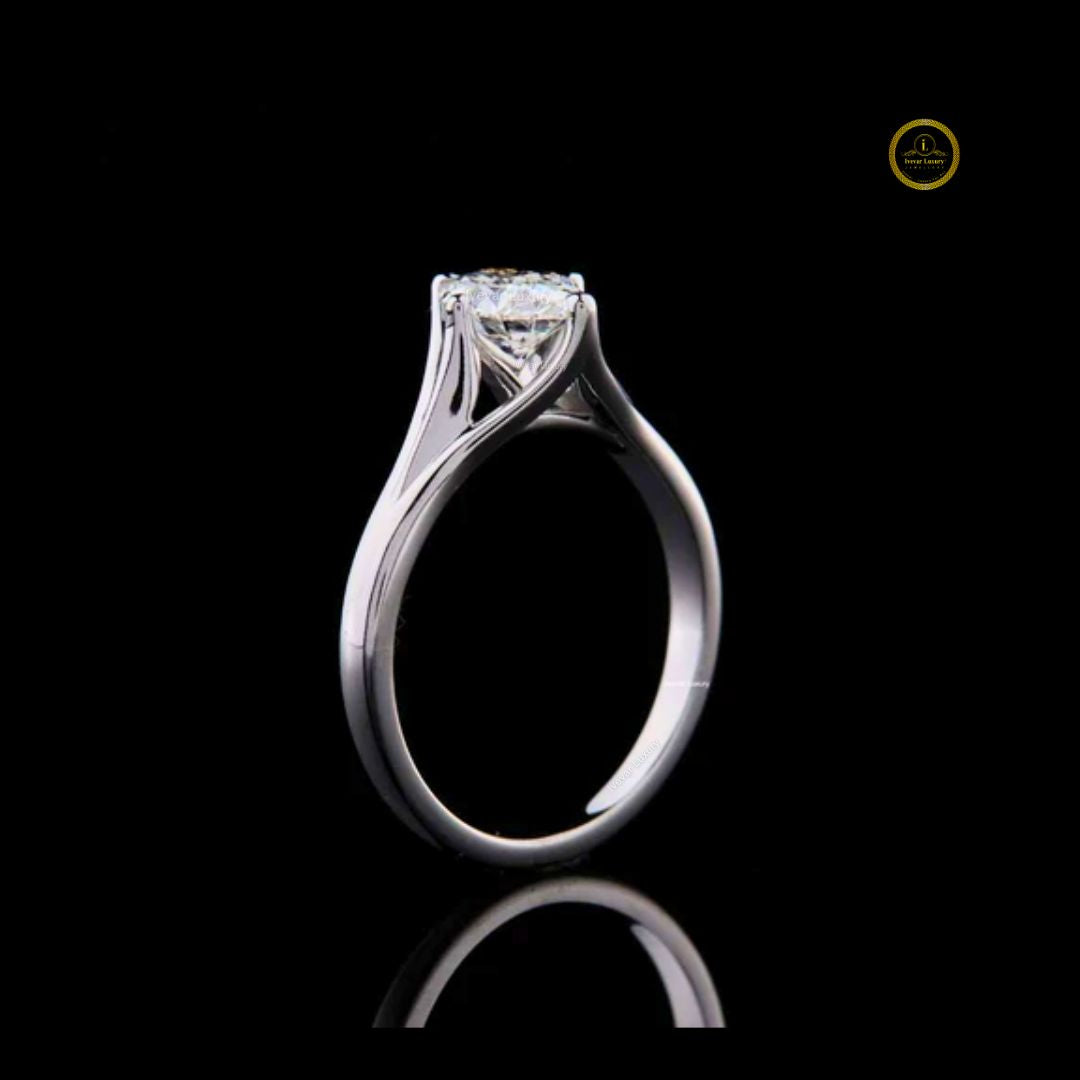This stunning solitaire ring features a captivating Oval-cut diamond set securely within a sleek, polished band. The unique setting style elegantly frames the elongated diamond, emphasizing its brilliant sparkle and sophisticated shape.The metal band, possibly white gold or platinum, has a modern design with subtle, stylized shoulders that draw the eye toward the central stone. This piece is a perfect blend of classic elegance and contemporary flair, making it an ideal choice for an engagement ring or a timeless statement accessory by Ivevar.