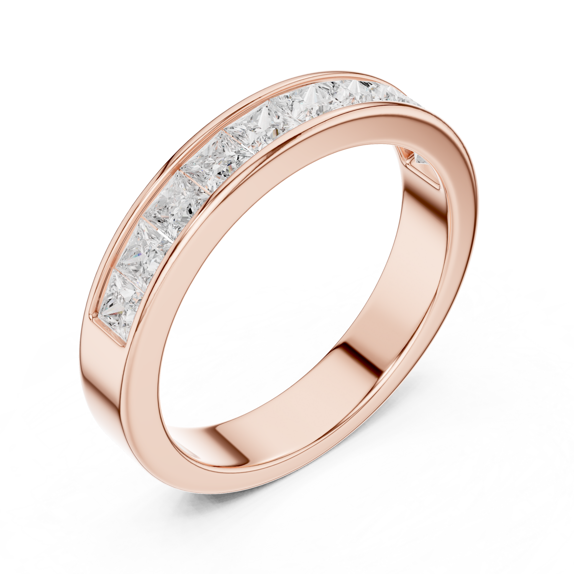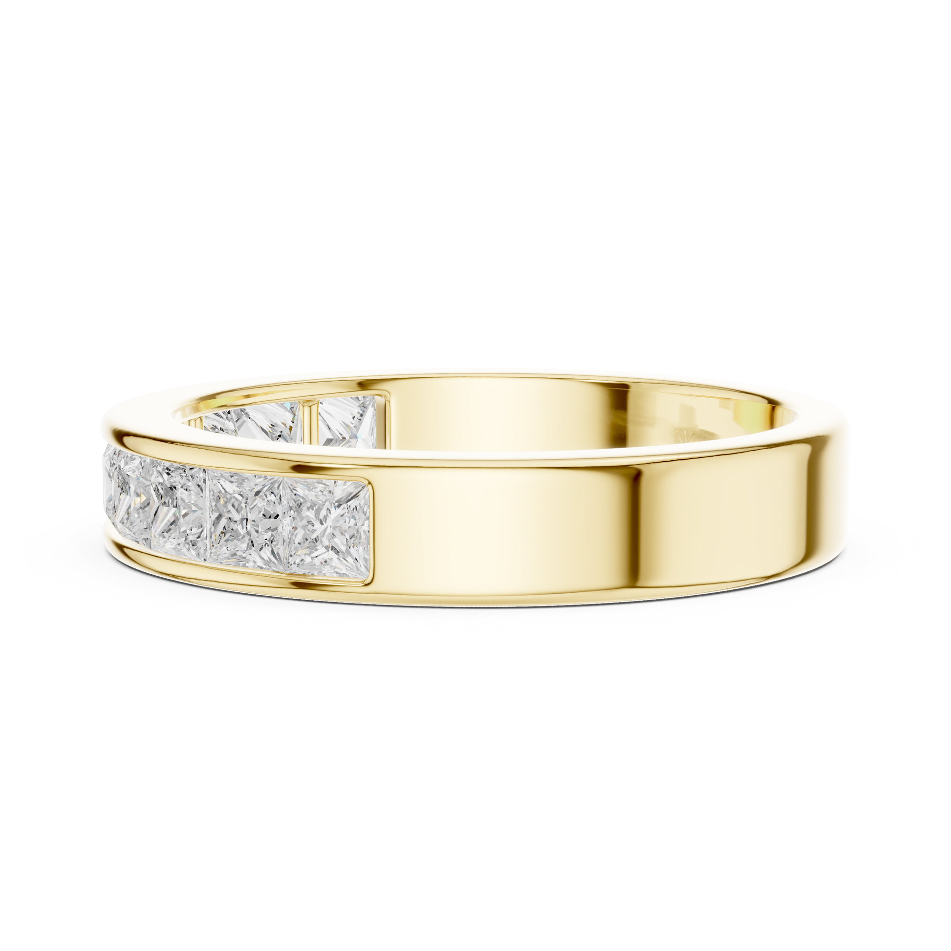 This refined channel-set diamond band from Ivevar Luxury is crafted in rich gold and showcases a seamless row of princess-cut diamonds for a bold yet elegant look. The clean, modern profile highlights precision craftsmanship while offering exceptional comfort for everyday wear. Designed with a smooth interior and secure channel setting, this ring balances durability with timeless sophistication.