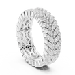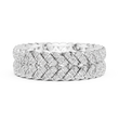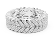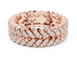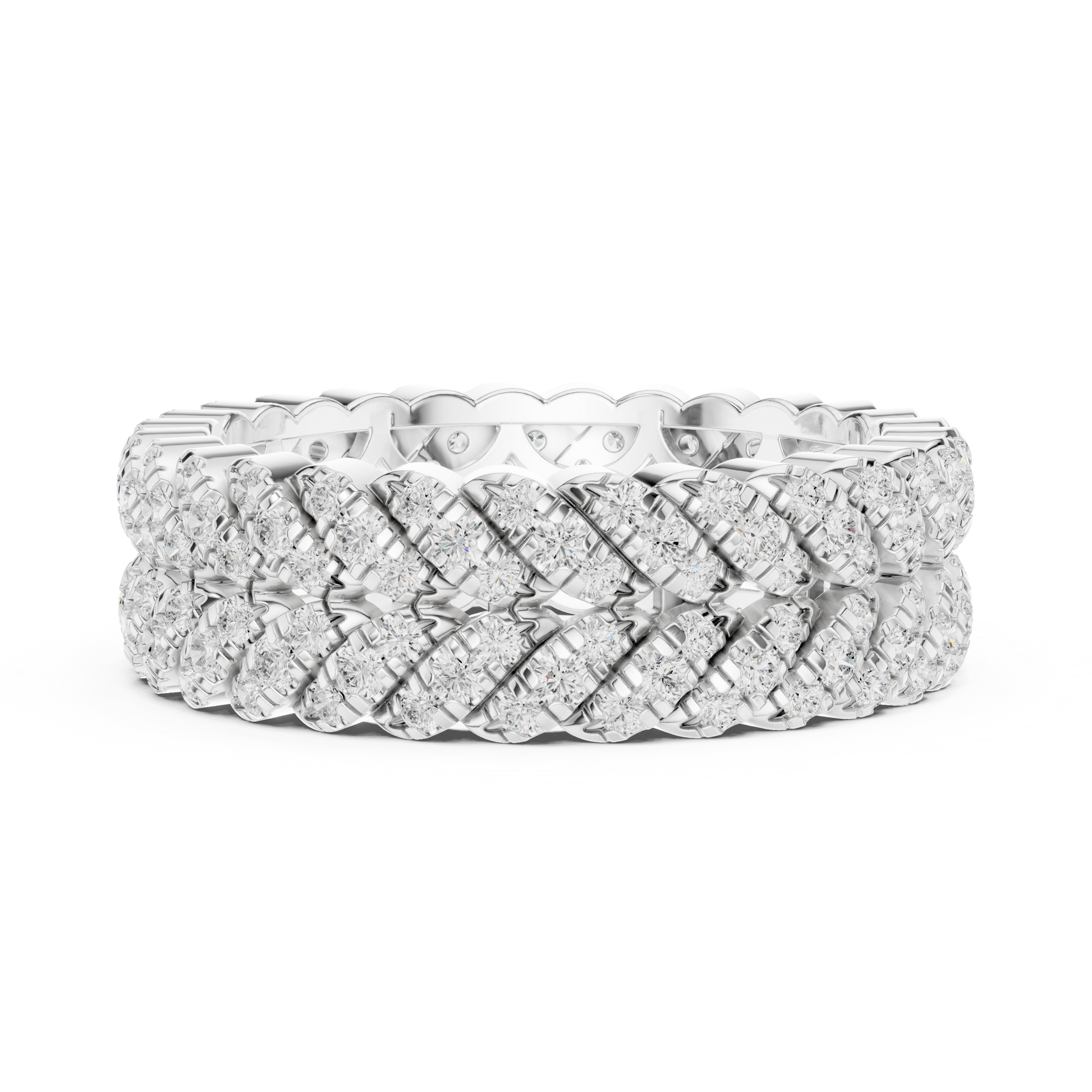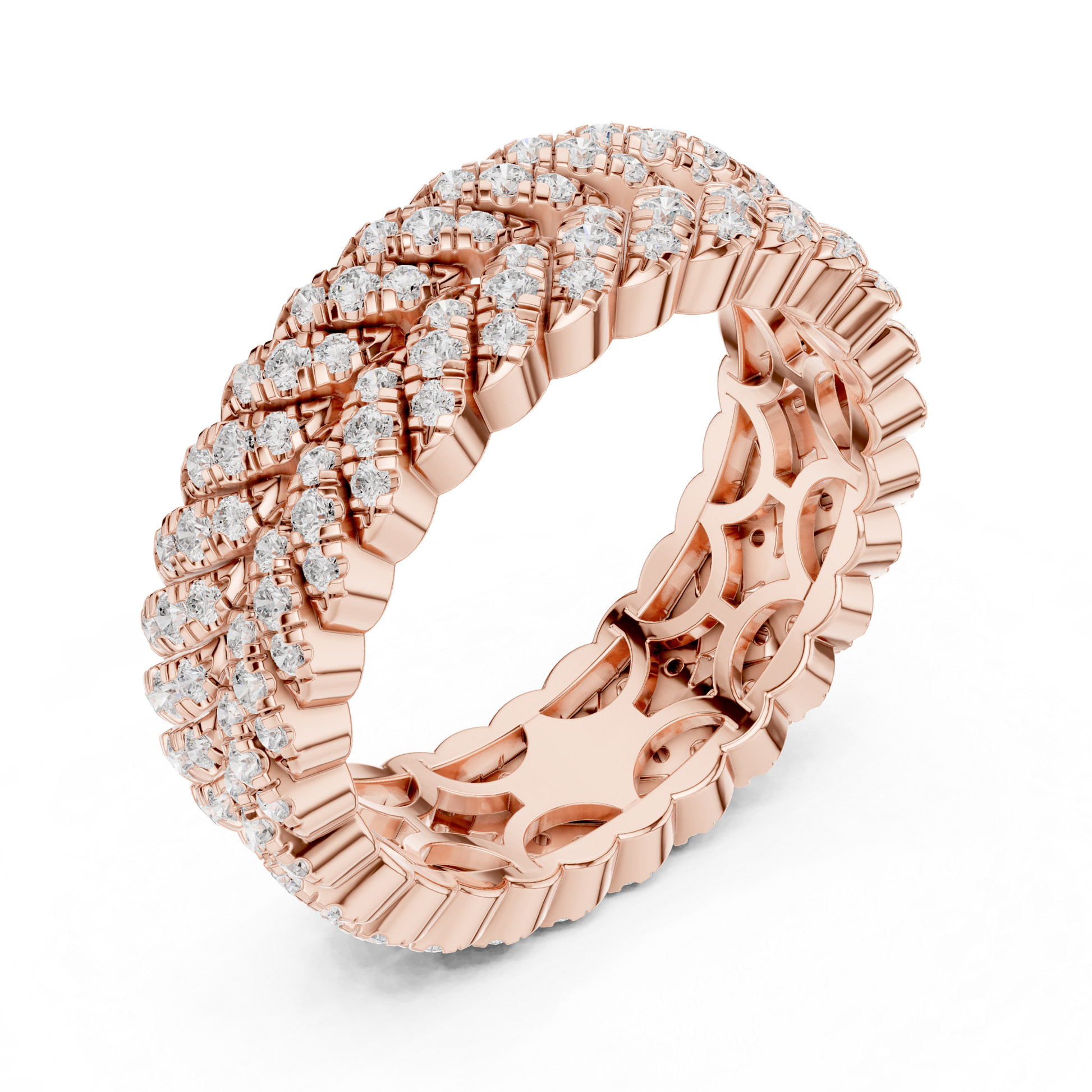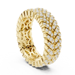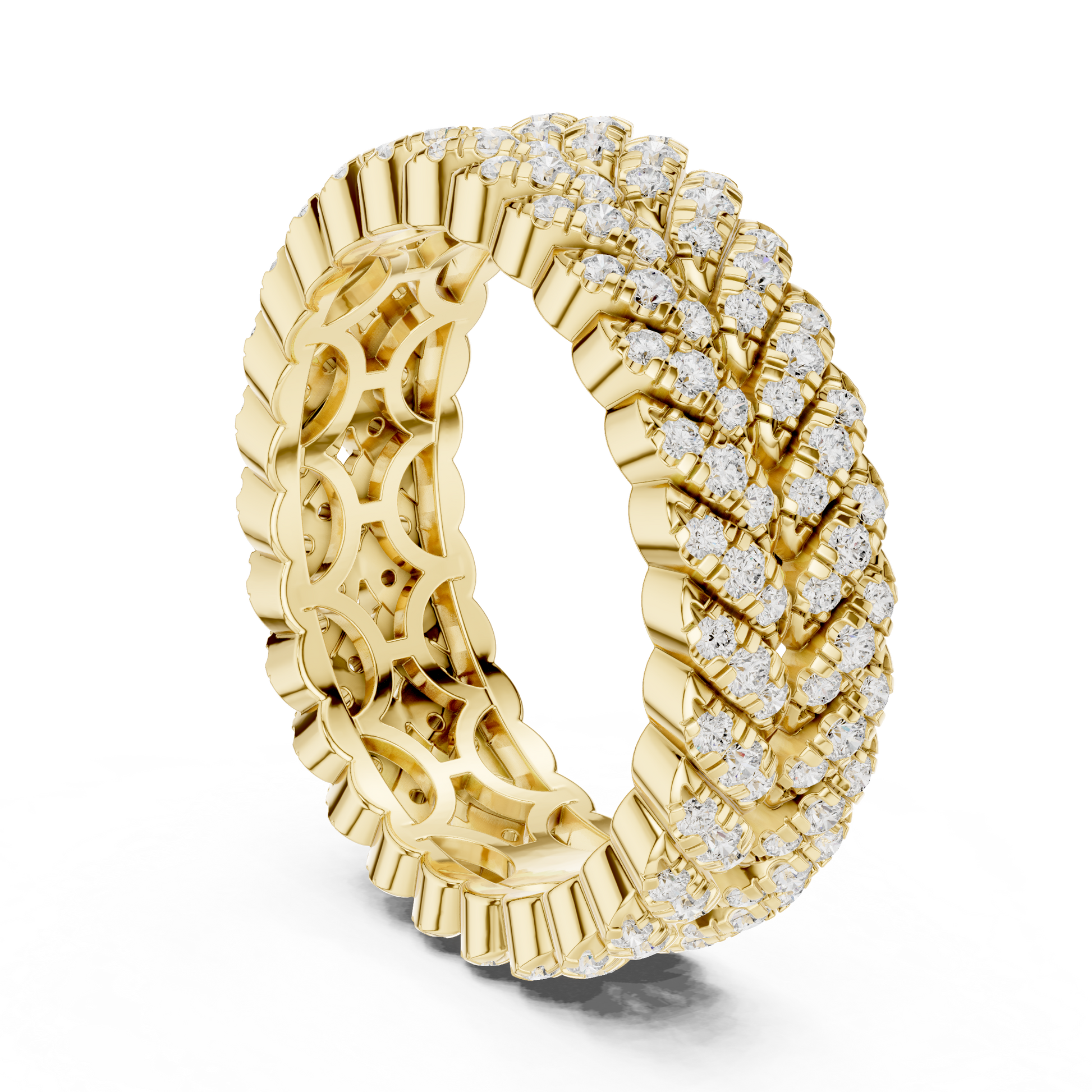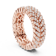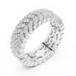 This bold luxury eternity band features multiple rows of round brilliant diamonds intricately woven into a rich gold framework. The layered prong setting creates depth, dimension, and intense sparkle from every angle, while the wide profile delivers a powerful statement of elegance and prestige. Designed for those who appreciate dramatic fine jewelry, this ring is ideal as an anniversary band, statement wedding ring, or luxury fashion piece.