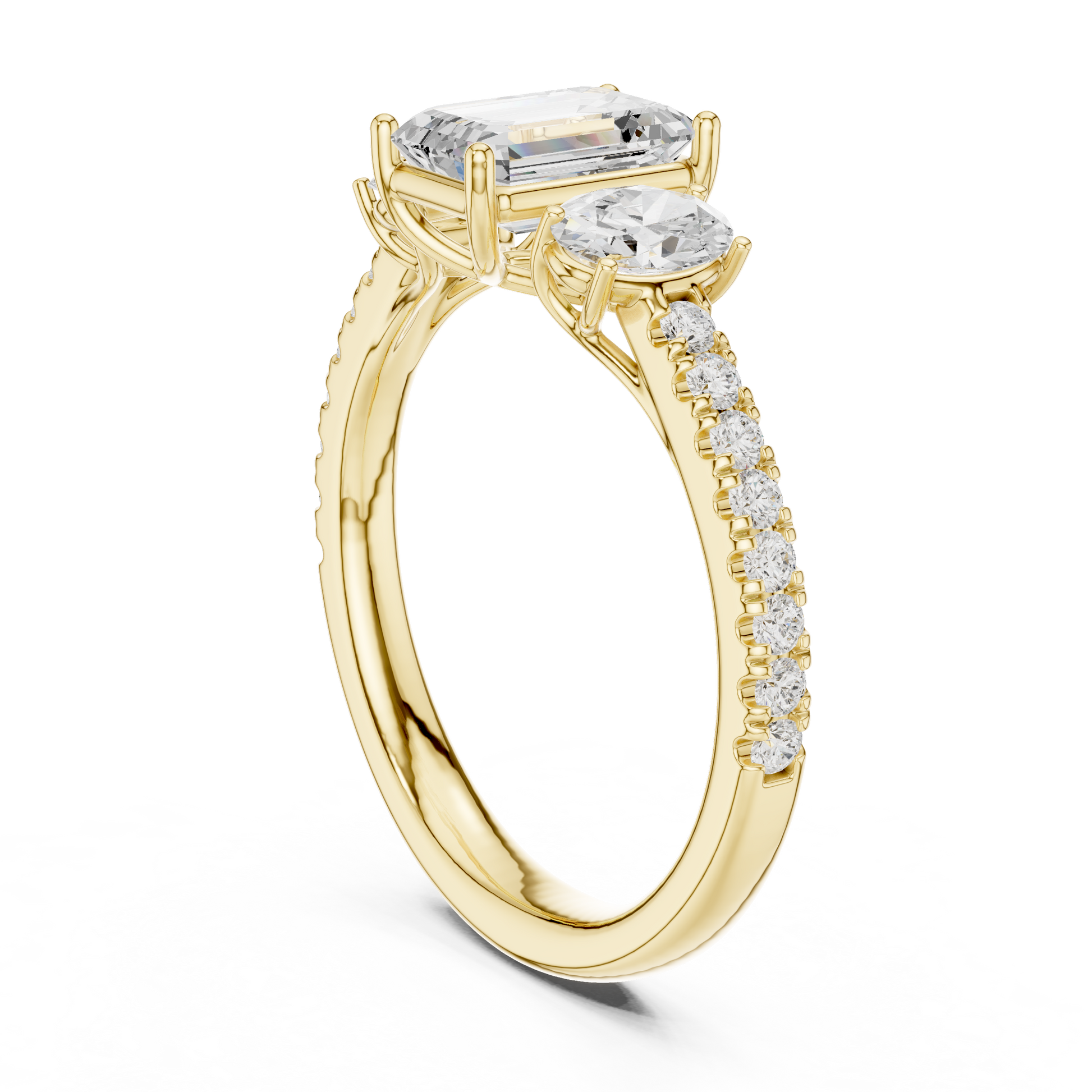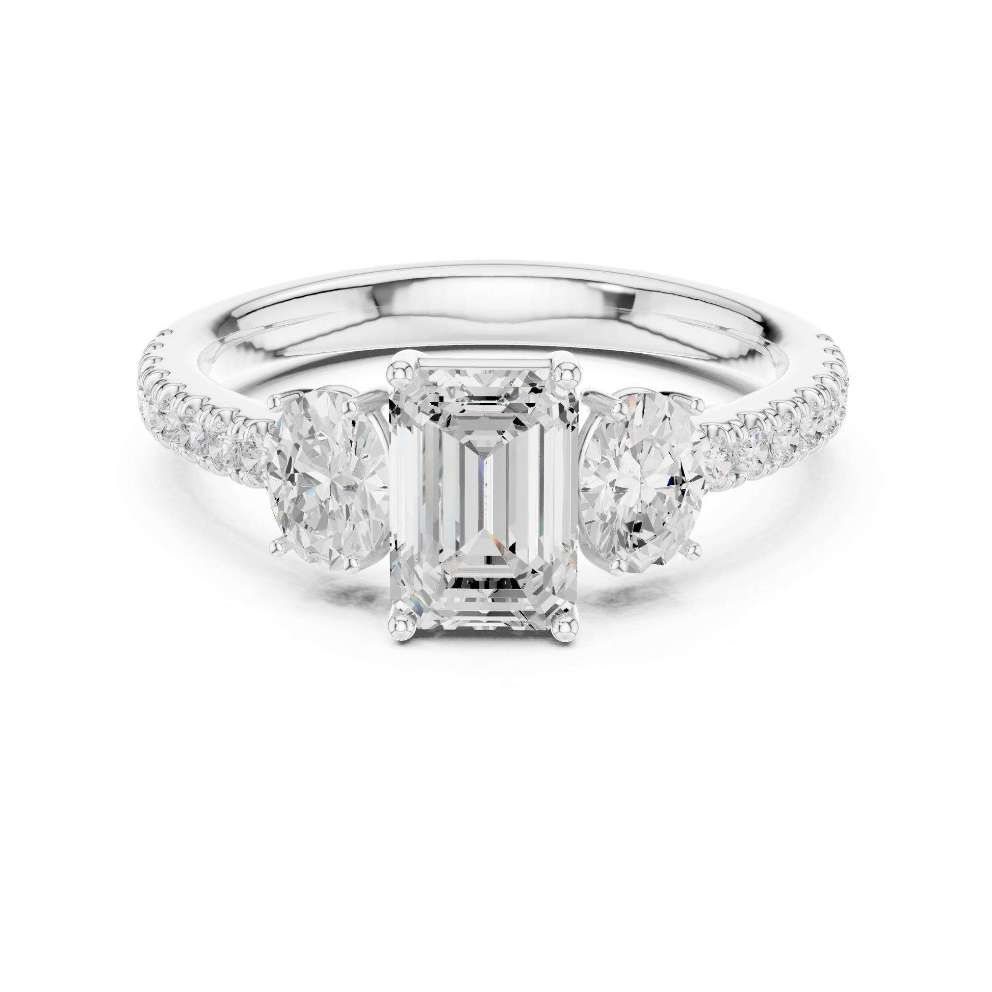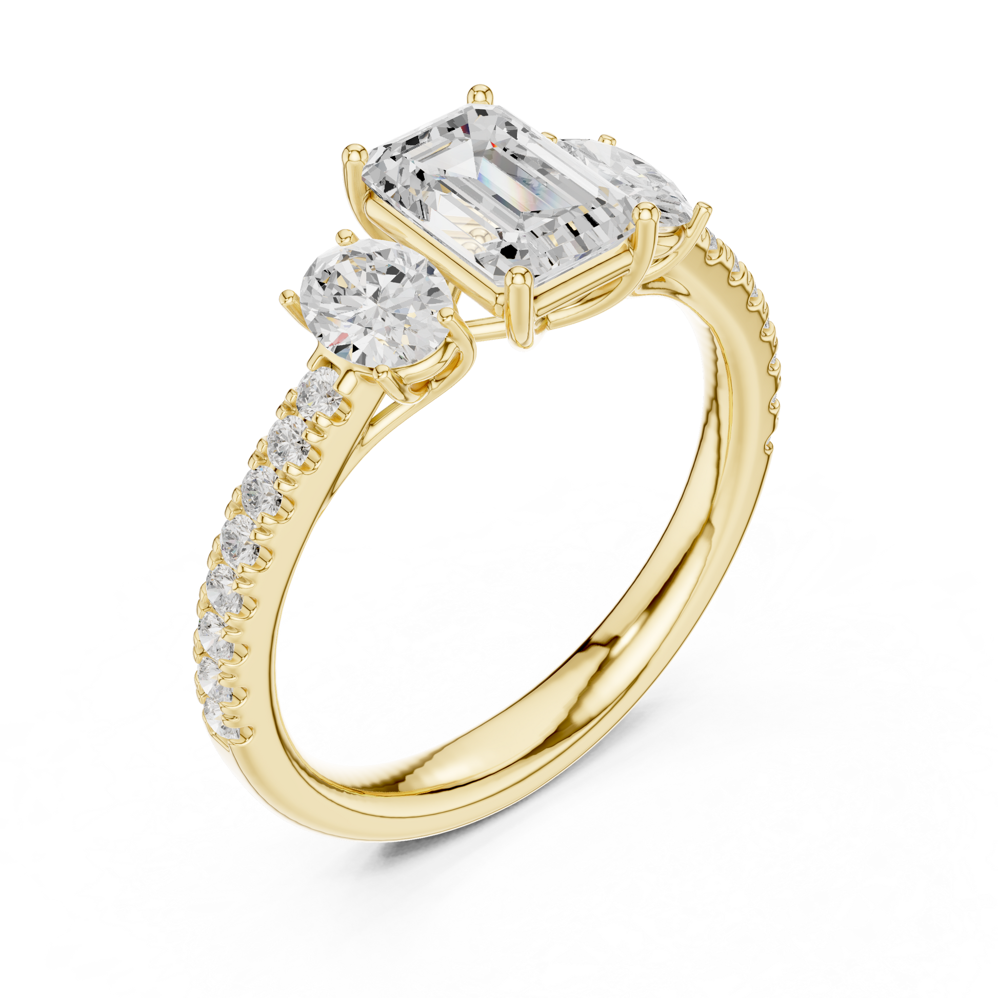 This exquisite three-stone engagement ring features a bold emerald-cut center diamond paired with two brilliant oval side stones, creating a perfect balance of elegance and sparkle. The yellow gold band is accented with a shimmering pave setting, adding extra radiance and luxury. Designed to symbolize the past, present, and future, this ring blends timeless craftsmanship with modern brilliance—ideal for engagements, anniversaries, or a refined statement piece.