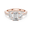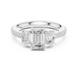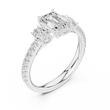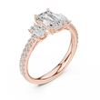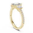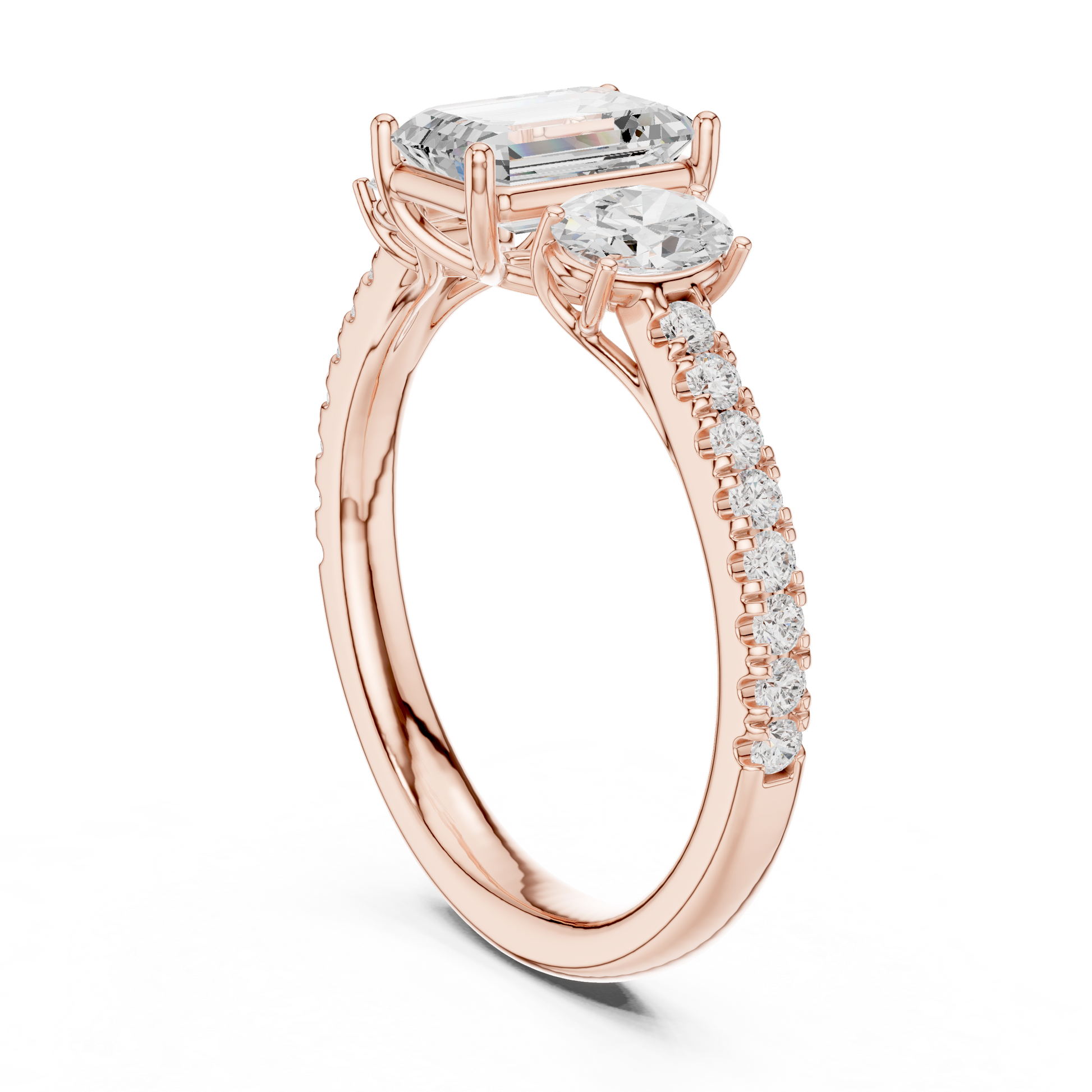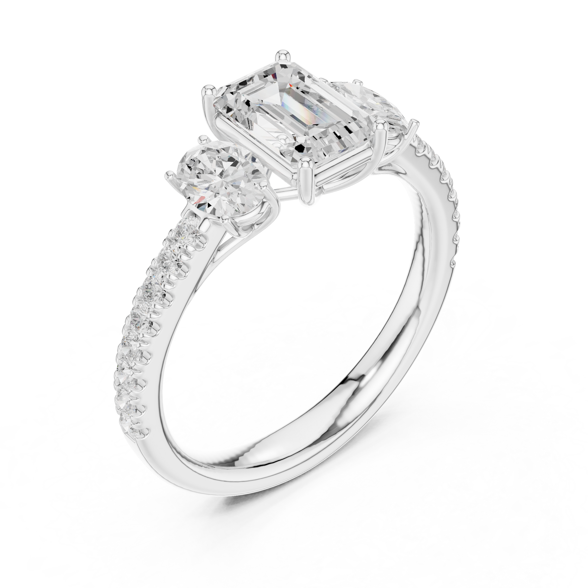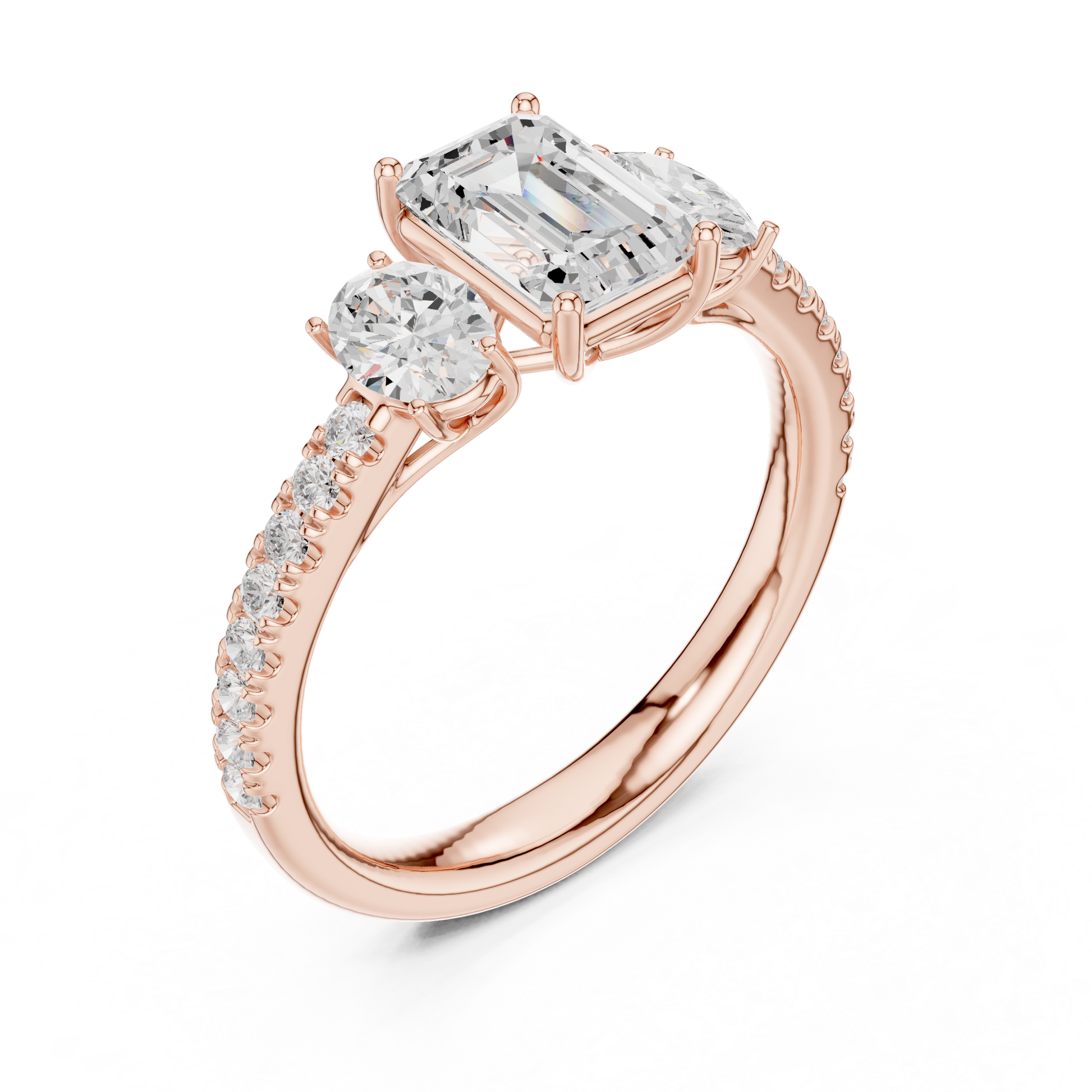 This exquisite three-stone engagement ring features a bold emerald-cut center diamond paired with two brilliant oval side stones, creating a perfect balance of elegance and sparkle. The yellow gold band is accented with a shimmering pave setting, adding extra radiance and luxury. Designed to symbolize the past, present, and future, this ring blends timeless craftsmanship with modern brilliance—ideal for engagements, anniversaries, or a refined statement piece.