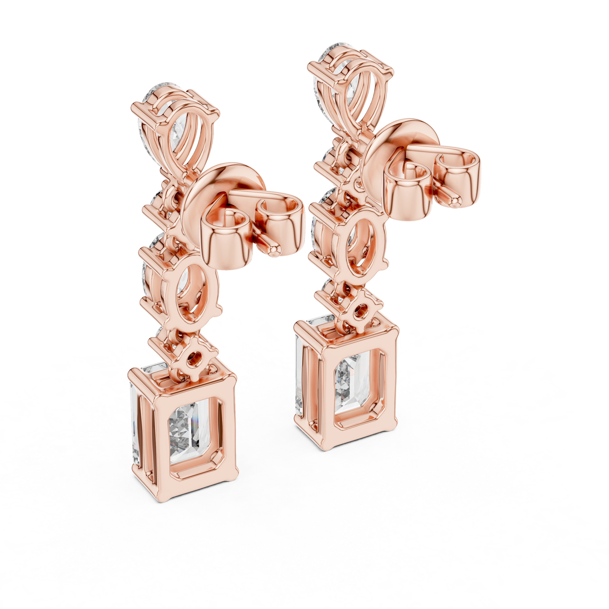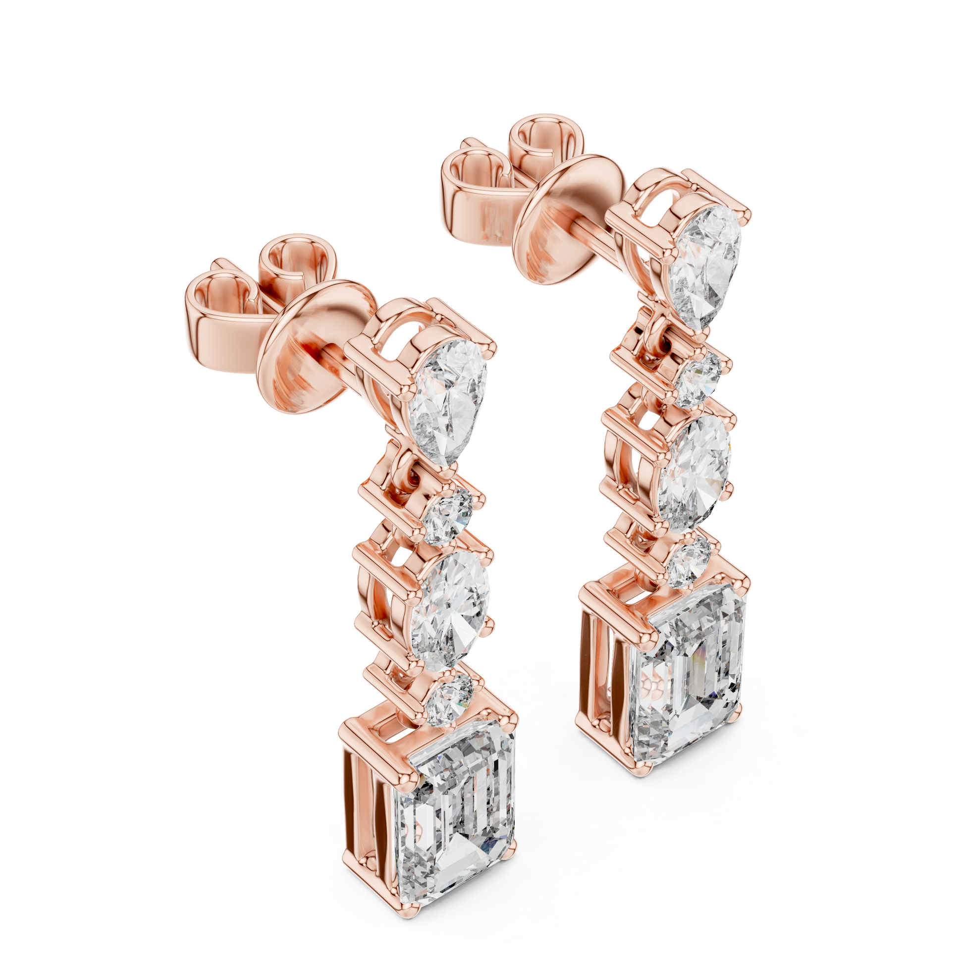 The Regal Lineage Diamond Drop Earrings embody elegance through a beautifully balanced vertical arrangement of mixed diamond cuts. Beginning with a pear-cut diamond stud, the design flows through round and oval diamonds, culminating in a striking emerald-cut diamond drop that delivers clean lines and exceptional clarity.Crafted in high each diamond is secured in refined prong settings that allow maximum light to enhance brilliance and depth. Ideal for formal evenings, bridal wear, or luxury statement styling, these earrings reflect heritage-inspired sophistication, modern craftsmanship, and enduring beauty.