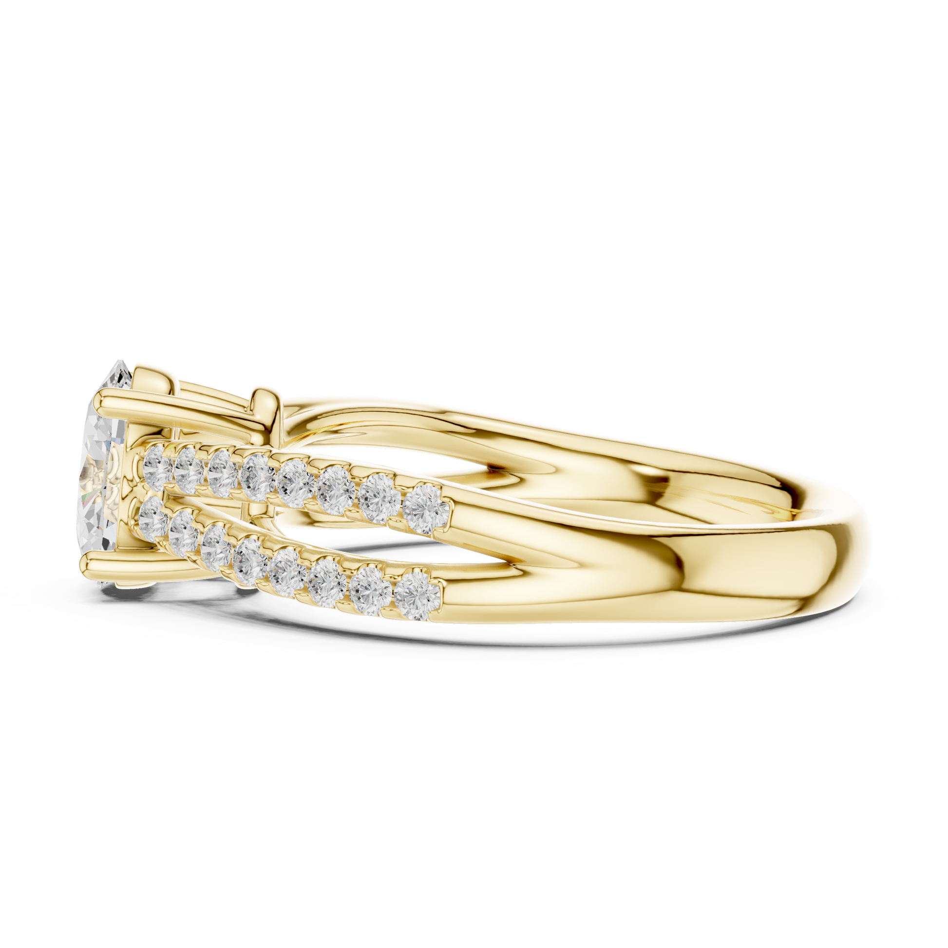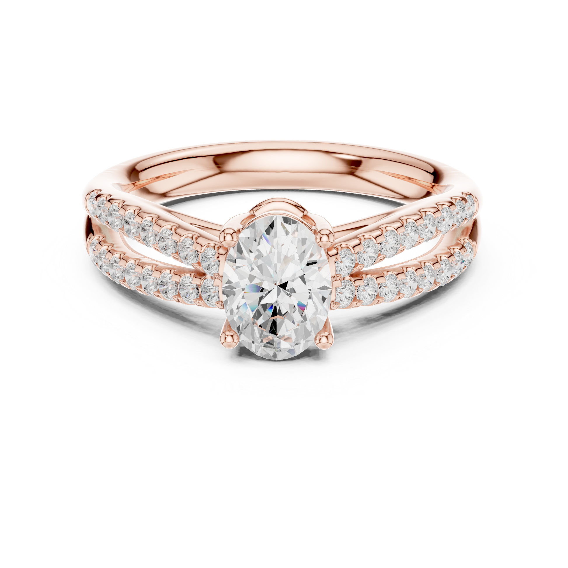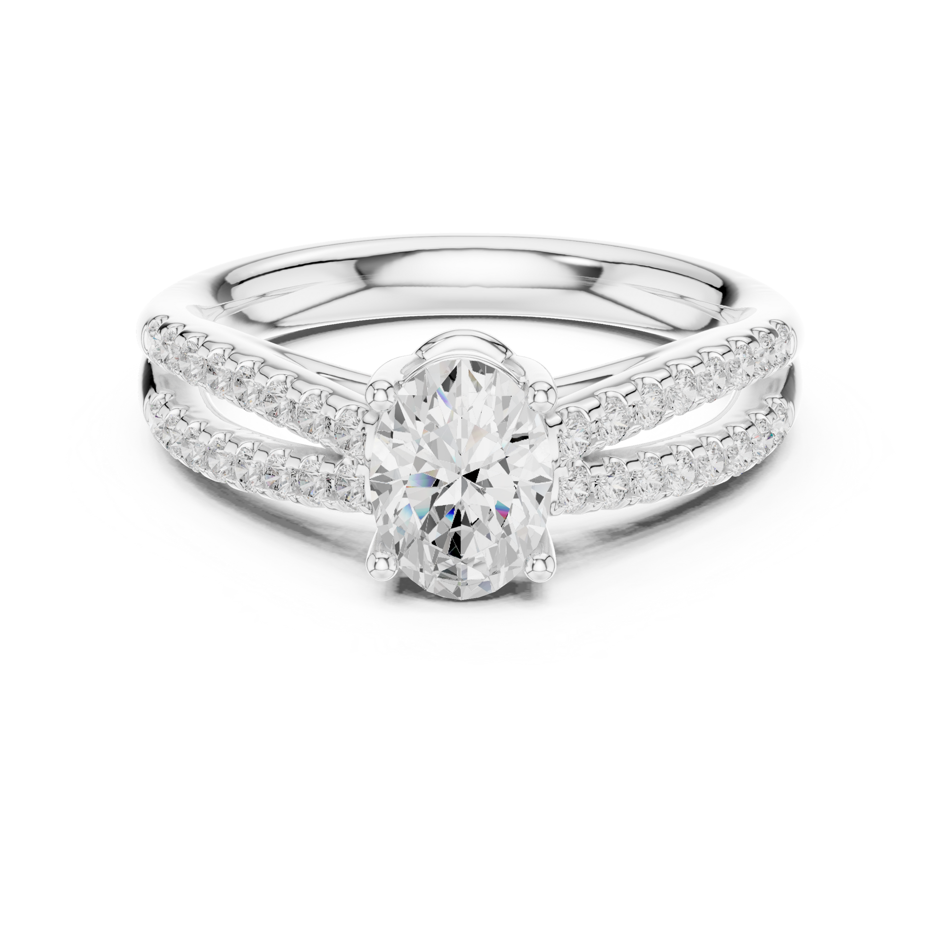 A masterpiece of refined brilliance, this oval cut engagement ring features a captivating oval-shaped center diamond set atop a graceful split-shank band adorned with pavé-set diamonds. Crafted in radiant gold, the design creates a harmonious balance of fluid curves and shimmering detail—highlighting the oval cut’s elongated silhouette while adding luxurious sparkle along the sides. Modern yet timeless, this ring delivers an elevated elegance that feels sophisticated, iconic, and effortlessly breathtaking.