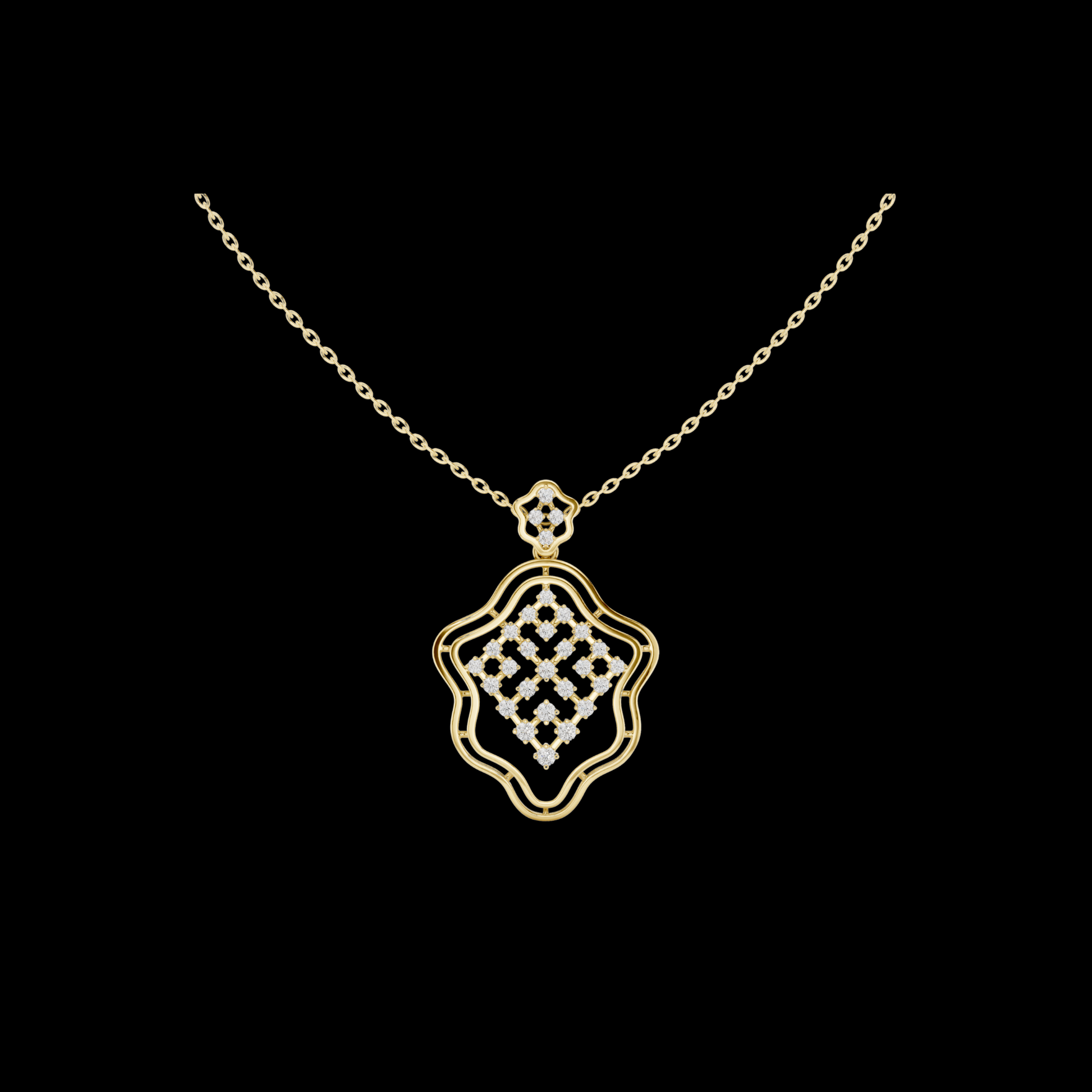 This refined pendant from IVEVAR LUXURY showcases a graceful quatrefoil-inspired silhouette, highlighted with a delicate diamond lattice centerpiece. The open-frame design creates a light, elegant presence, while the diamond-accented bail adds a subtle touch of brilliance. this pendant transitions beautifully from everyday wear to special occasions.