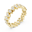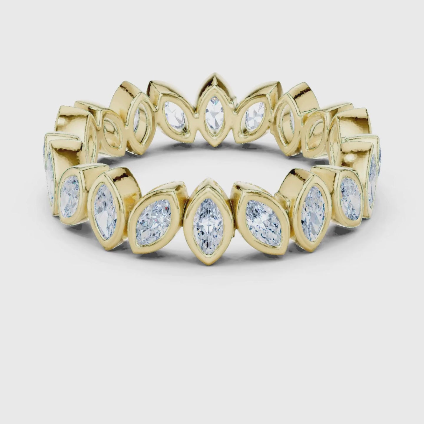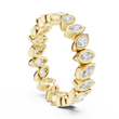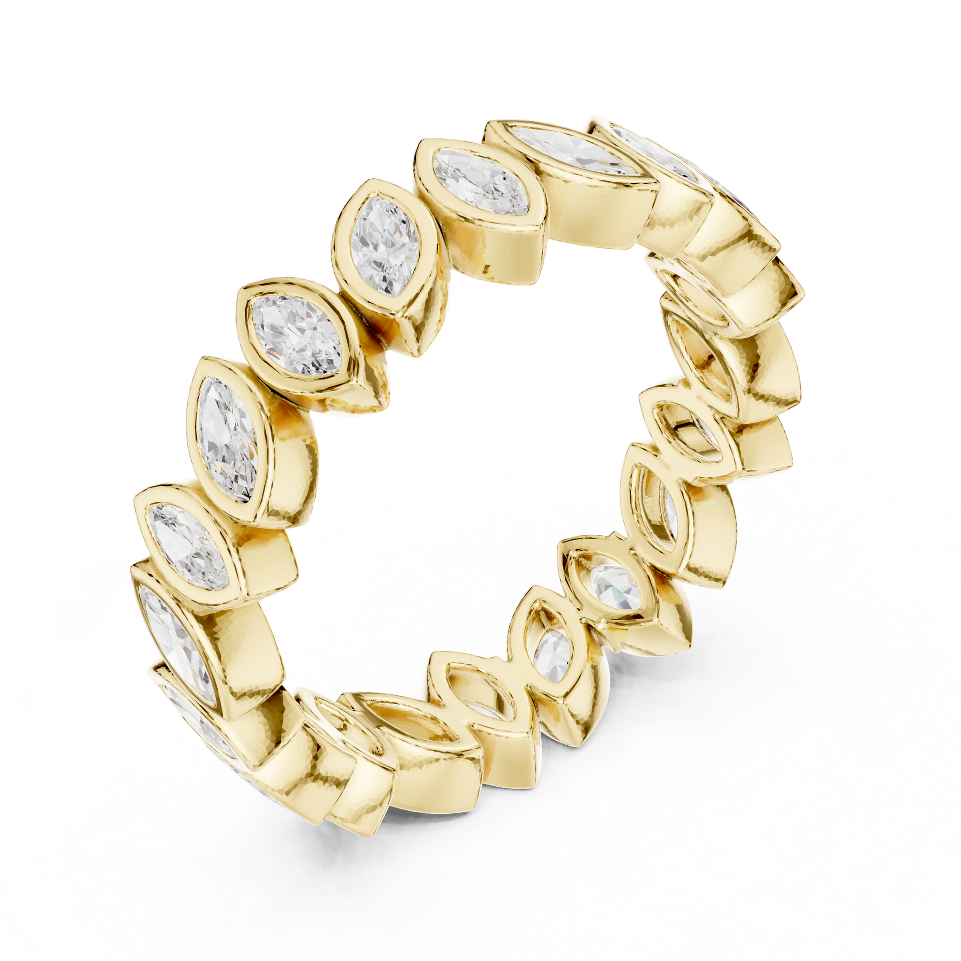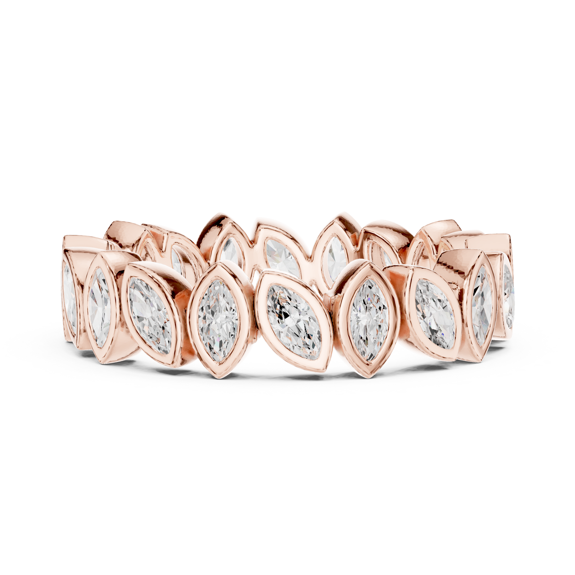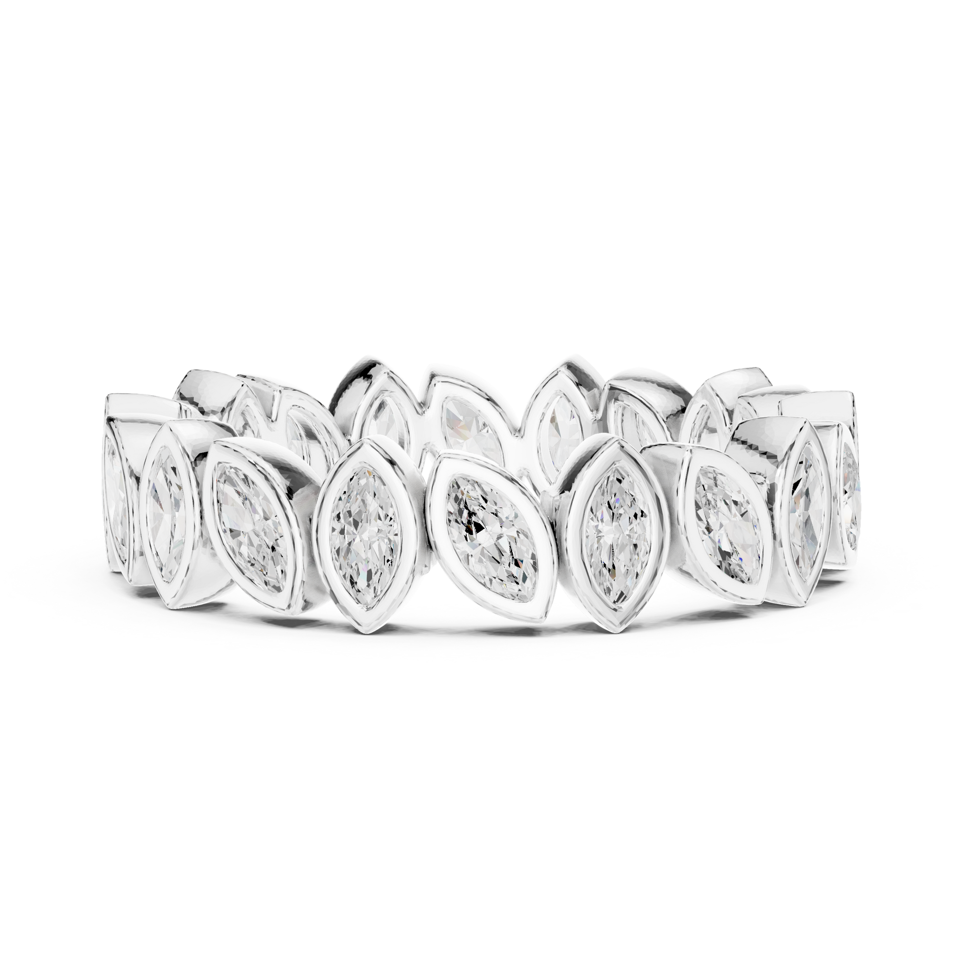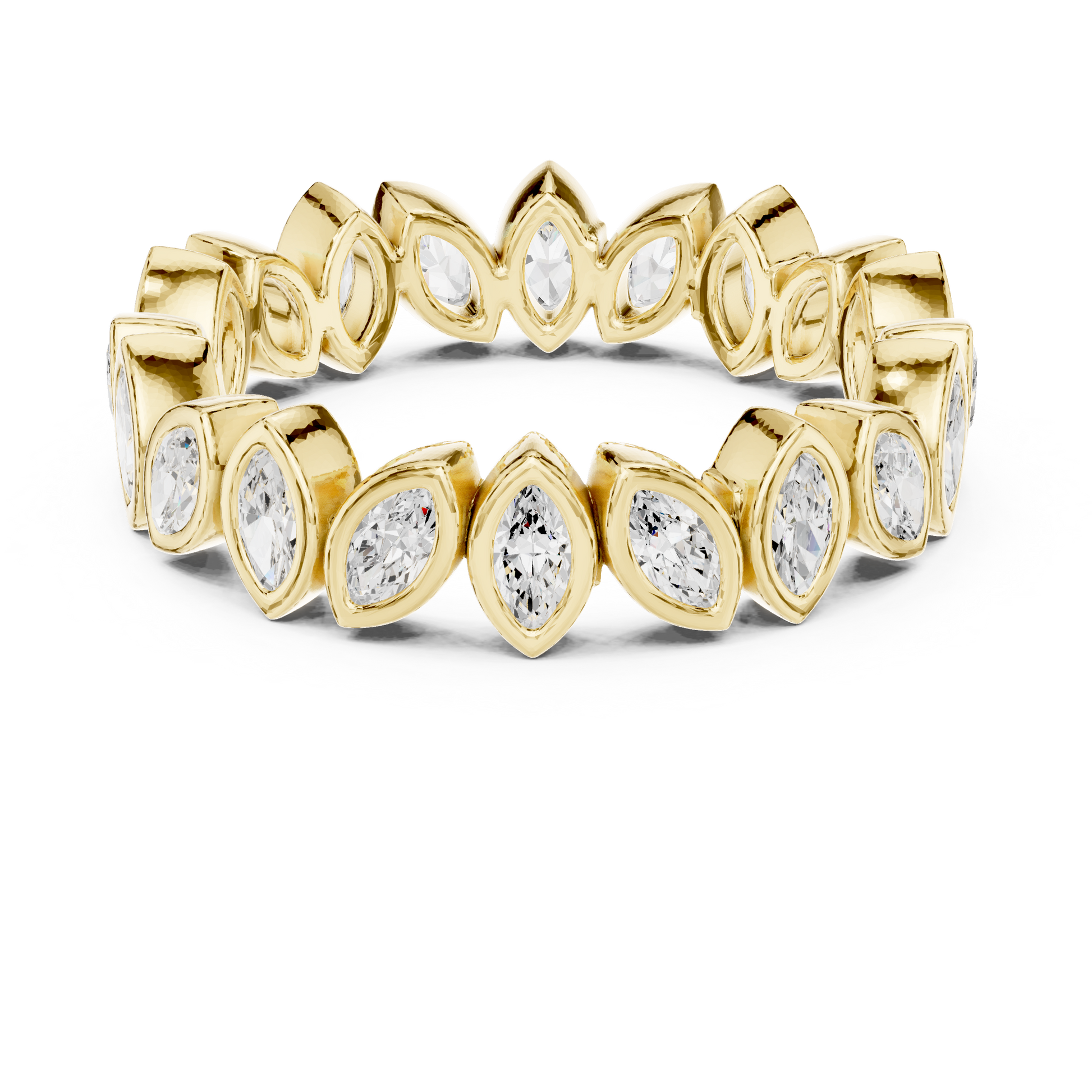 This striking eternity band showcases a full circle of marquise-cut diamonds, each elegantly framed in a smooth gold bezel setting. The repeating leaf-inspired design highlights the elongated diamond shape, offering a bold yet refined look with exceptional brilliance and durability. Ideal as a statement wedding band, anniversary ring, or standout stackable piece, this design blends modern craftsmanship with timeless luxury.