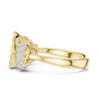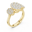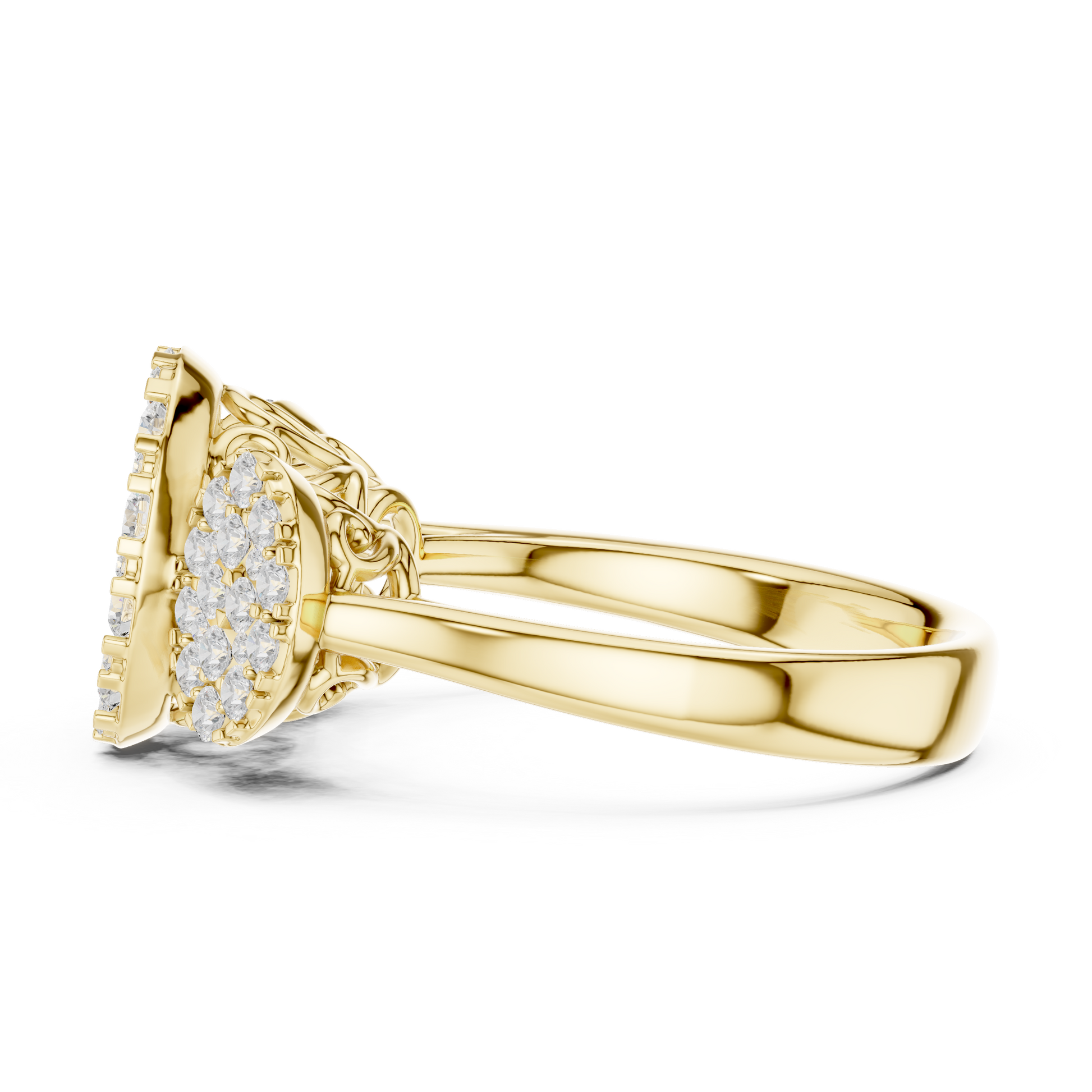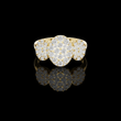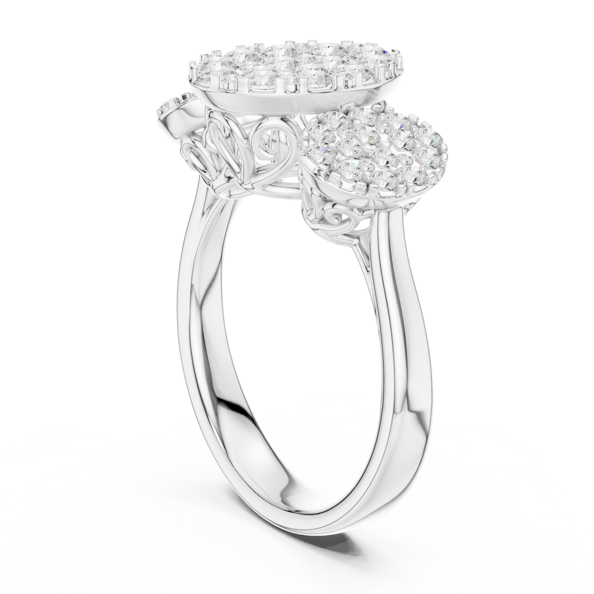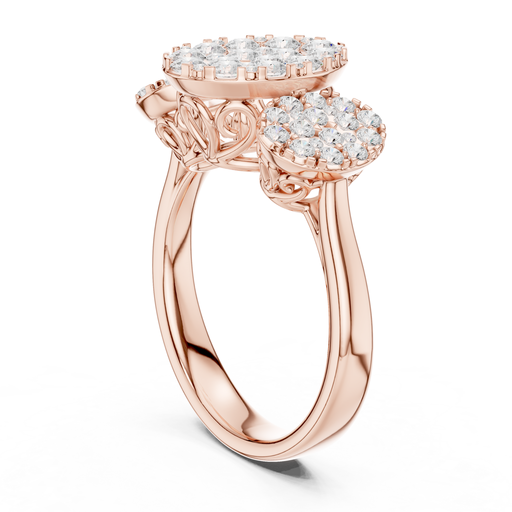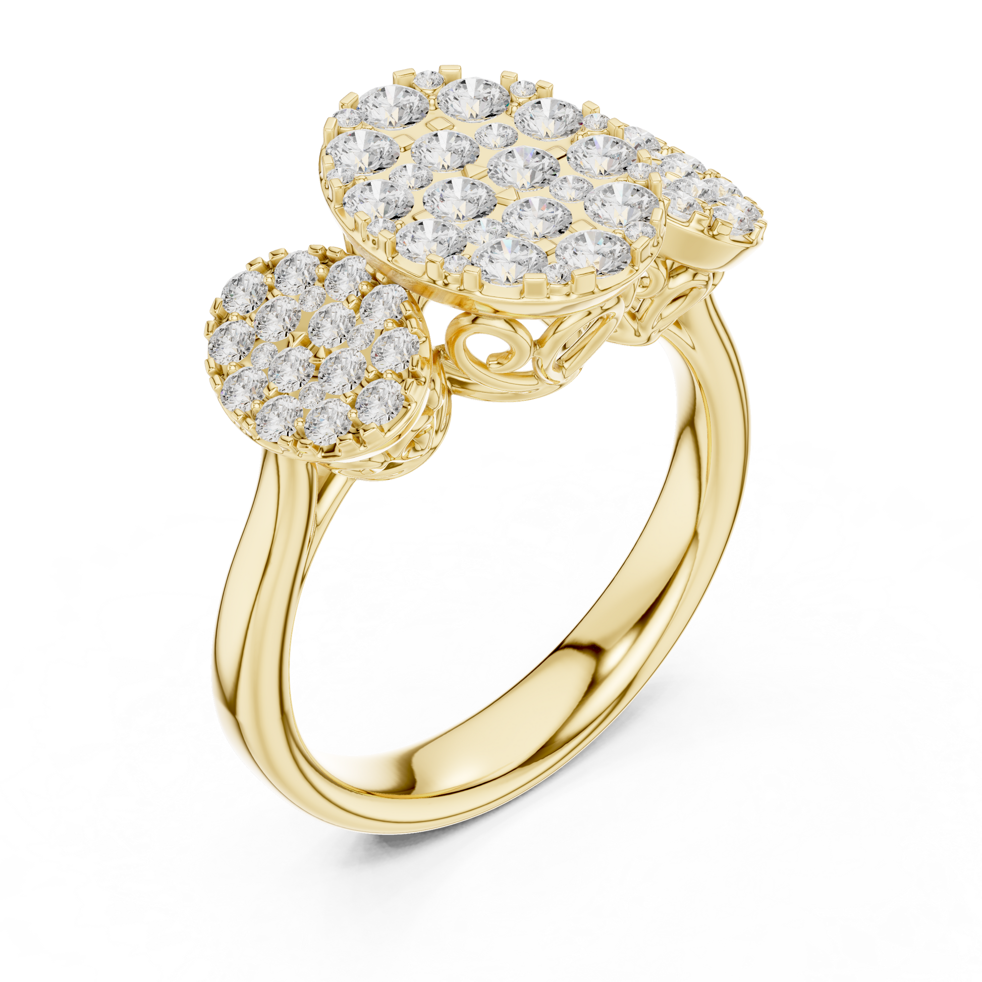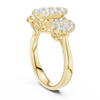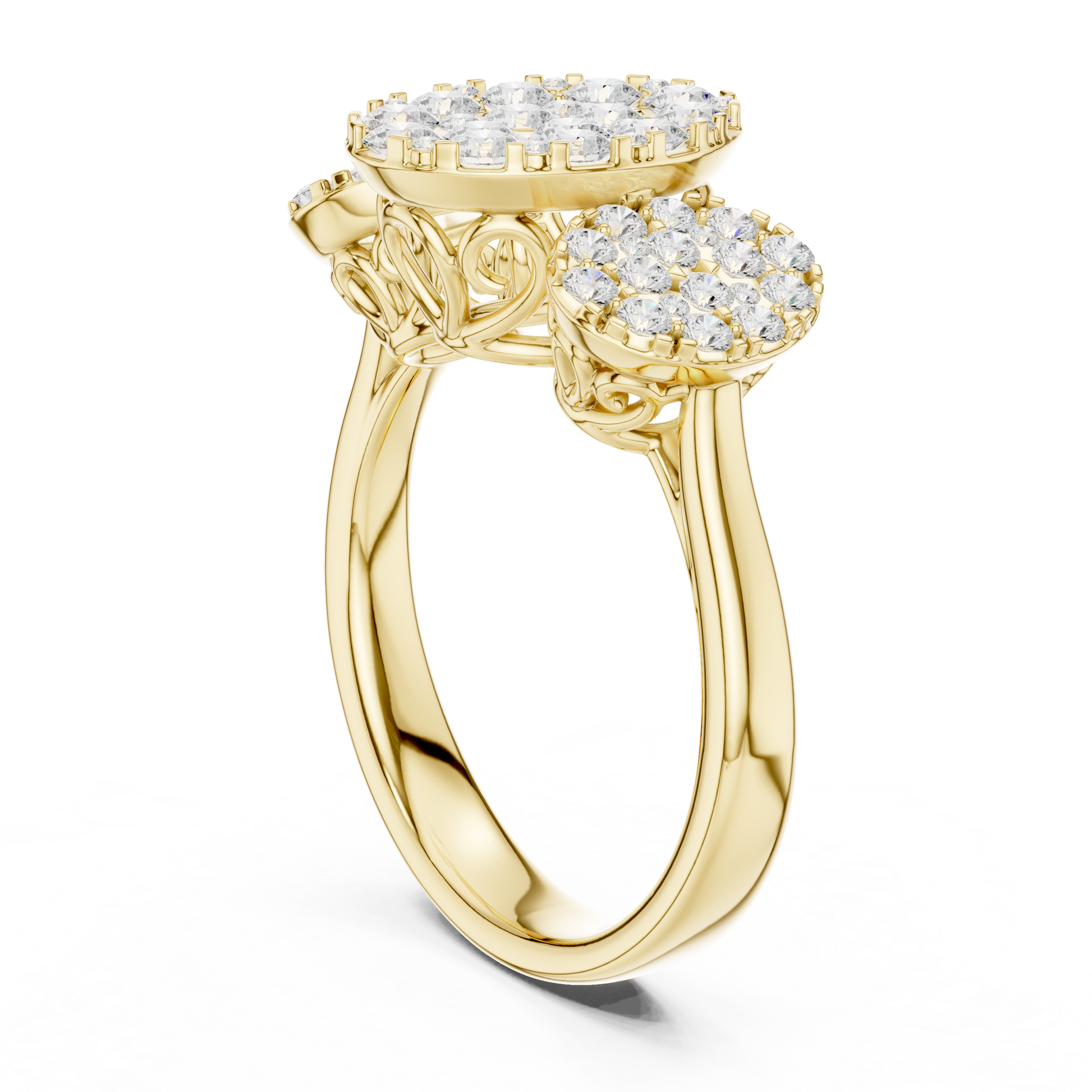 This stunning ring showcases three oval-shaped diamond clusters, each crafted with meticulously set brilliant-cut stones that create an exceptional sparkle from every angle. The luxurious yellow gold band enhances the radiance of the diamonds, offering a rich contrast and timeless elegance. Designed for those who appreciate bold, glamorous, and sophisticated jewelry, this piece makes a powerful statement whether worn daily or for special occasions.