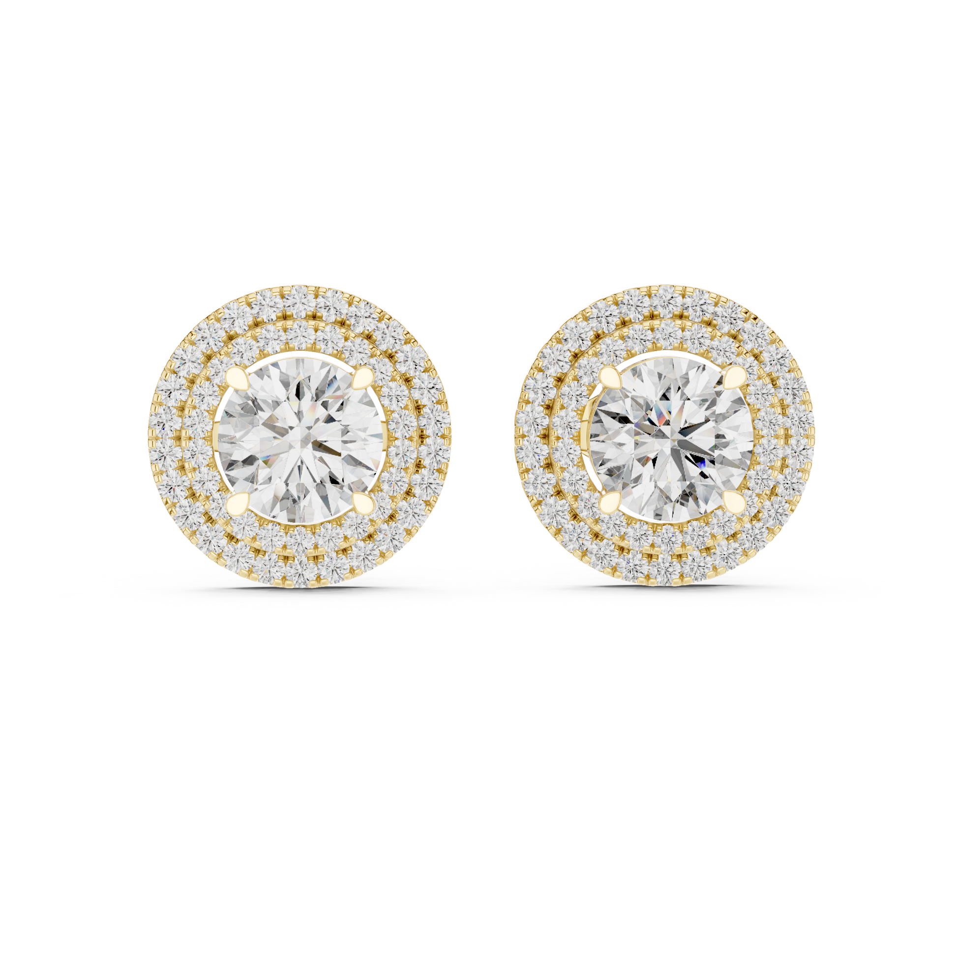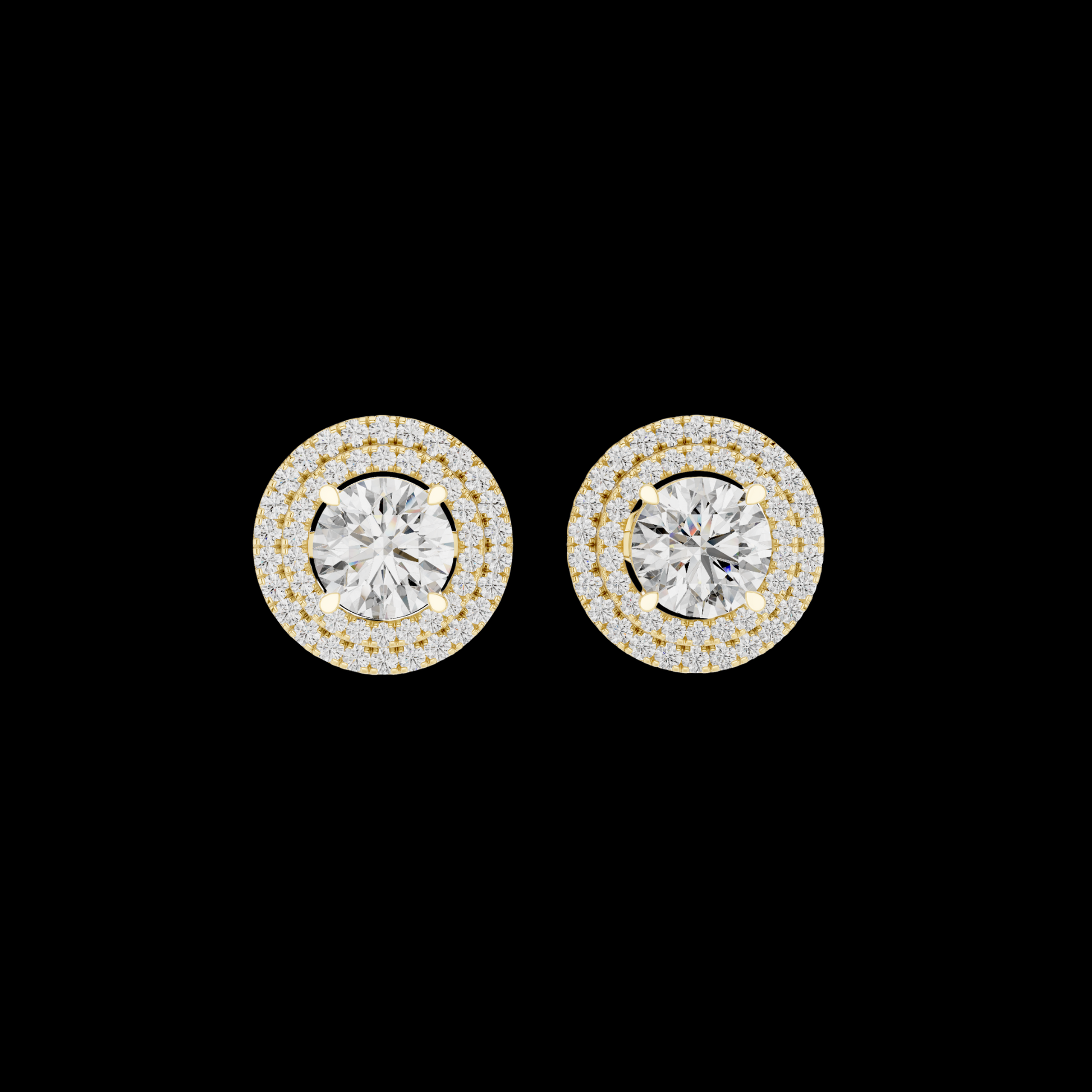 The Radiant Aura Diamond Stud Earrings redefine timeless beauty with a brilliant round-cut center diamond embraced by a double halo of meticulously set pavé diamonds. This layered halo design amplifies light reflection, creating exceptional depth, fire, and brilliance.Crafted in high, the refined prong and pavé settings offer a luxurious yet versatile look suitable for everyday elegance or special occasions. Perfect for those who value classic sophistication with elevated sparkle, these earrings are an essential addition to any fine jewelry collection—graceful, radiant, and eternally stylish.