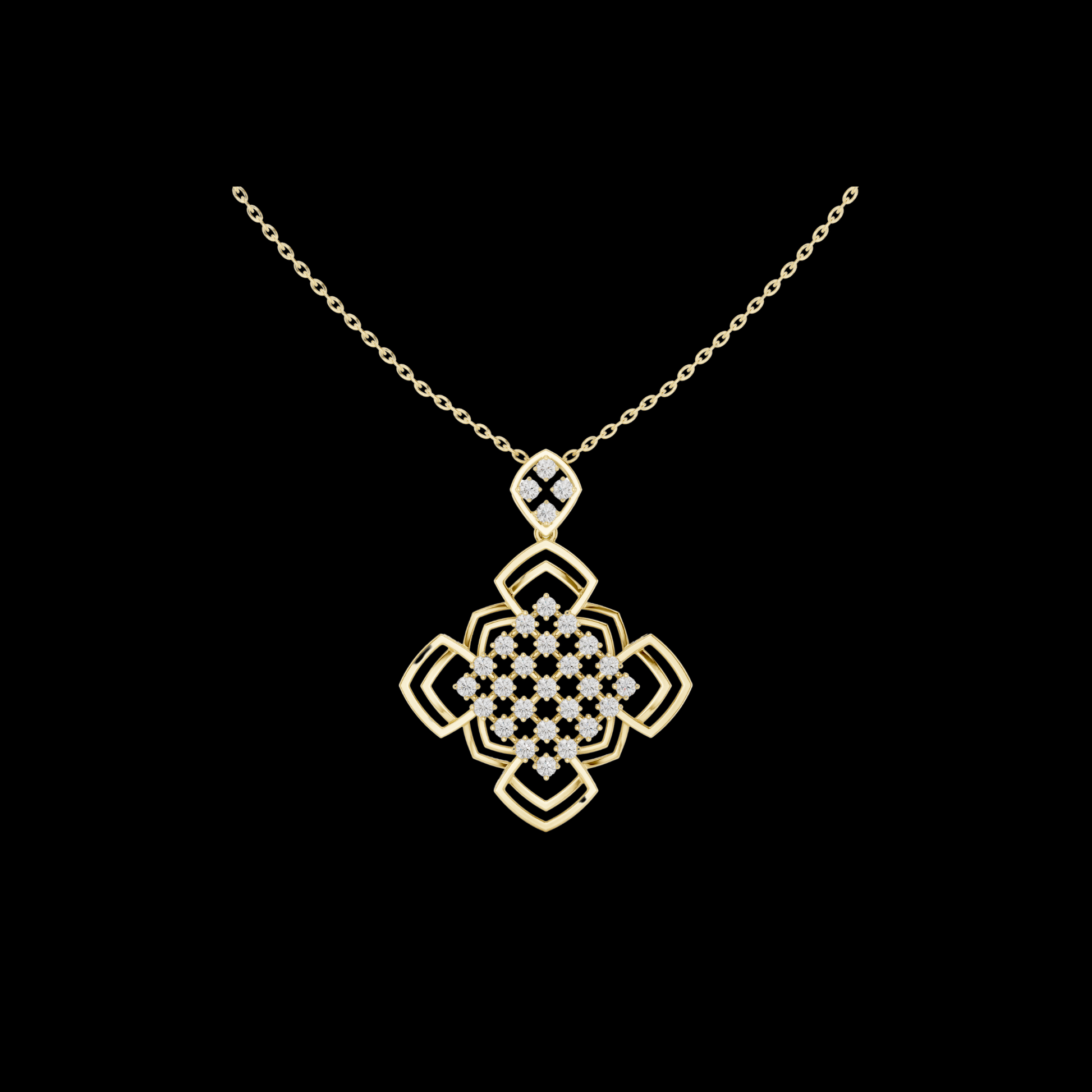 This exquisite pendant from IVEVAR LUXURY showcases a geometric floral-inspired design in polished gold, beautifully adorned with brilliant pavé-set diamonds. The layered openwork structure adds depth and elegance, while the delicate gold chain ensures effortless wear. this pendant is perfect for everyday sophistication or special occasions.