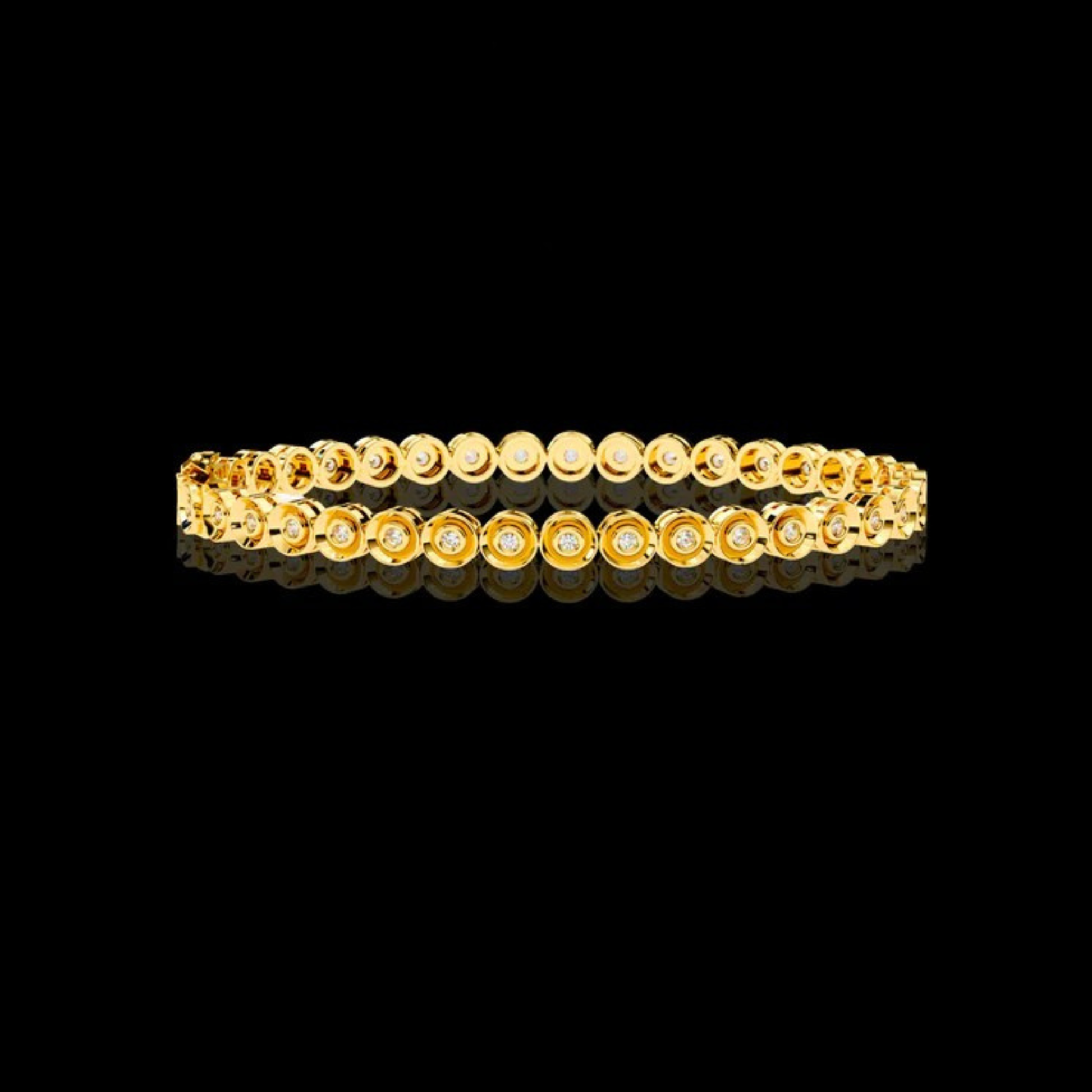 Embrace refined luxury with this exquisite bezel-set diamond bracelet, masterfully crafted in radiant gold. Each round diamond is individually encased in a smooth, polished bezel, creating a seamless line of brilliance that blends modern minimalism with timeless sophistication. The fluid silhouette offers both comfort and elegance, making it perfect for everyday wear or elevated styling.