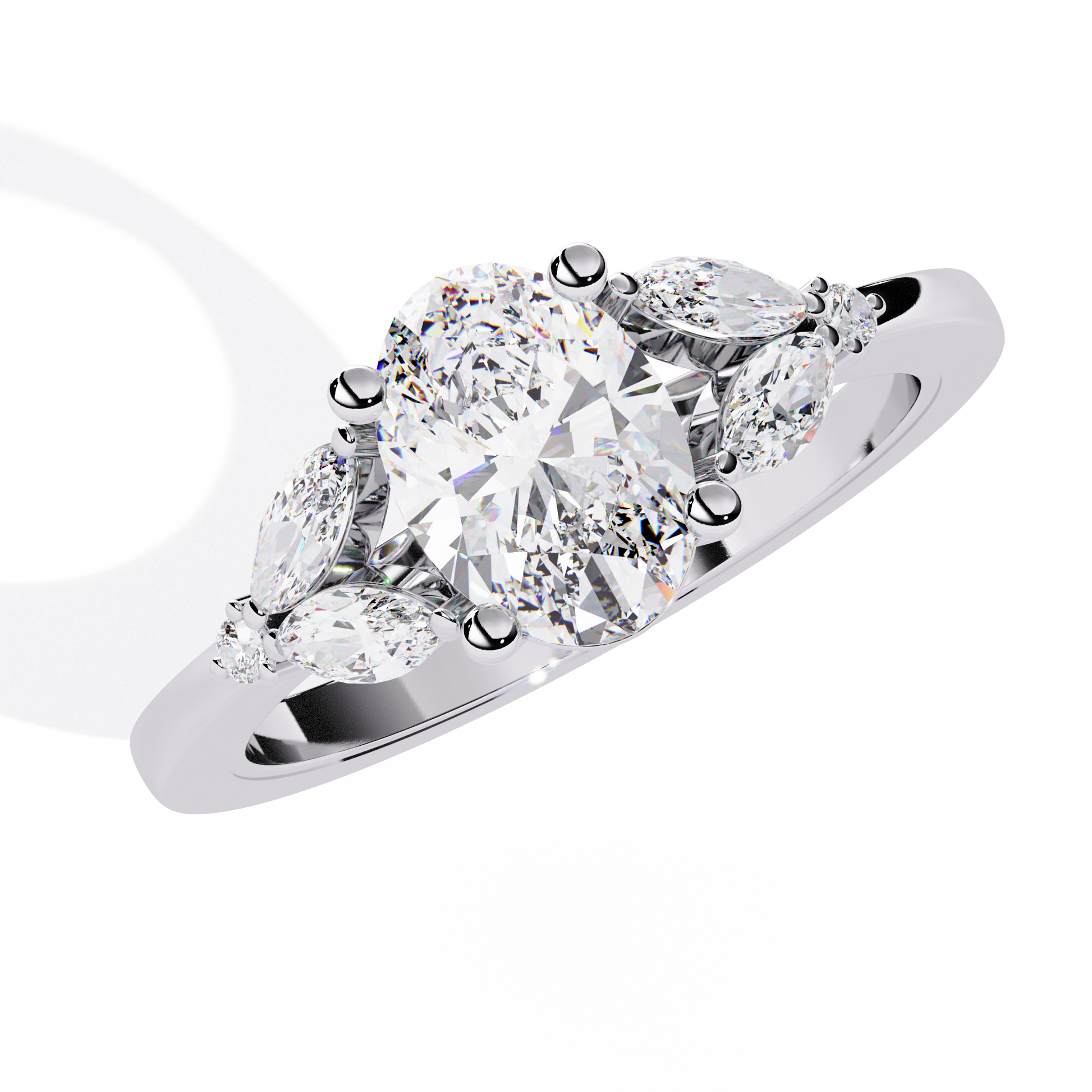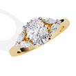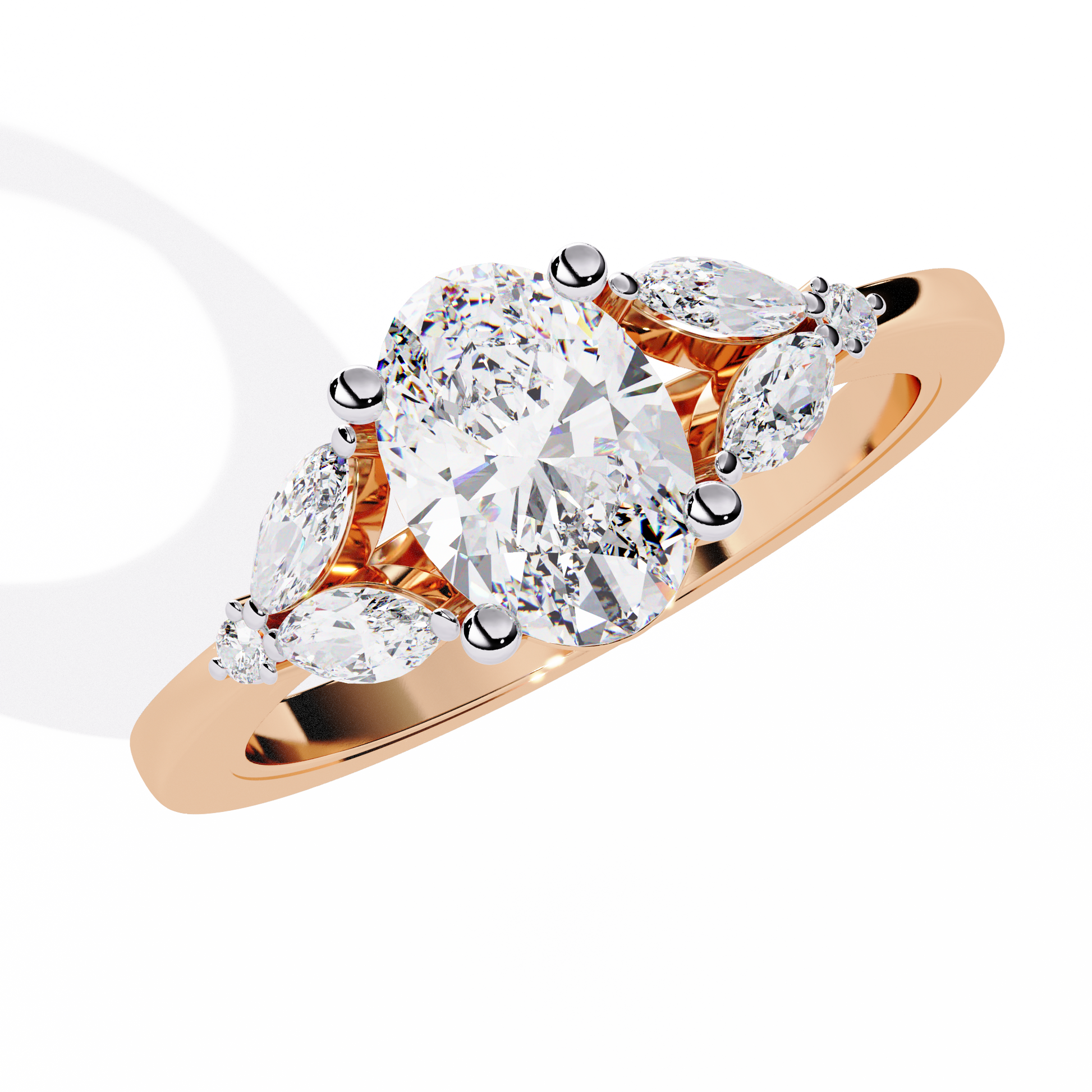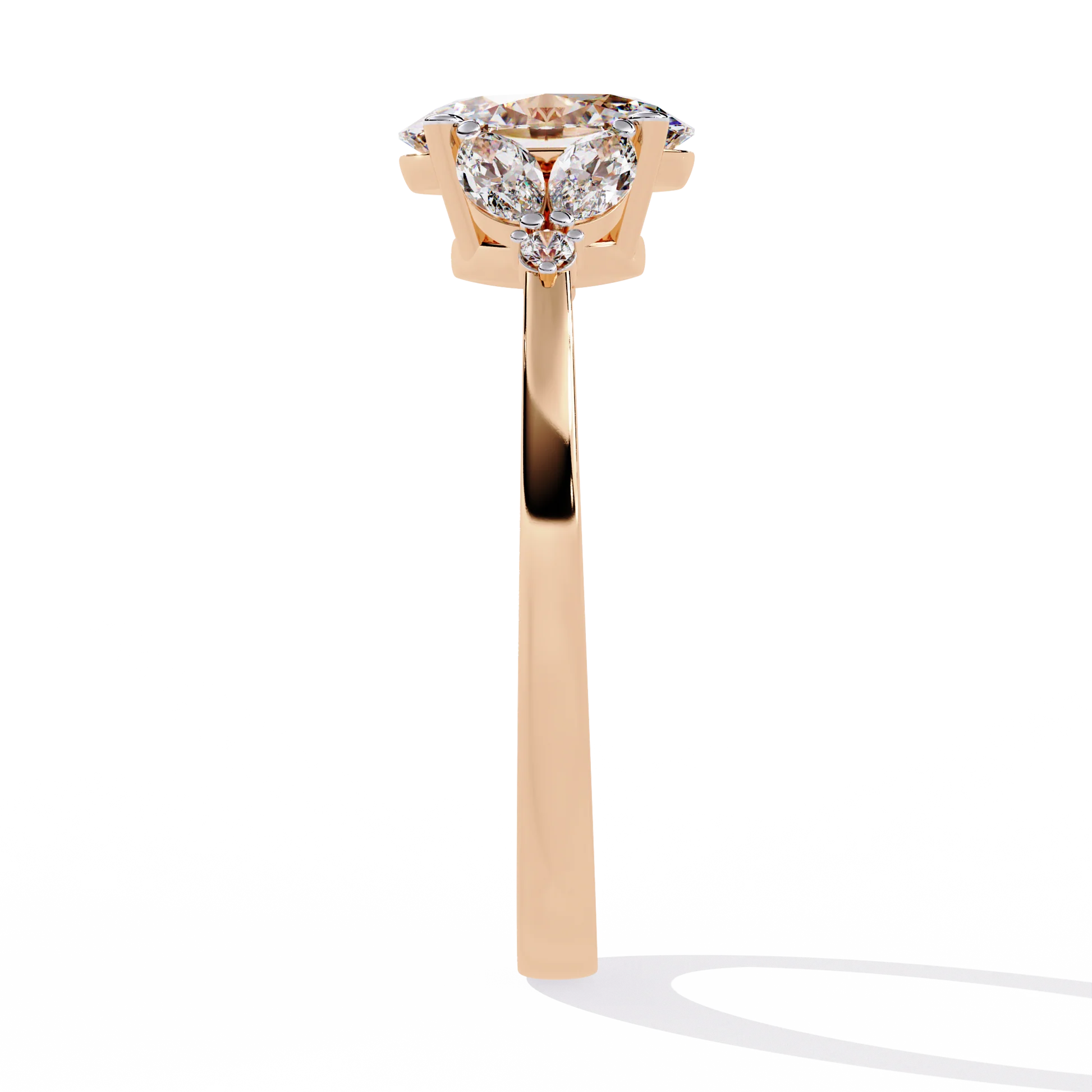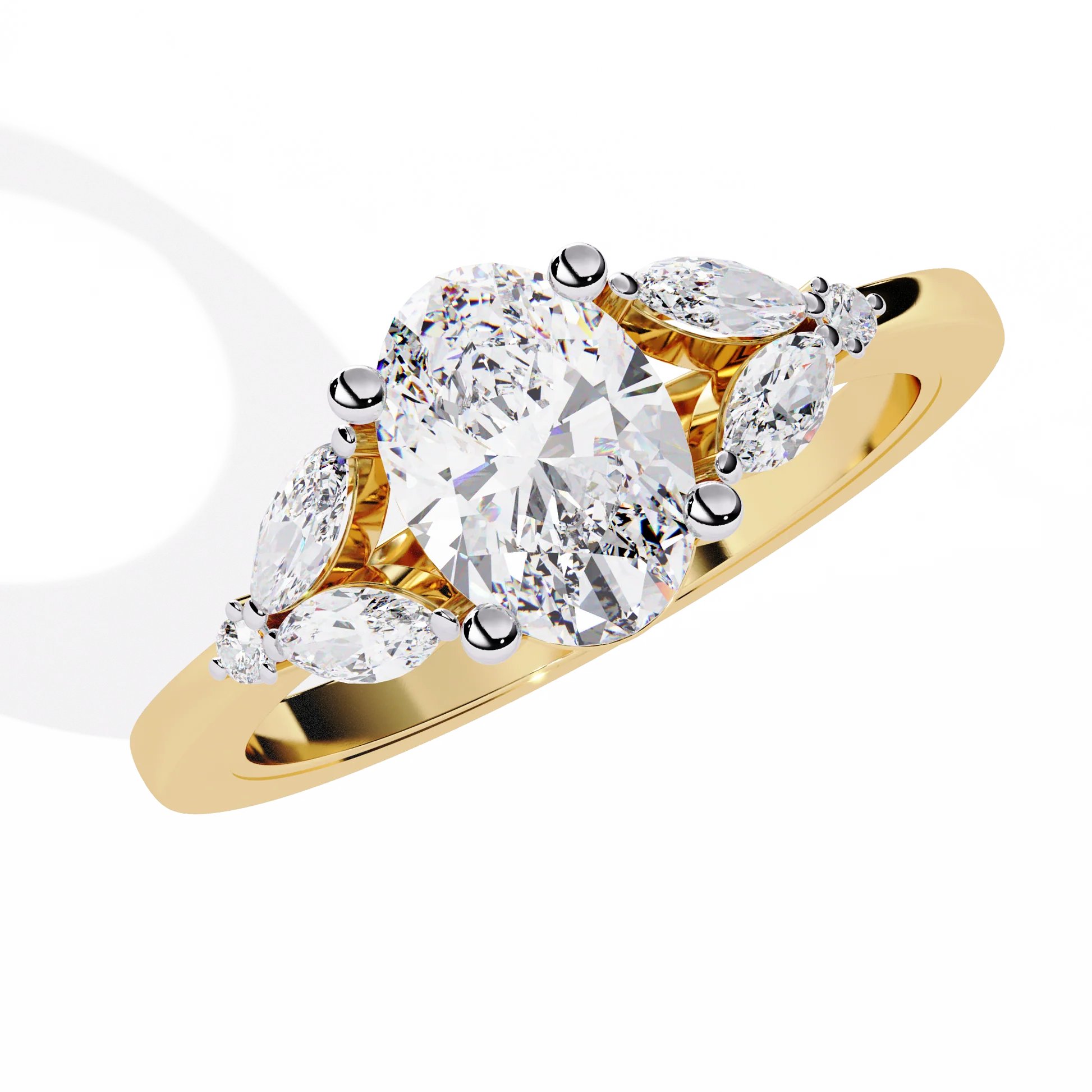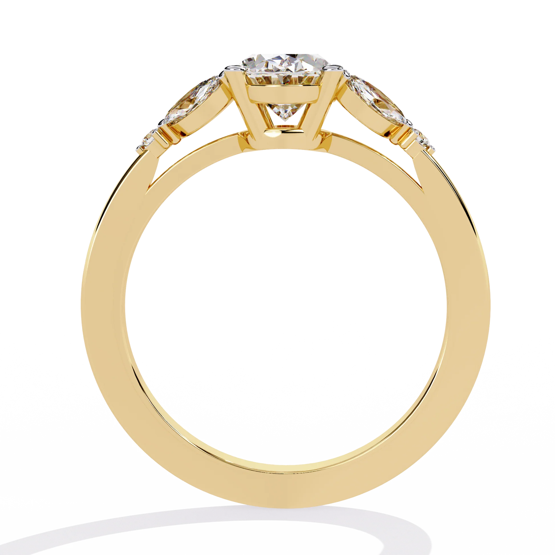 This elegant ring features a stunning oval-cut center diamond set in a warm gold band, flanked by two marquise-cut diamonds on each side that create a graceful, leaf-like silhouette. The combination of round brilliant stones and rich gold gives the piece a luxurious, timeless appeal, while the intricate setting enhances the sparkle and symmetry of the design. Perfect for someone who appreciates classic beauty with a refined, modern touch, this ring exudes sophistication and radiant elegance by Ivevar Luxury.