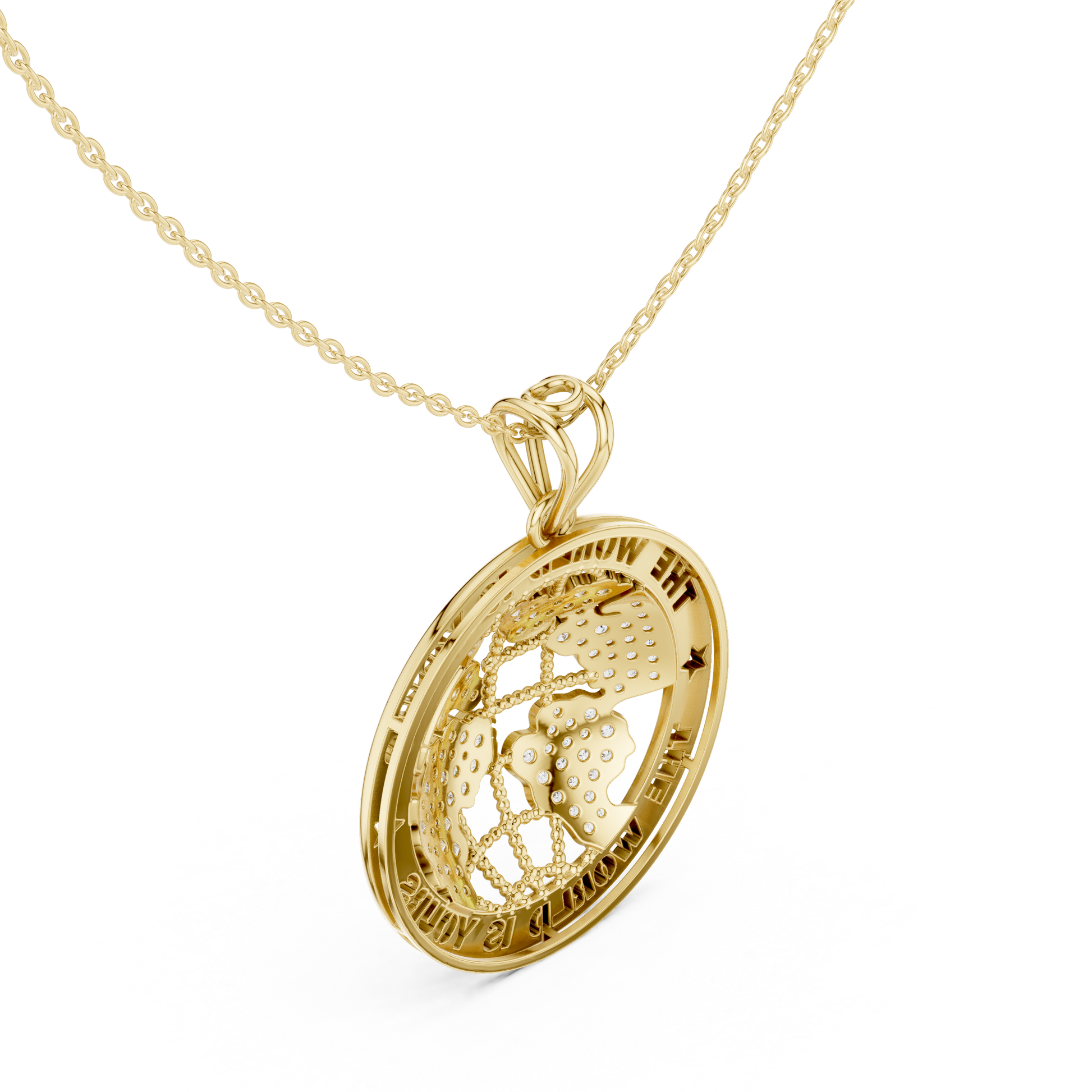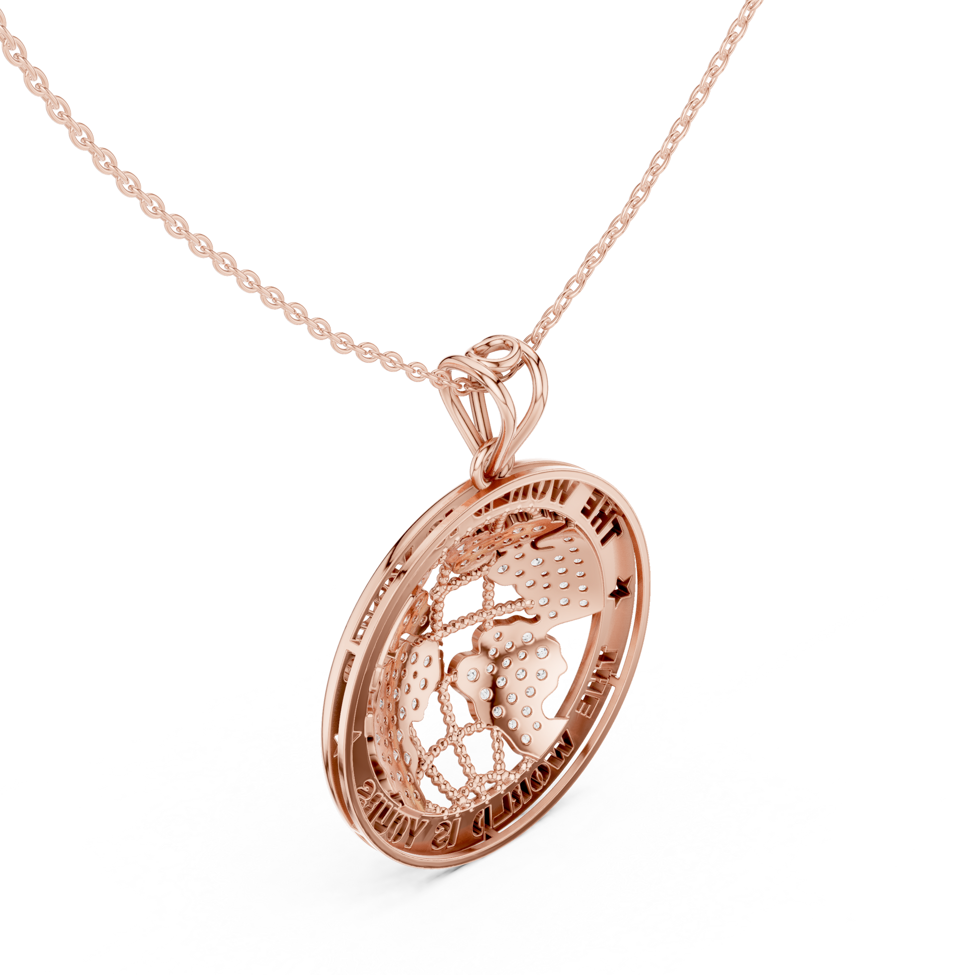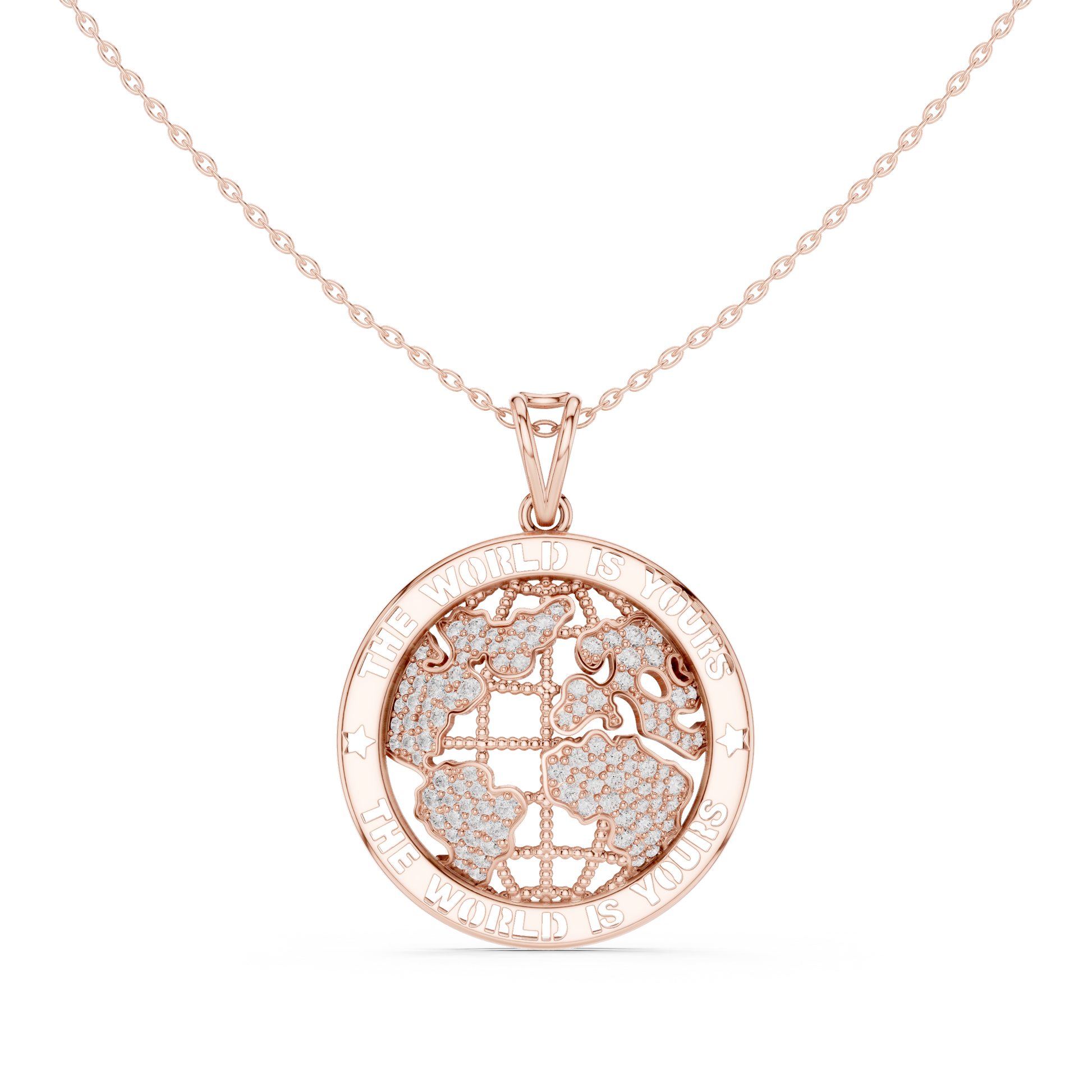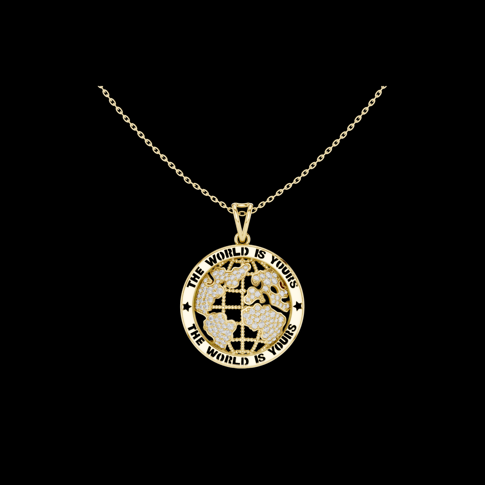 This exquisite globe pendant features a detailed world map design framed by the inspiring words “THE WORLD IS YOURS”, beautifully crafted in a radiant gold tone. The continents are highlighted with sparkling diamond-style stones, adding depth, brilliance, and a luxurious finish from every angle. Designed with a smooth polished edge, sturdy bail, and elegant chain compatibility, this pendant symbolizes ambition, freedom, and limitless possibilities.