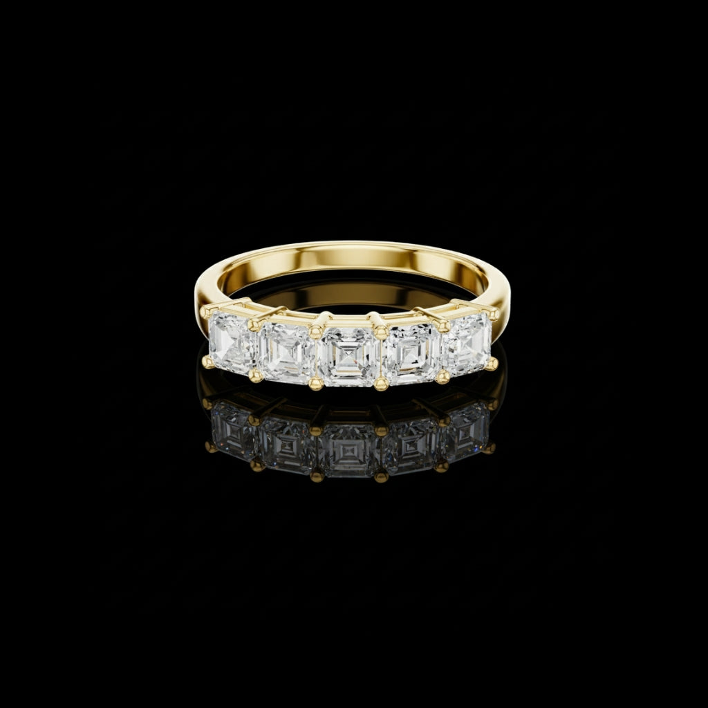 This emerald Cut Diamond Half-Eternity Band showcases a row of stunning step-cut Asscher diamonds, each precision-set in rich gold. Known for their mirror-like brilliance and geometric symmetry, these diamonds create a bold yet timeless look. Perfect as an anniversary band, statement ring, or fine stacking piece, this design reflects the refined craftsmanship and luxurious aesthetic of Ivevar Luxury. A true classic for women who appreciate clean lines, sophisticated sparkle, and modern elegance.