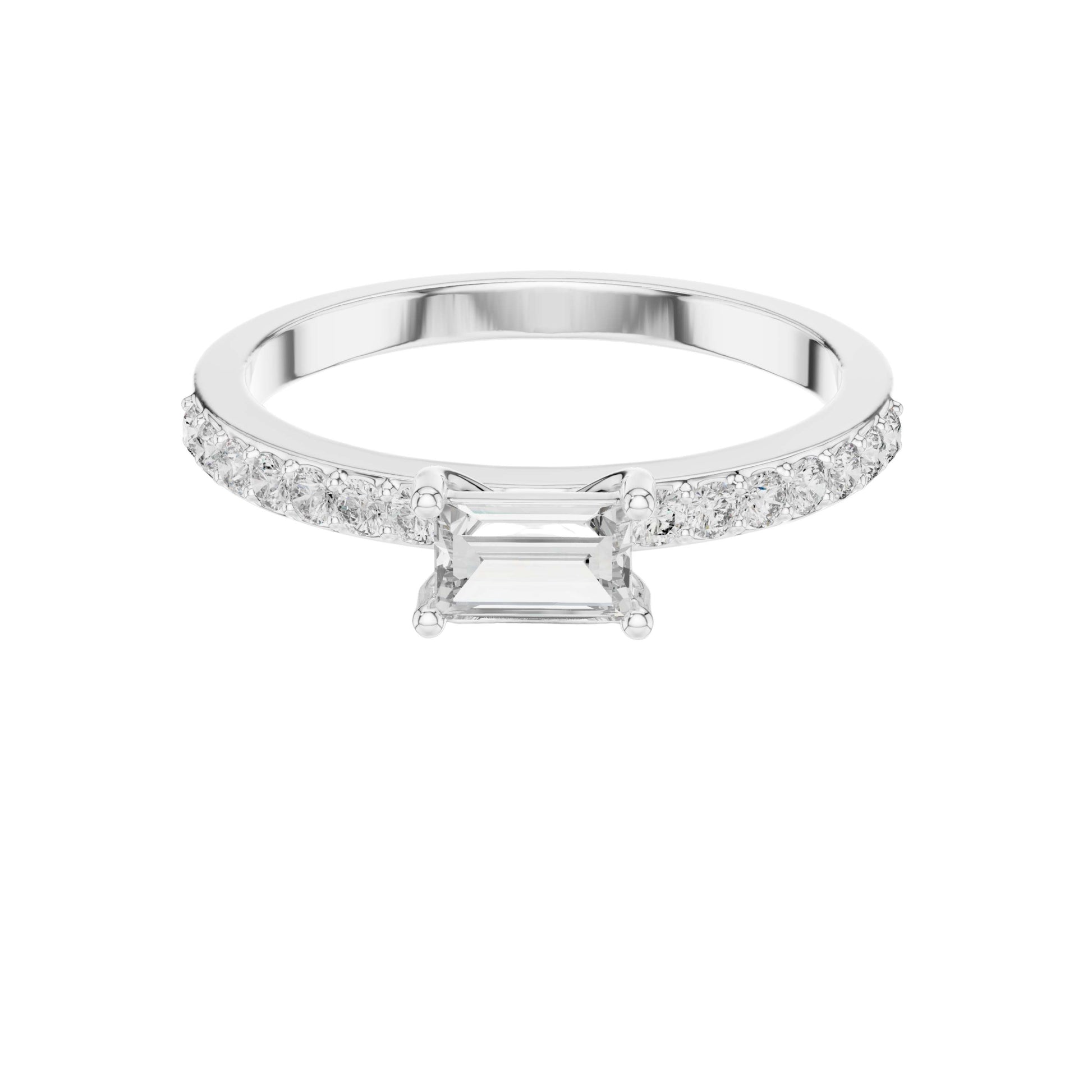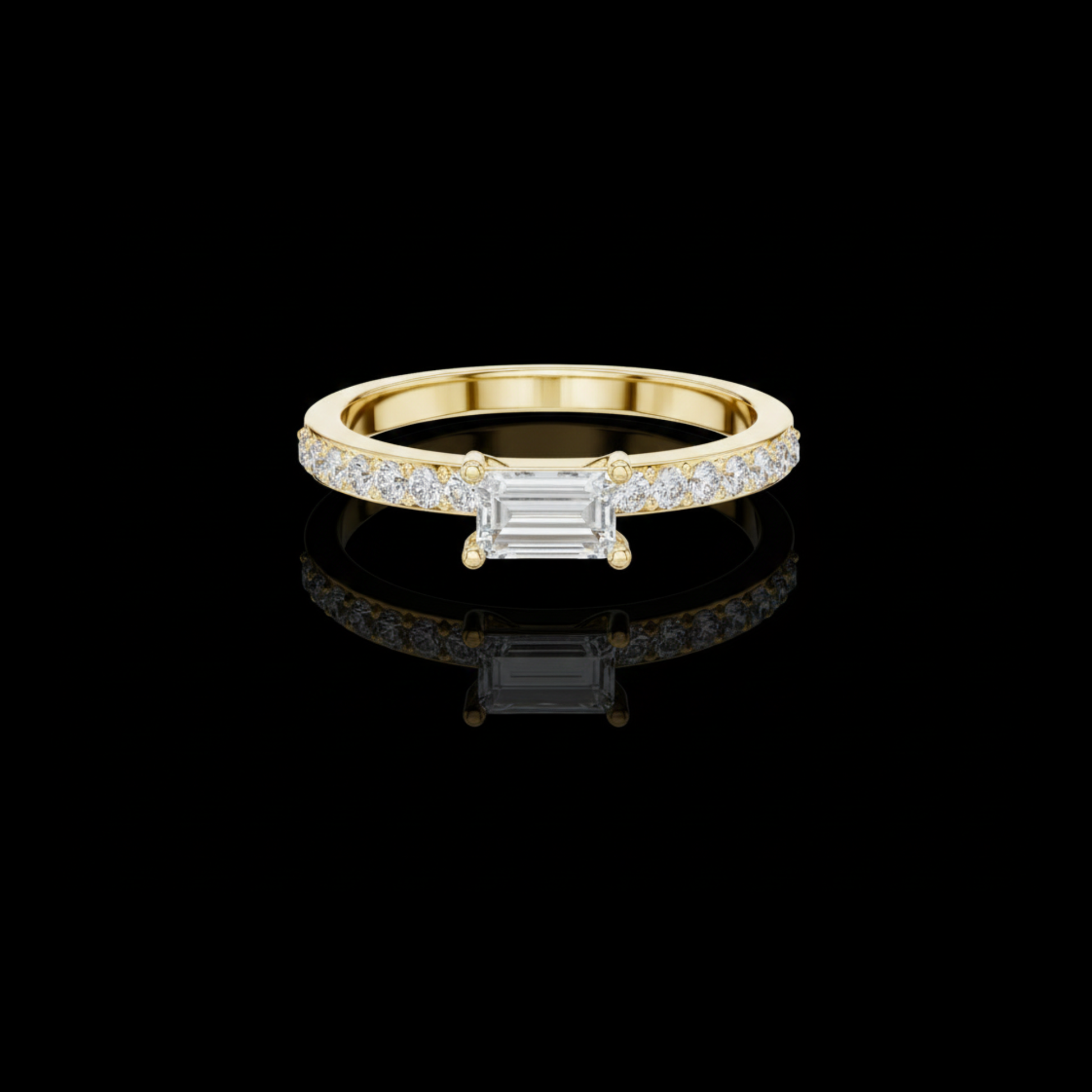 This sophisticated ring features a striking baguette cut center diamond, prized for its clean lines and elegant step-cut brilliance. Set in polished gold, the diamond is secured by refined prongs that highlight its geometric beauty, while a pave-set diamond band adds subtle sparkle and luxurious detail. Modern yet timeless, this design is perfect for those who appreciate understated elegance and contemporary refinement in a classic engagement ring.