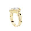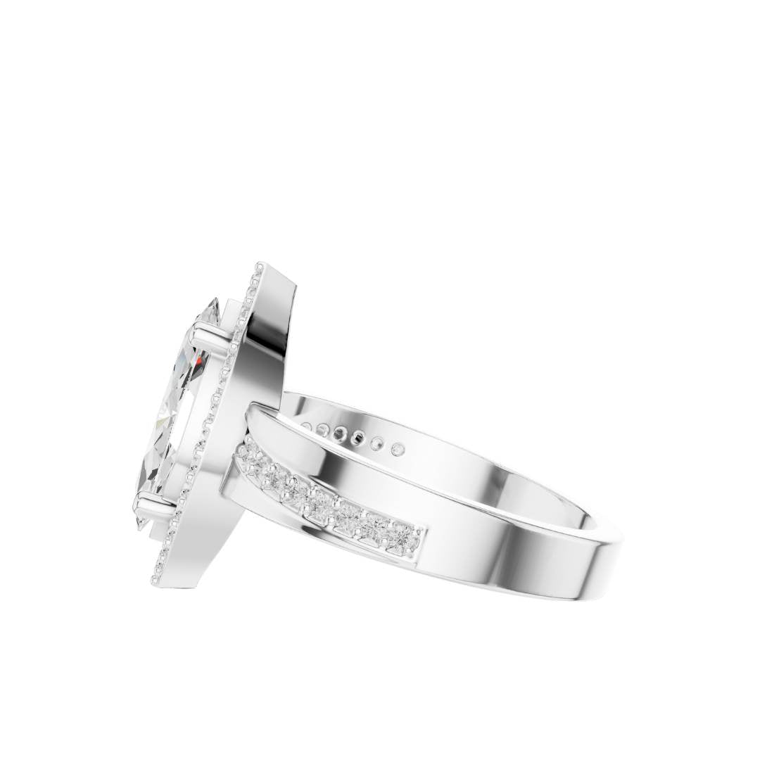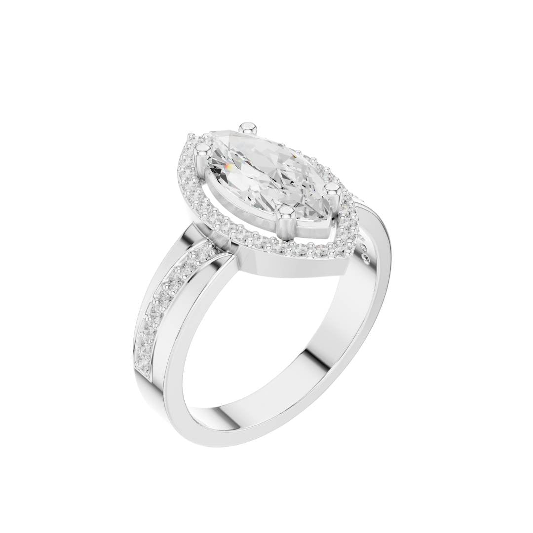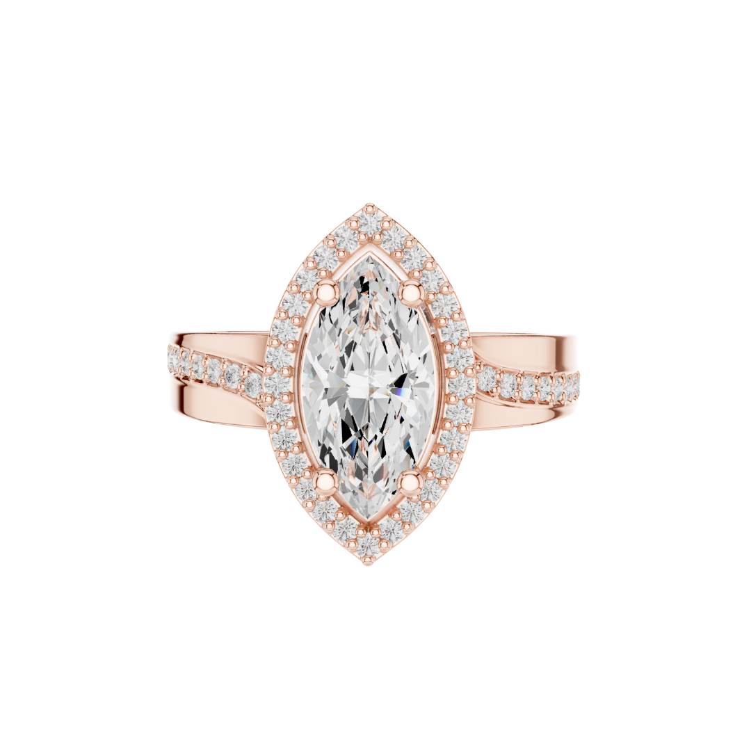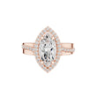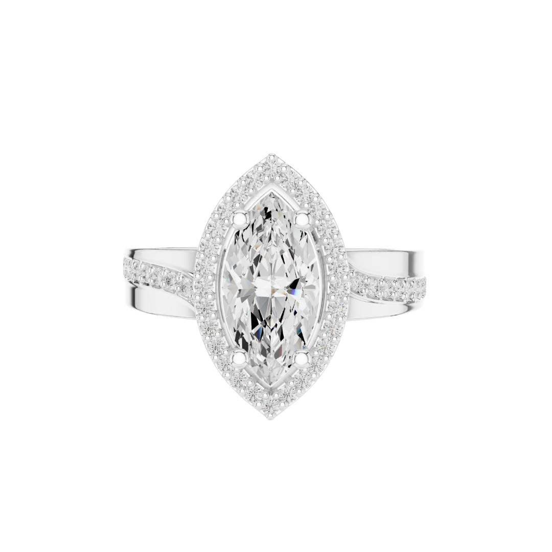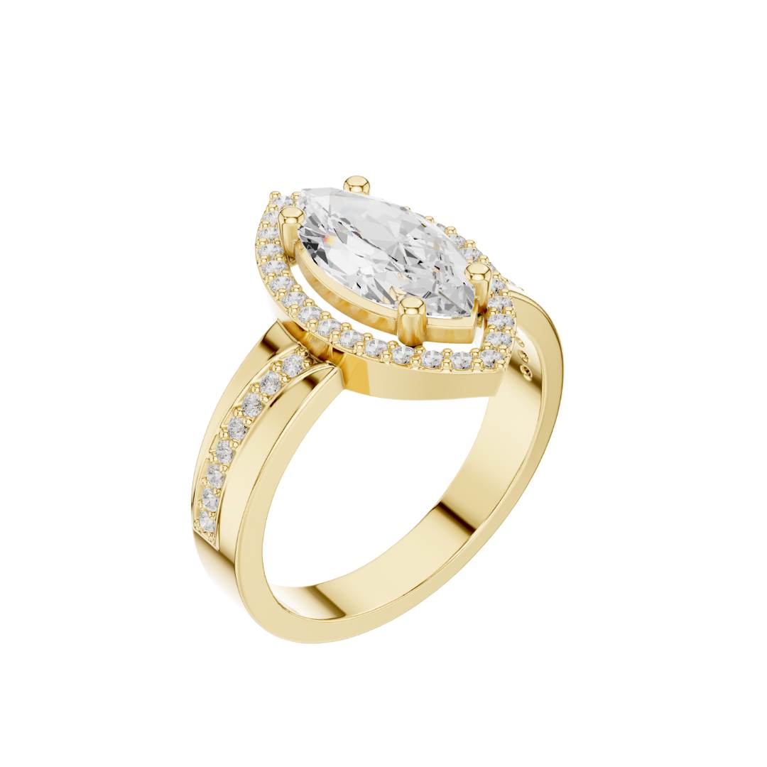 This exquisite ring features a striking marquise-cut center stone framed by a glittering halo that enhances its elongated brilliance. Set in polished gold, the design combines vintage charm with modern luxury. The pave-set band adds extra sparkle from every angle, making this ring a perfect choice for anyone who loves a refined, elongated silhouette with maximum radiance and elegance.