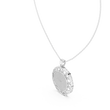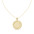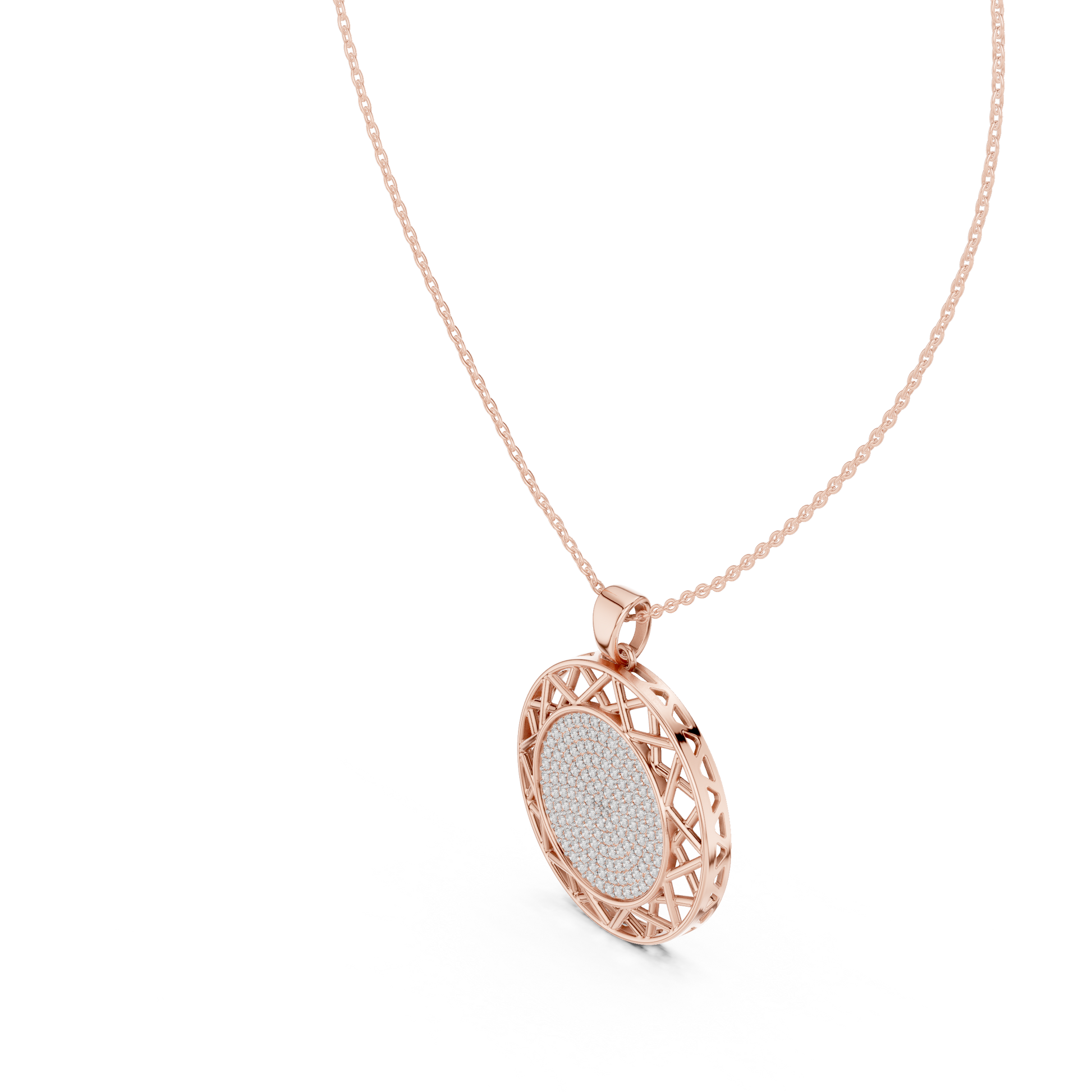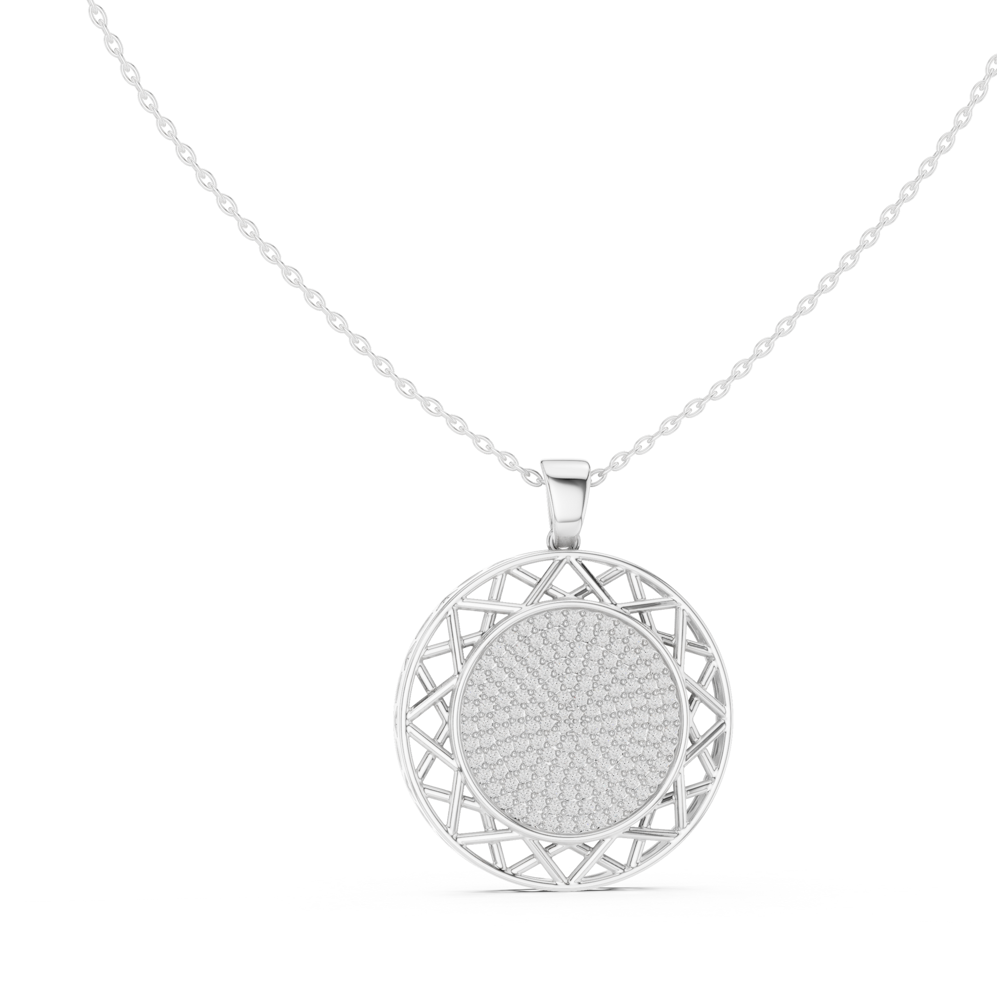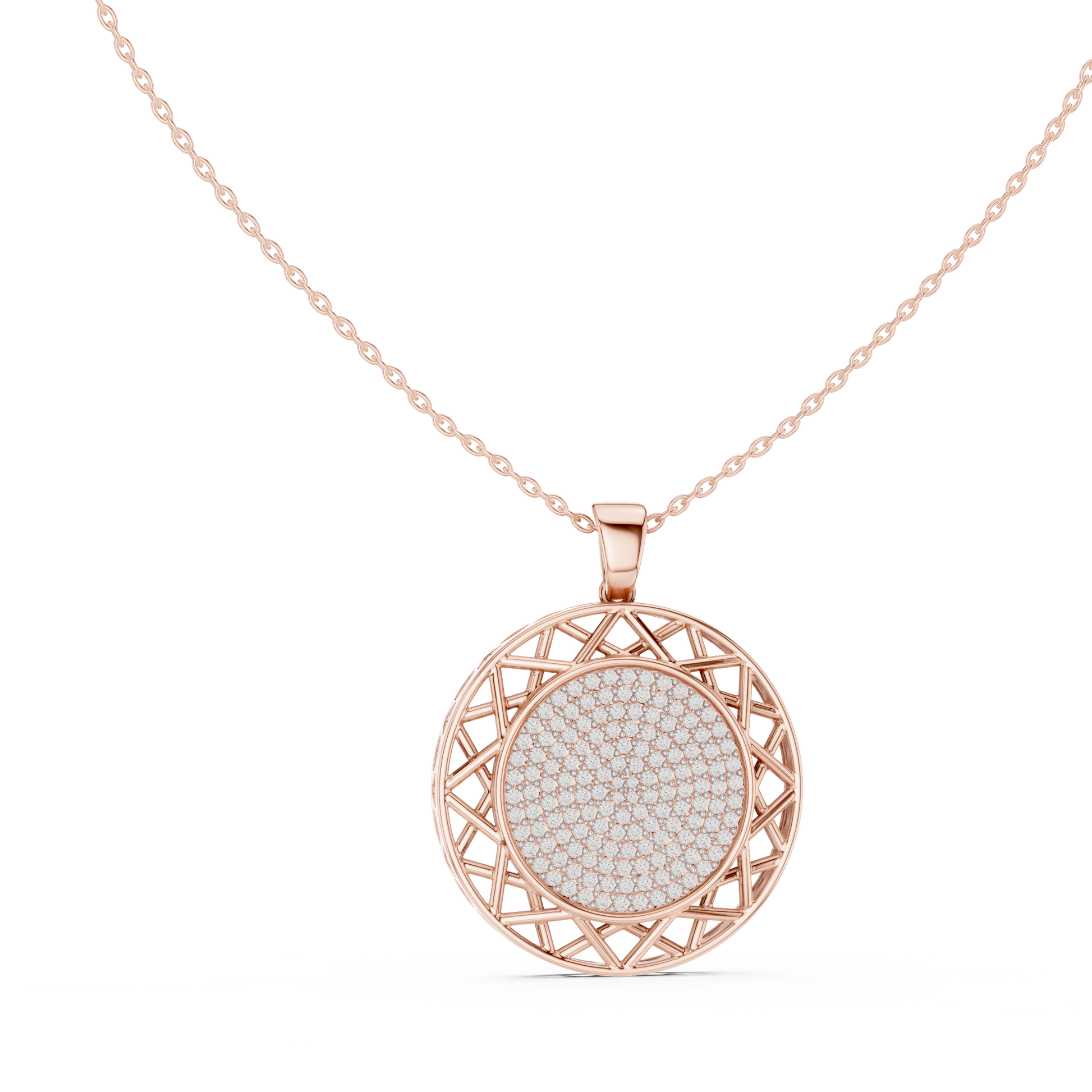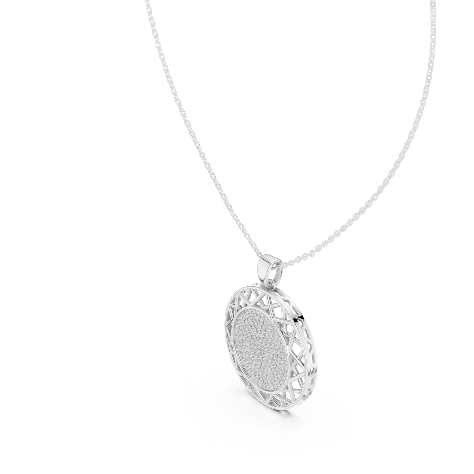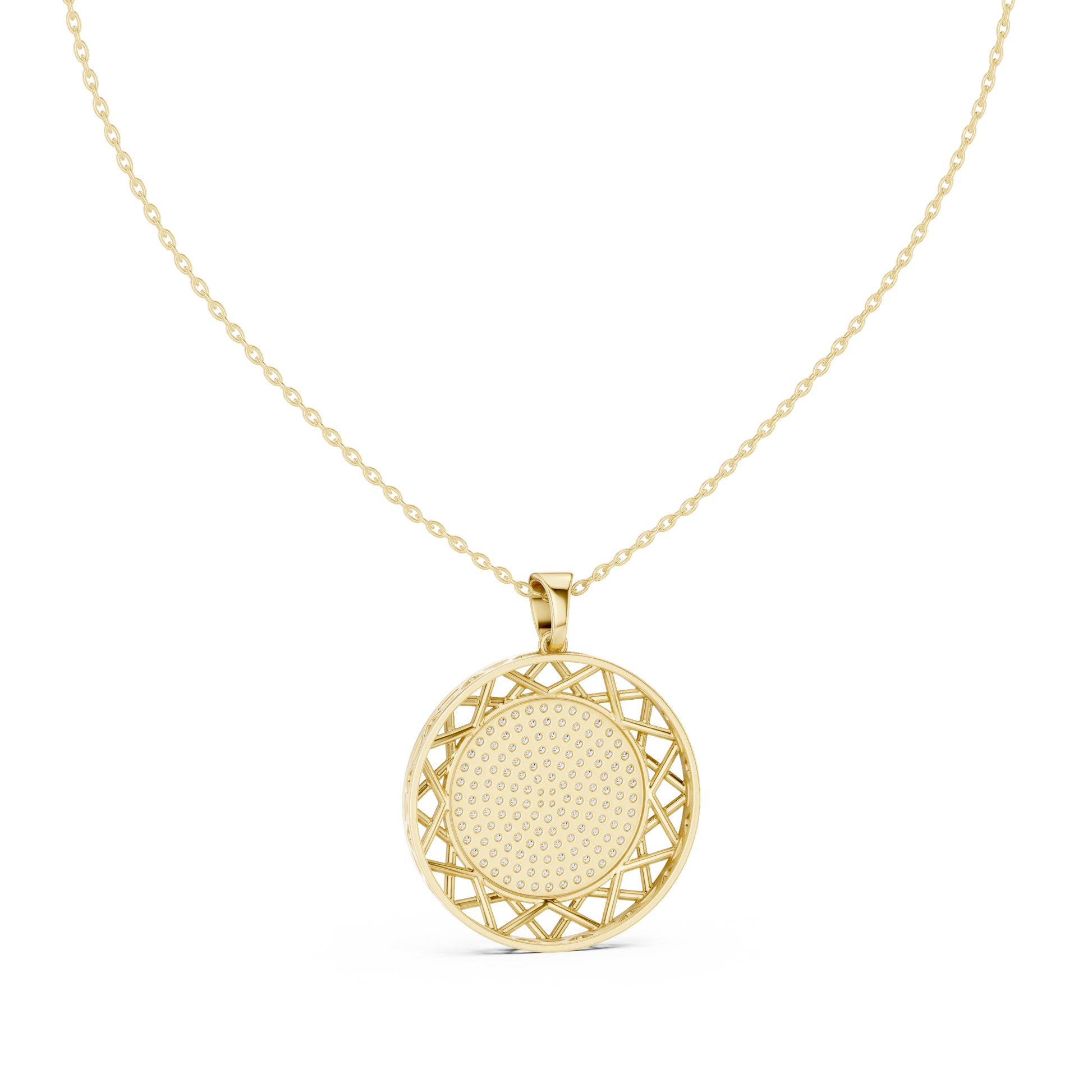 This stunning round medallion Pendant is a perfect fusion of timeless elegance and modern design. Featuring a brilliant pave-set center, the pendant radiates refined sparkle, while the open geometric lattice border adds depth, artistry, and a bold architectural touch. the circular silhouette symbolizes unity, balance, and sophistication. Suspended from a sleek gold chain, this piece is designed to elevate both everyday looks and special occasions.