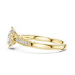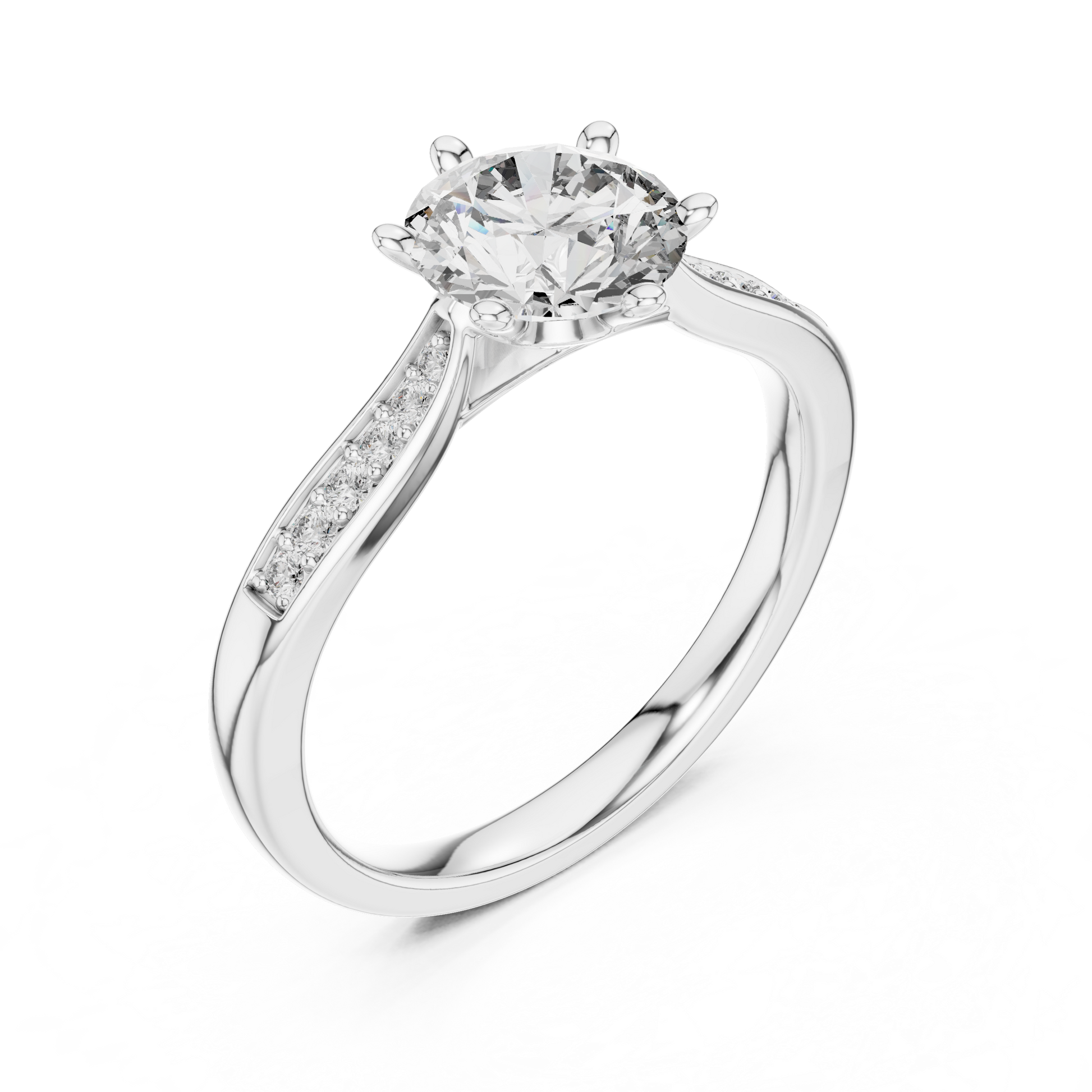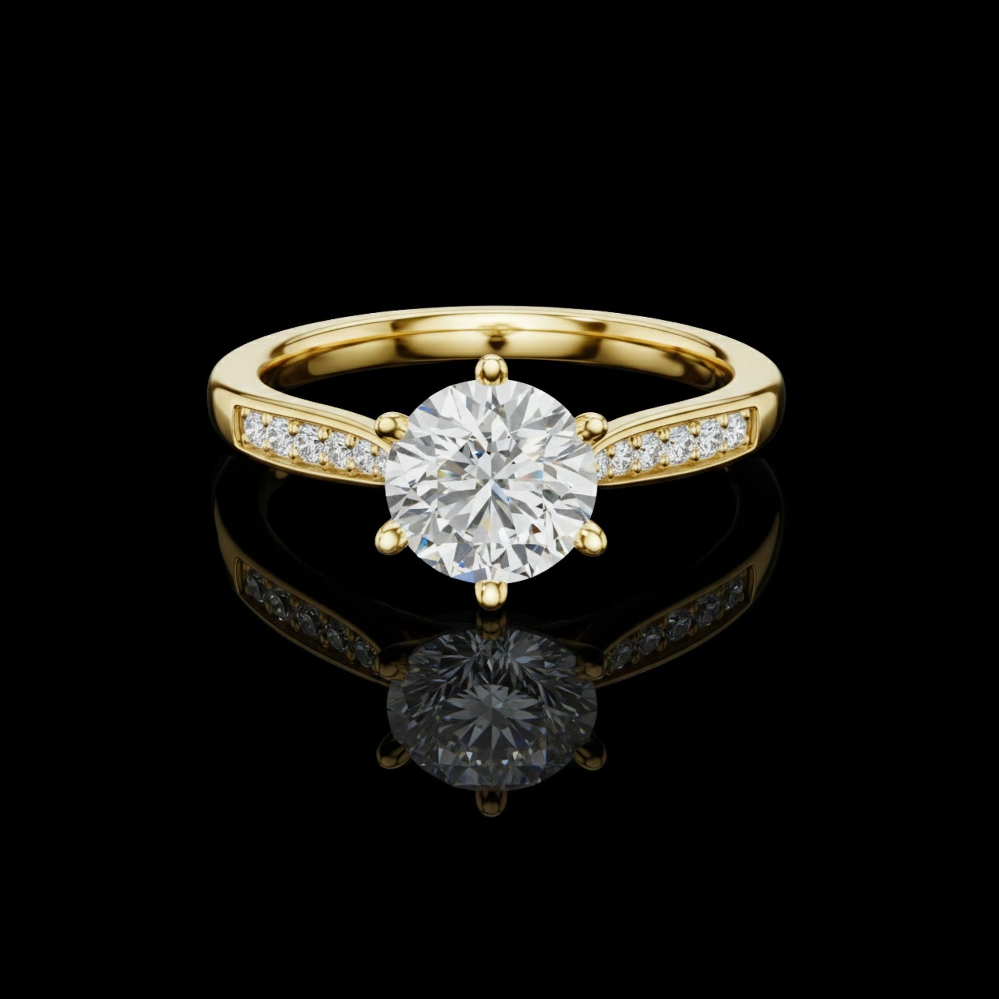 This exquisite gold solitaire diamond ring features a brilliant round-cut center stone secured by a classic six-prong setting. The polished band is accented with delicate pavé diamonds, adding shimmer and elegance from every angle. Perfect for engagements or special moments, this piece embodies timeless luxury design with a refined, modern touch, making it a stunning symbol of love and commitment.