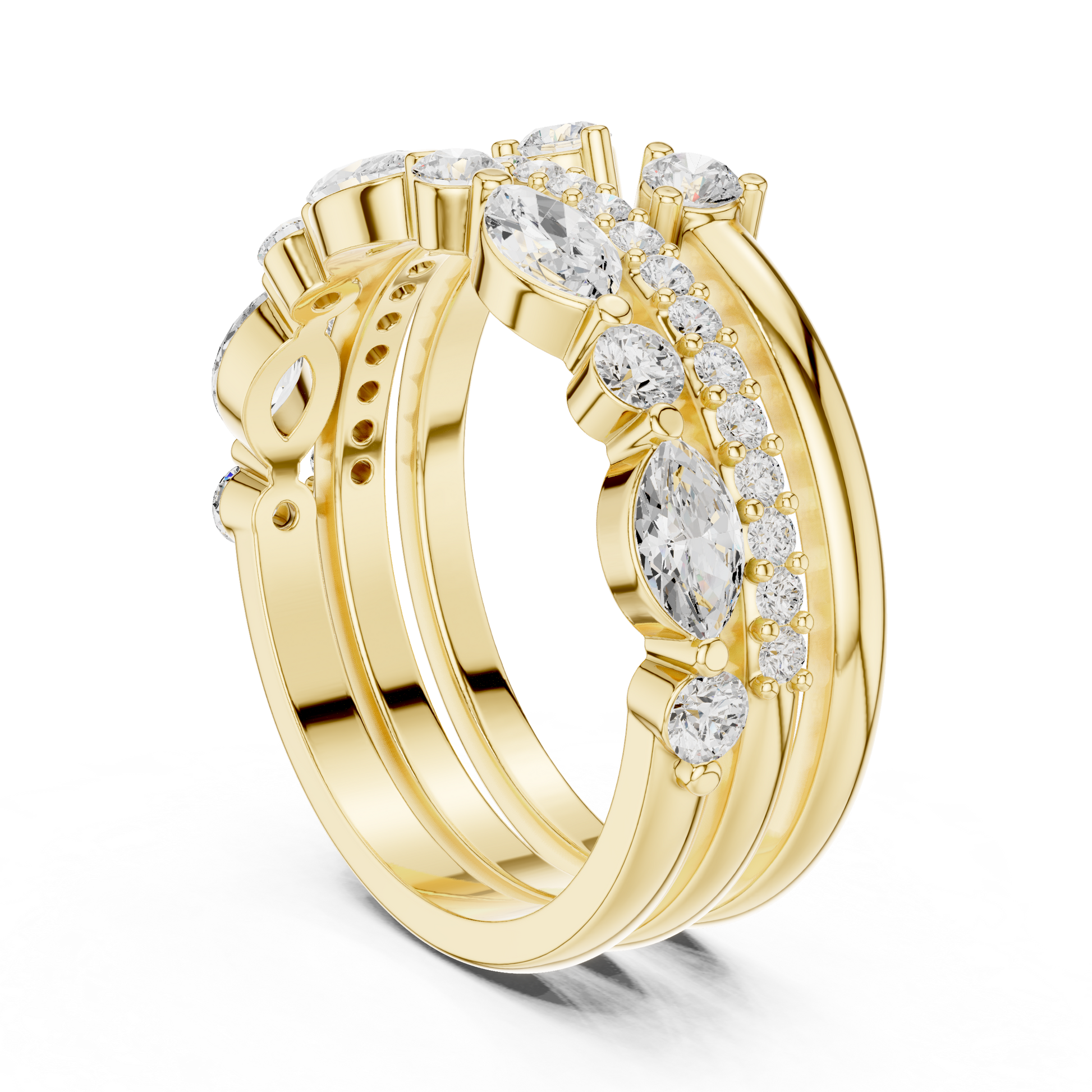 This Majestic Triple-Layer Diamond Stacking Ring Set features a breathtaking combination of round-cut, marquise-cut, and pavé-set diamonds arranged in a perfectly balanced 18K gold trio. Each ring is crafted with precision, allowing you to wear them together for a bold layered statement or individually for refined elegance. The blend of shapes and shimmer creates a luxury stacked look that radiates brilliance from every angle. A standout piece from Ivevar Luxury, designed for women who love sophisticated sparkle, versatility, and modern glamour.