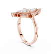 This extraordinary ring features a bold and architectural design. The centerpiece is created by two brilliant trillion or kite-cut diamonds, set point-to-point to form a striking Trillion silhouette. This central form is encased in a geometric yellow gold frame, which is dramatically embellished with radiating spokes of pavé-set diamonds, creating a sunburst or celestial effect. A horizontal line of diamonds elegantly bisects the center stones. Crafted in rich gold, this piece is an unconventional and eye-catching statement ring, perfect for those seeking unique and modern fine jewelry with a vintage-inspired flair.