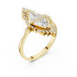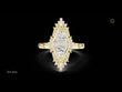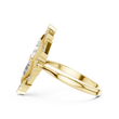 This extraordinary ring features a bold and architectural design. The centerpiece is created by two brilliant trillion or kite-cut diamonds, set point-to-point to form a striking Trillion silhouette. This central form is encased in a geometric yellow gold frame, which is dramatically embellished with radiating spokes of pavé-set diamonds, creating a sunburst or celestial effect. A horizontal line of diamonds elegantly bisects the center stones. Crafted in rich gold, this piece is an unconventional and eye-catching statement ring, perfect for those seeking unique and modern fine jewelry with a vintage-inspired flair.
