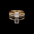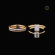 This stunning ring set features a radiant-cut center stone elegantly elevated on a polished gold band, complemented with bridal set matching pavé diamond bands that enhance its brilliance and symmetry. The rectangular center stone delivers a clean, modern sparkle, while the surrounding rows of meticulously set diamonds add layers of luxury and sophistication. The warm gold metal provides a rich contrast to the crisp clarity of the diamonds, creating a timeless yet contemporary aesthetic.