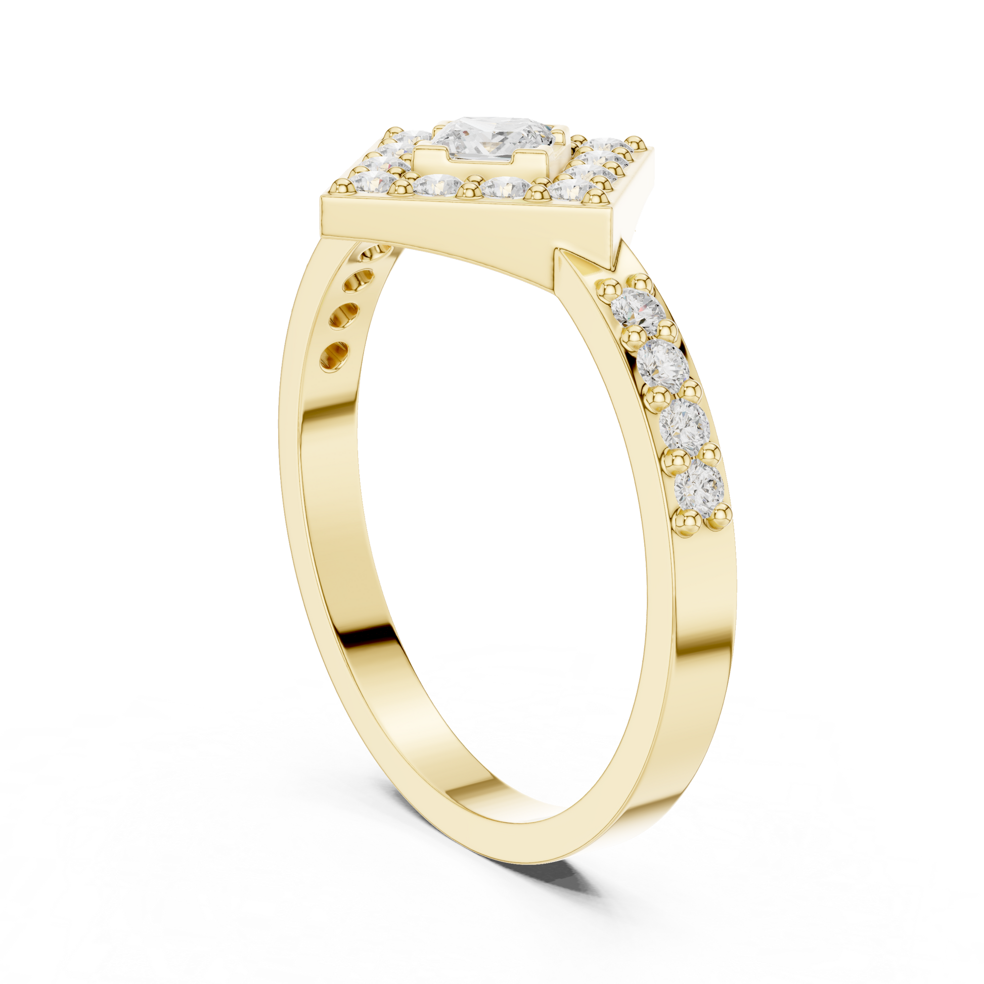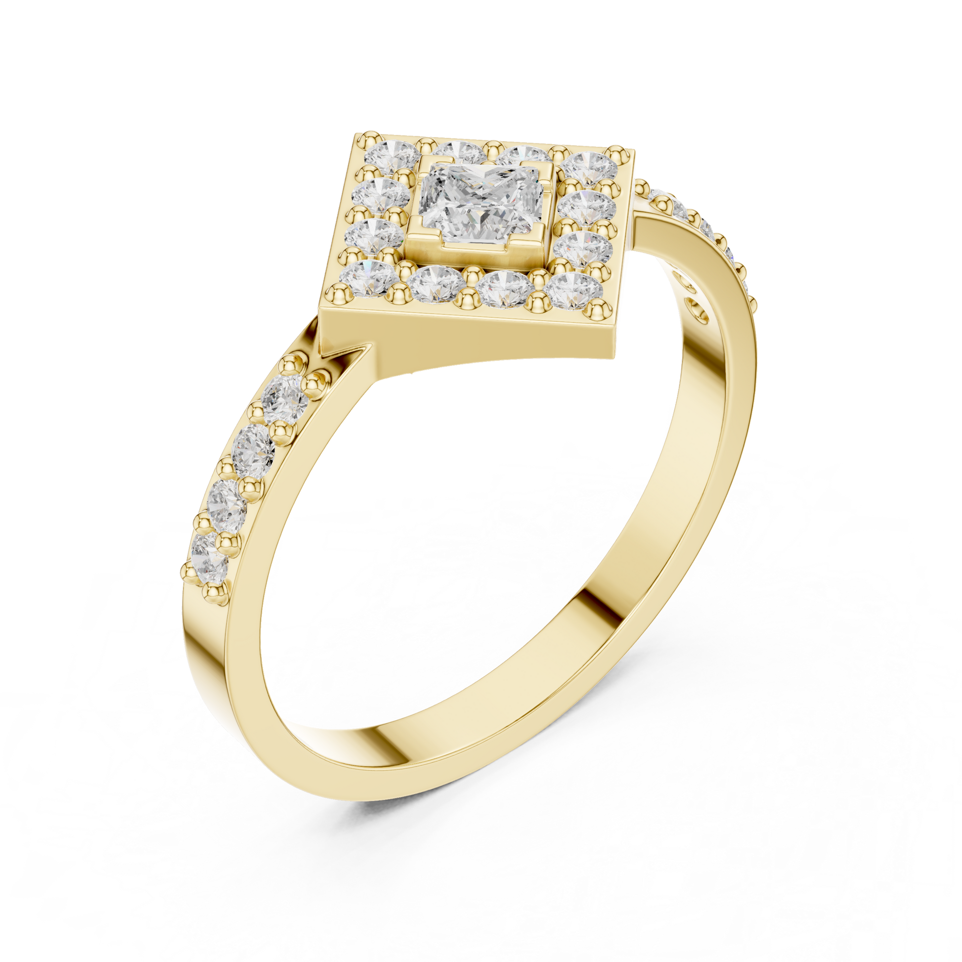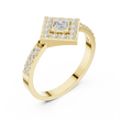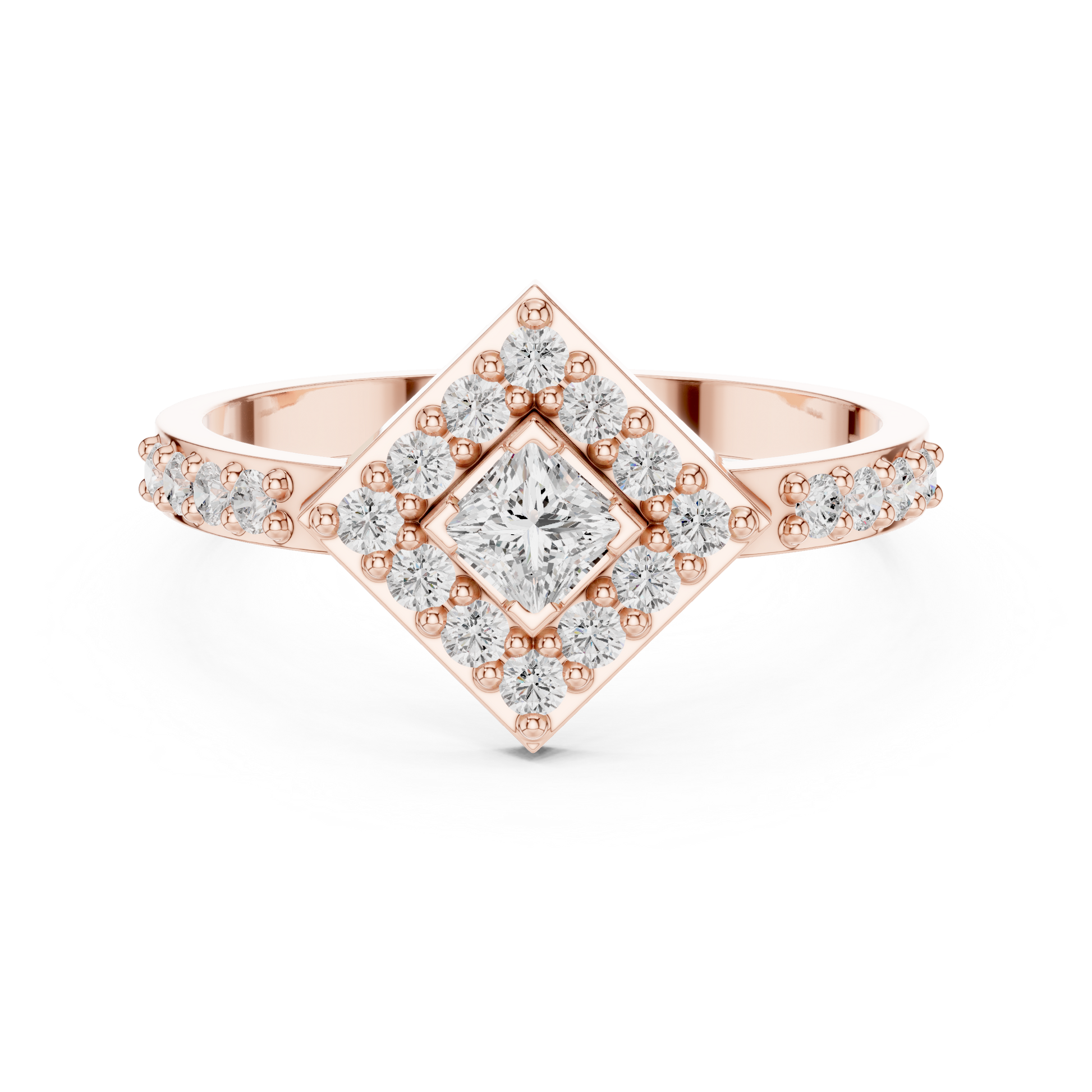 This exquisite ring features a brilliant princess-cut center stone framed within a striking square halo of radiant round diamonds. Set in polished gold, the design blends sharp geometry with soft sparkle, creating an elegant balance of modern and timeless beauty. The pavé-set band enhances its brilliance, making this ring a captivating statement piece perfect for celebrations, special moments, or everyday luxury.