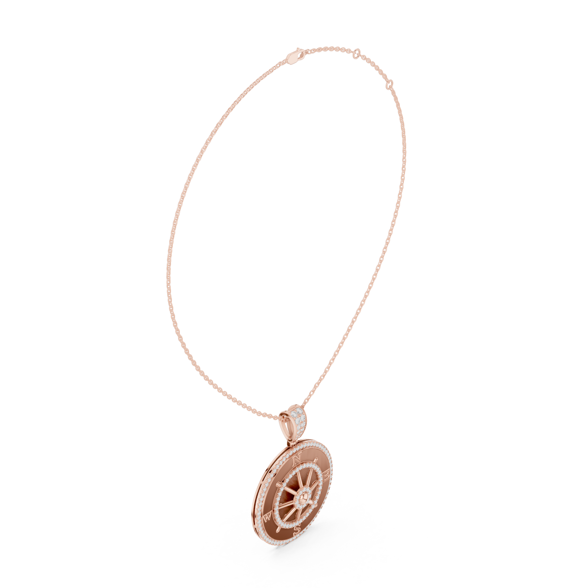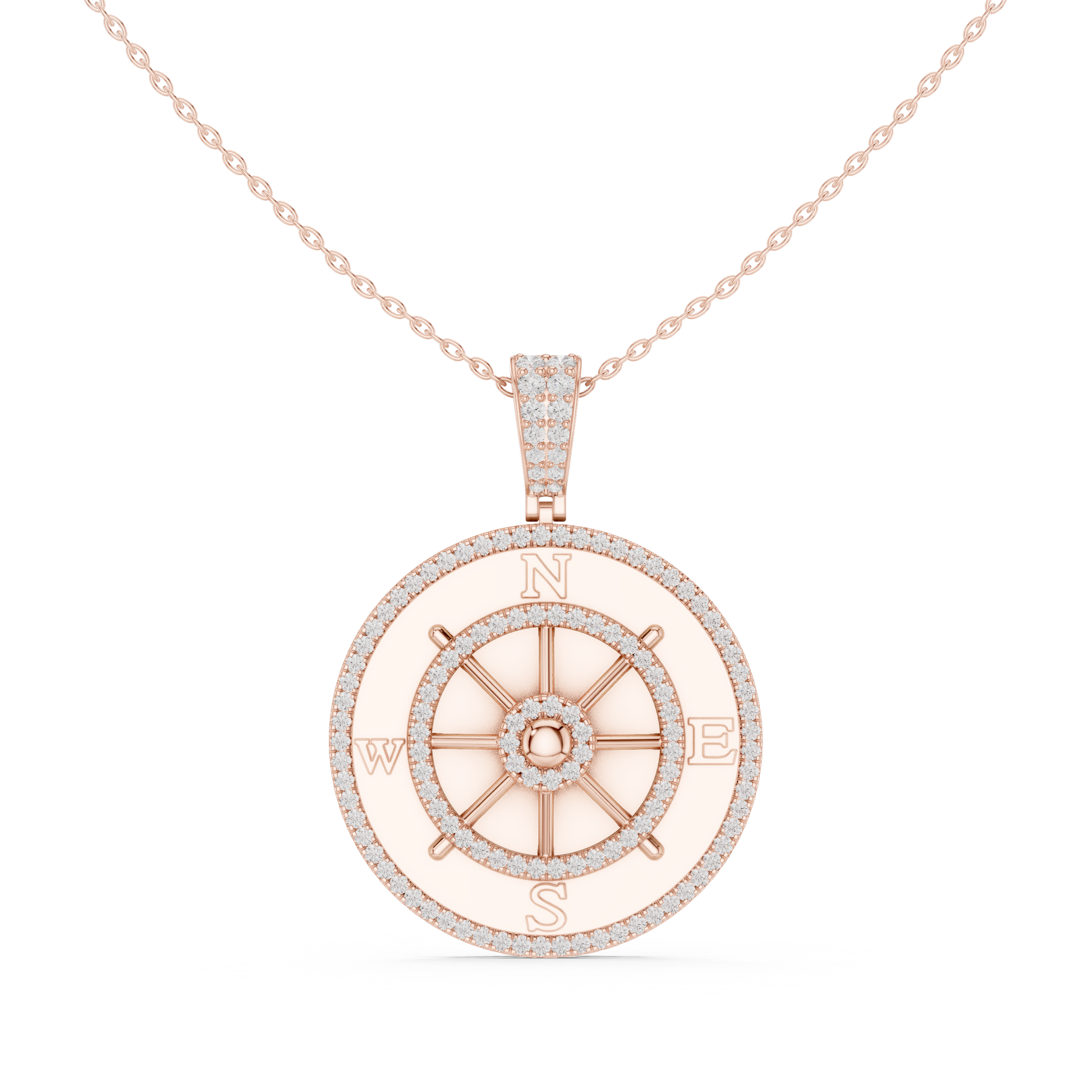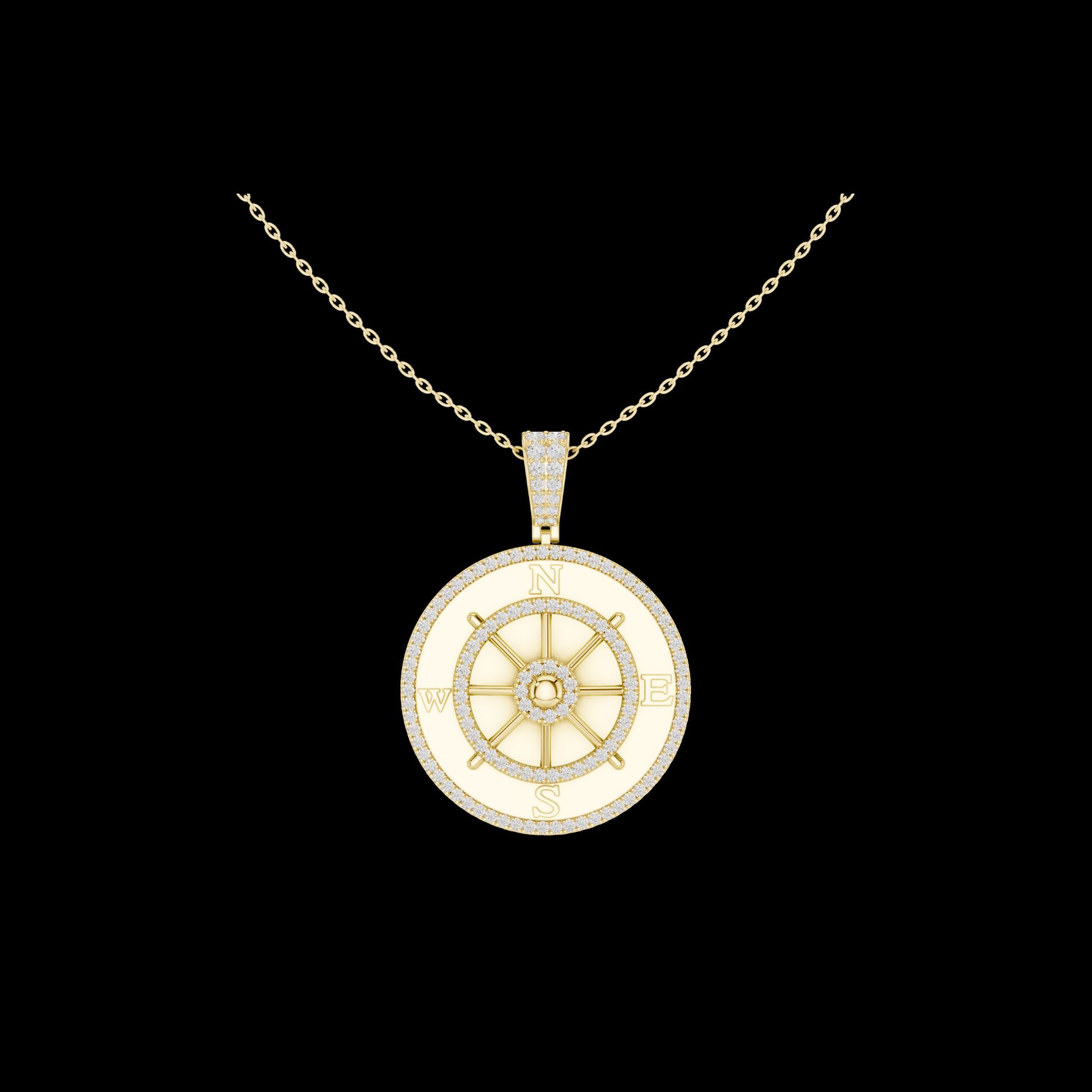 This stunning compass wheel pendant showcases a refined round compass design with North, South, East, and West detailing, beautifully highlighted with sparkling diamond accents set in a rich gold tone. Crafted for those who value meaning and elegance, this piece symbolizes guidance, direction, and inner strength. The polished finish, detailed bail, and balanced proportions make it perfect for both everyday wear and special occasions.