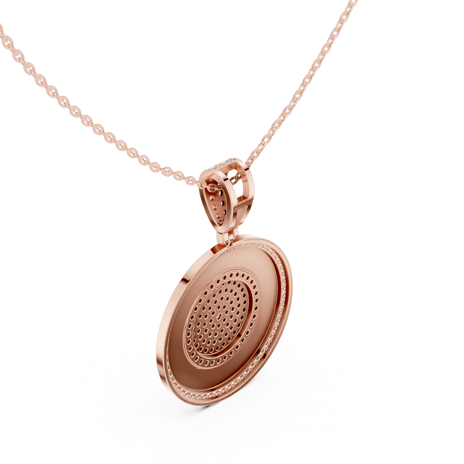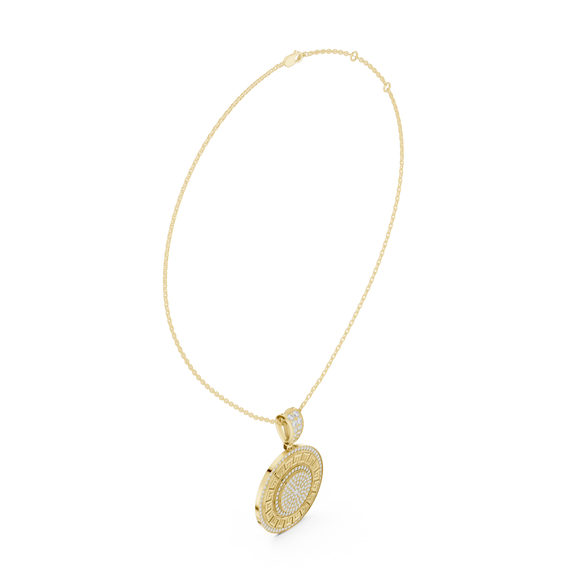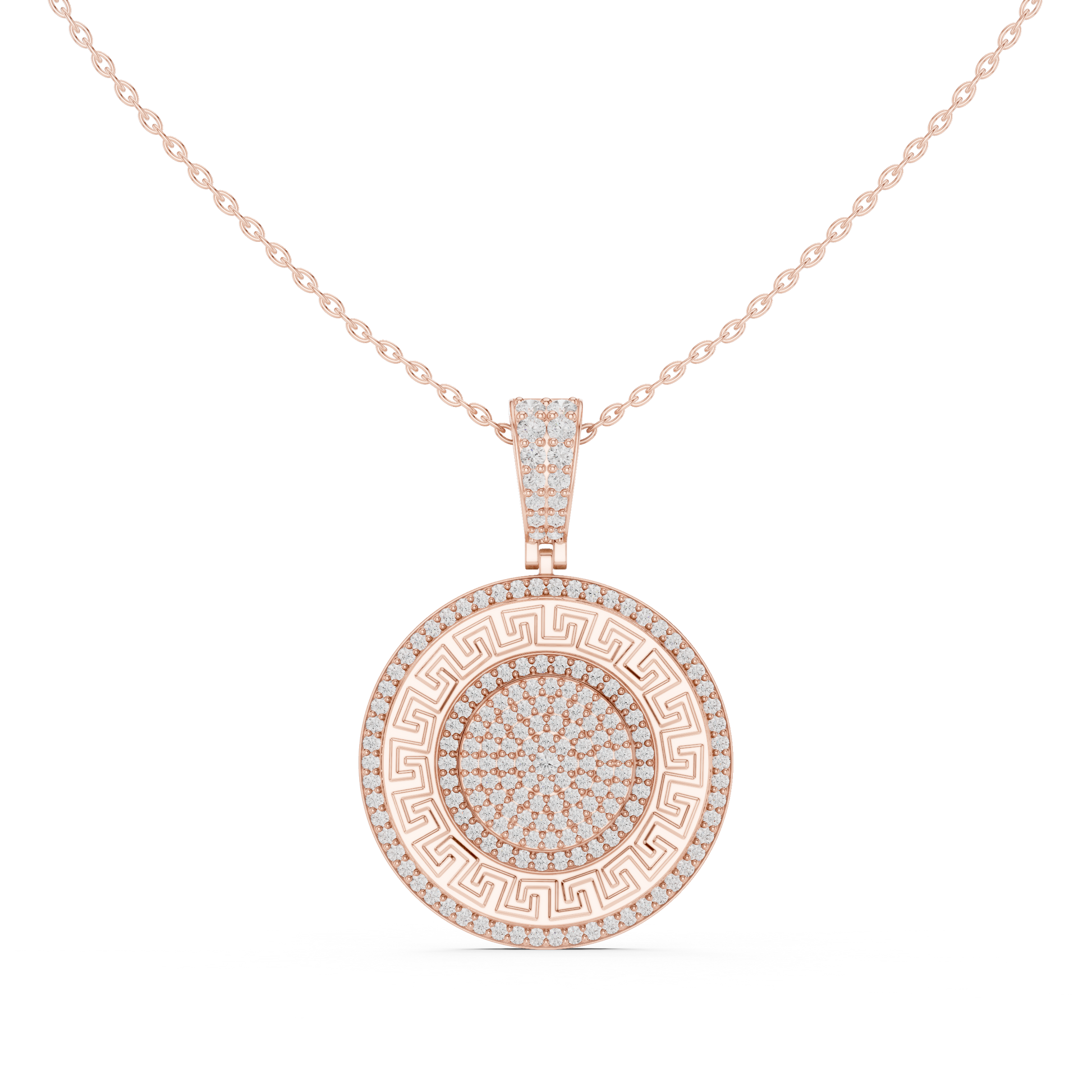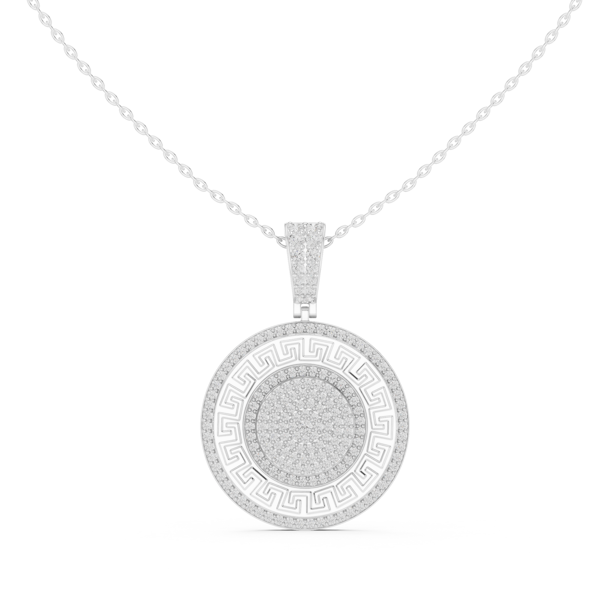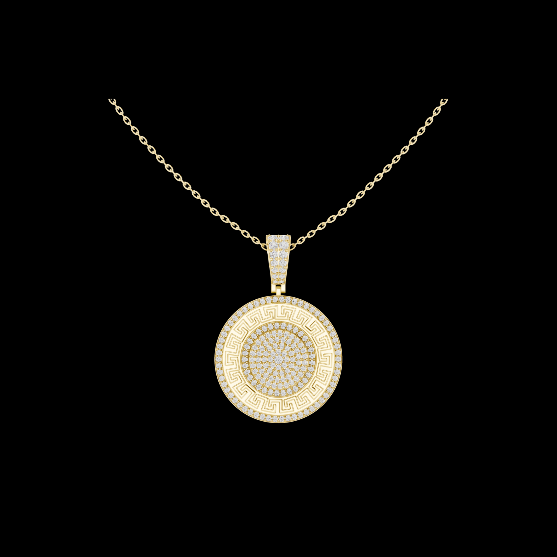 Experience timeless elegance with this exquisite medallion pendant from Ivevar Luxury, designed to make a bold yet refined statement. This round gold pendant features a classic Greek key border, symbolizing infinity and strength, beautifully surrounding a fully pave-set center of shimmering stones. The pendant is suspended from a durable, polished gold chain and finished with a stone-encrusted bail, ensuring brilliance from every angle.