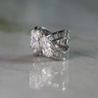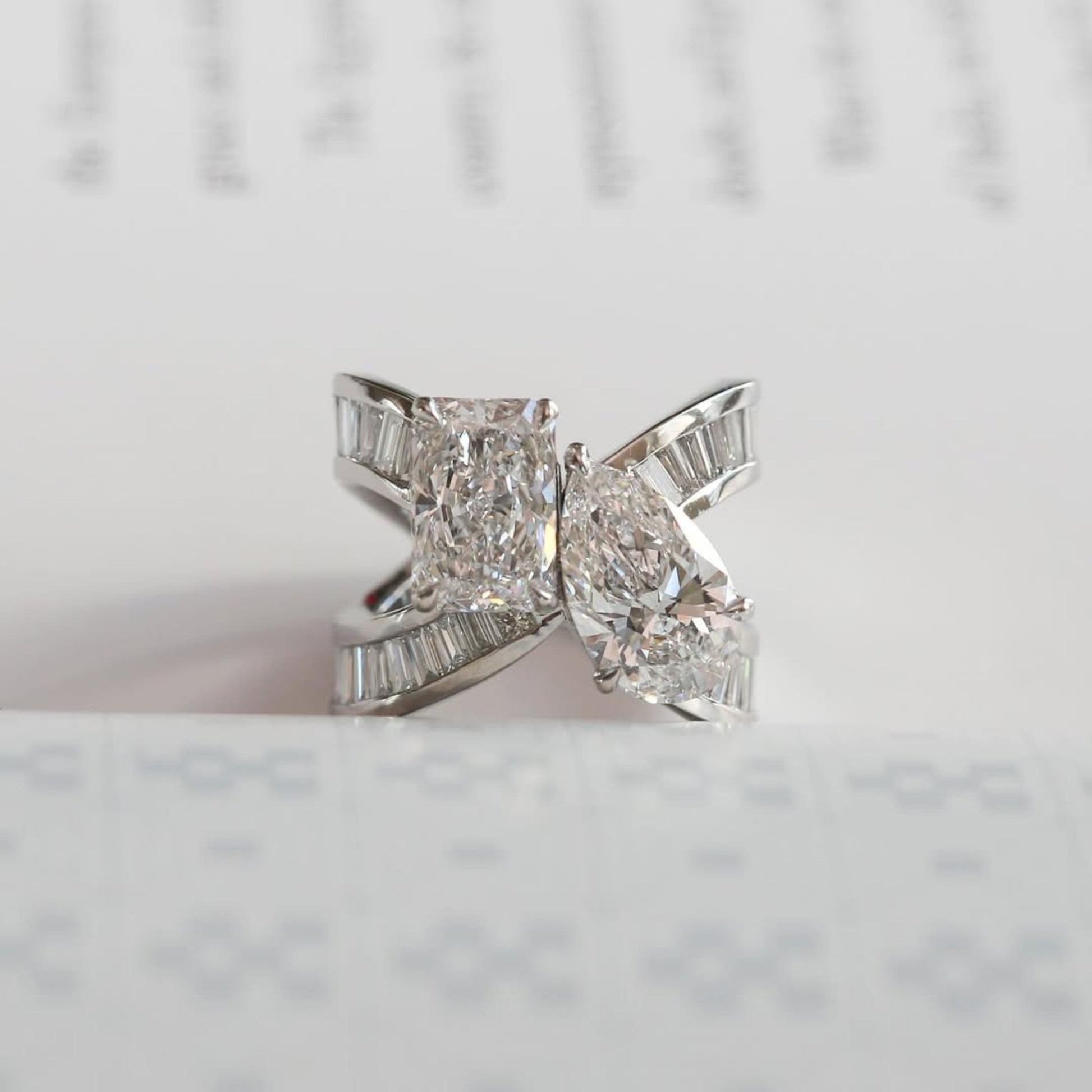This luxury double diamond ring features a stunning radiant cut diamond paired with a brilliant pear cut diamond, creating a bold and modern silhouette. Set on a sleek white gold band with baguette diamond accents, this design delivers high brilliance, architectural elegance, and couture-level craftsmanship. Perfect for those who want a unique engagement ring, statement fine jewelry, or a one-of-a-kind luxury look.