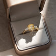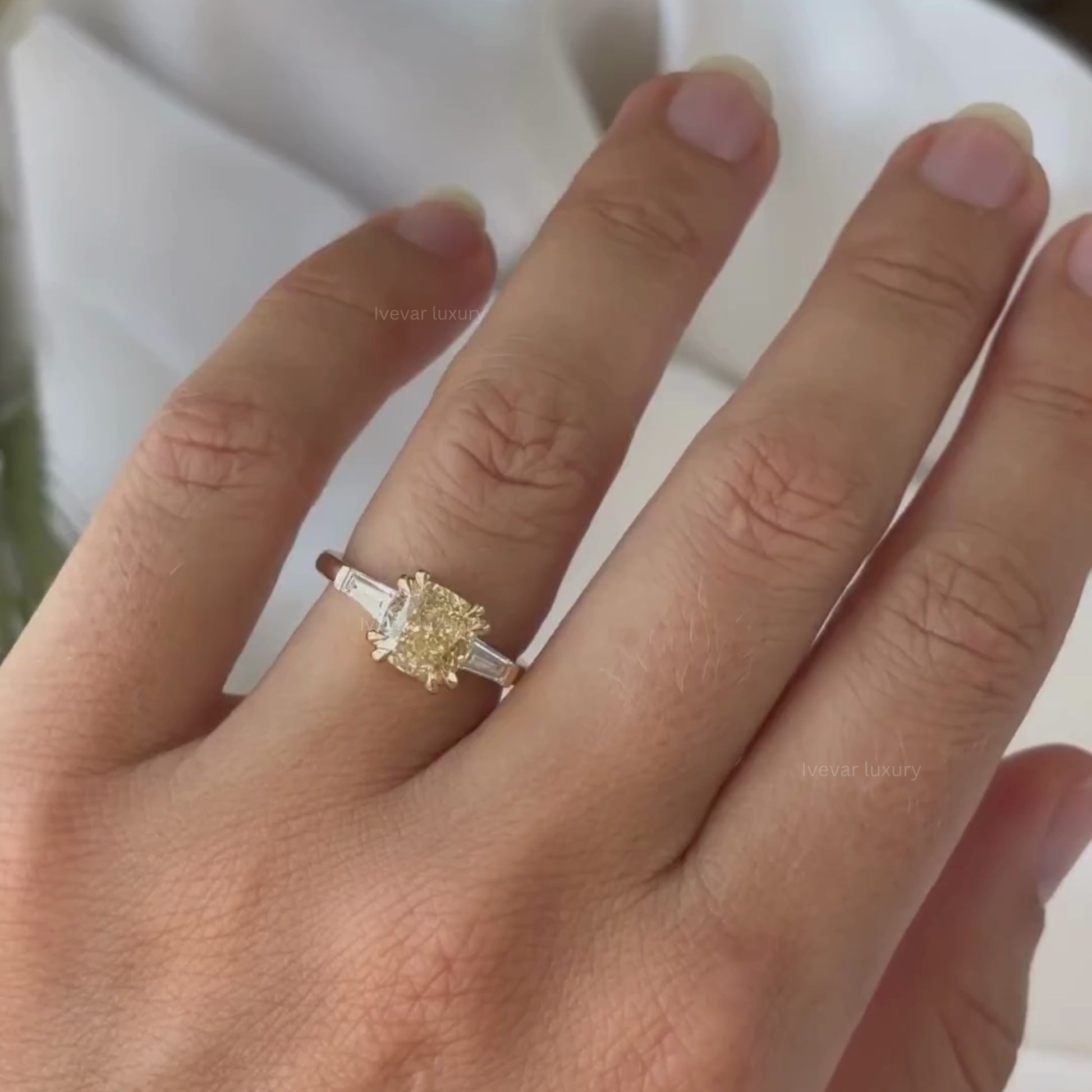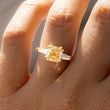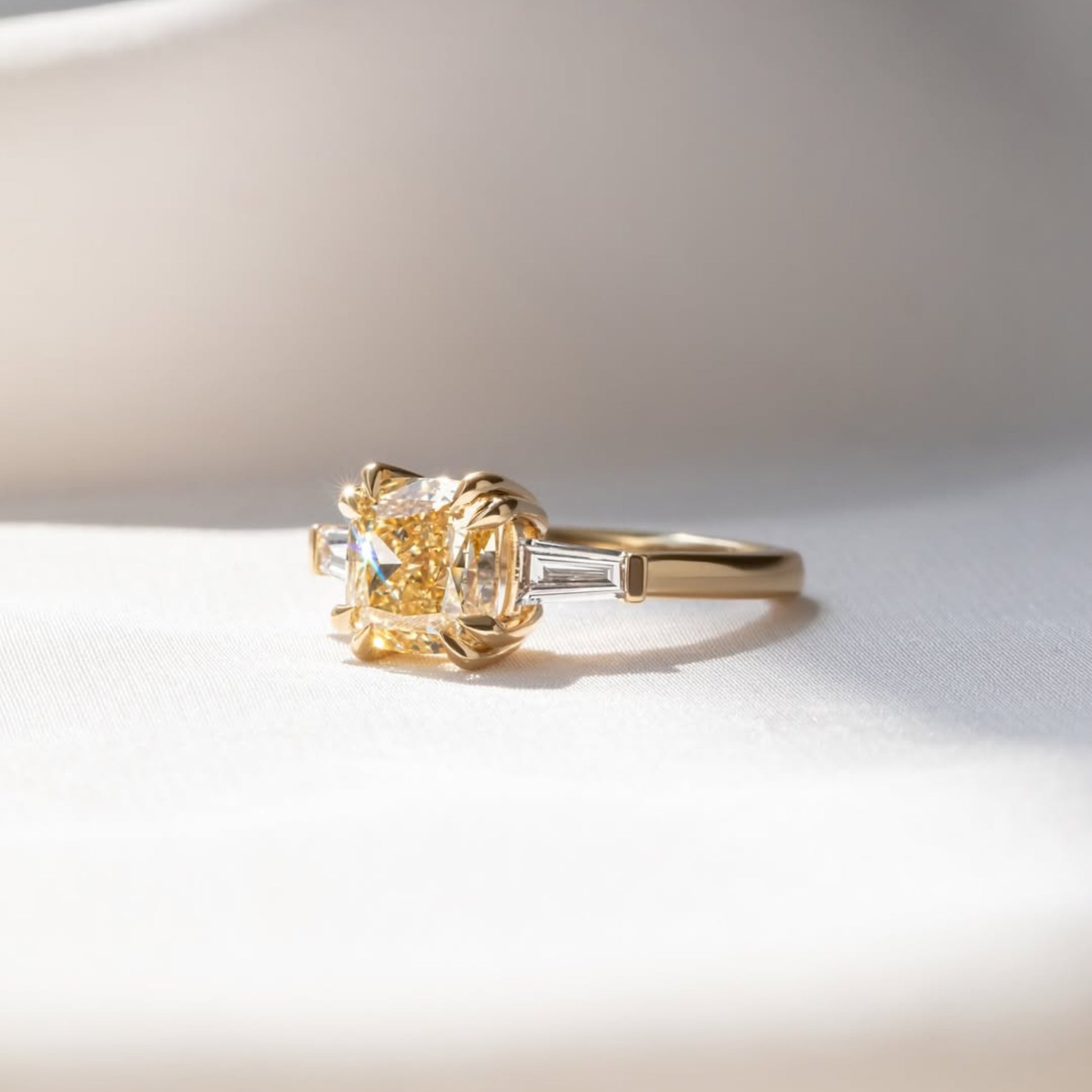 This refined three-stone ring features a luminous cushion-cut fancy intense yellow center stone secured by sculpted prongs, flanked by sleek tapered baguette side stones for a balanced, architectural look. The clean lines of the band and the contrast between the warm golden center and crisp side accents create a timeless yet contemporary design. Perfect for engagements or milestone moments, this ring offers elegant brilliance with understated sophistication.