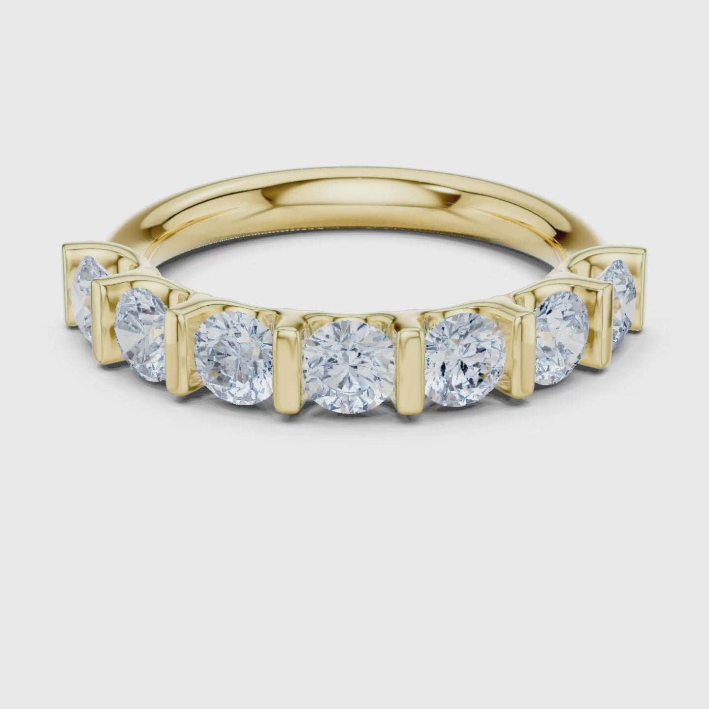 Celebrate timeless elegance with this breathtaking bar-set diamond eternity band, meticulously crafted in luminous gold. Each round brilliant diamond is secured in sculpted golden bar settings that enhance sparkle while giving the ring a modern, structured silhouette. Designed for those who appreciate bold radiance and refined craftsmanship, this band delivers uninterrupted brilliance across the finger. Perfect as a wedding band, anniversary ring, or luxurious stacking piece, it offers enduring beauty and a statement of everlasting love.