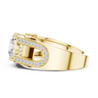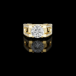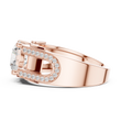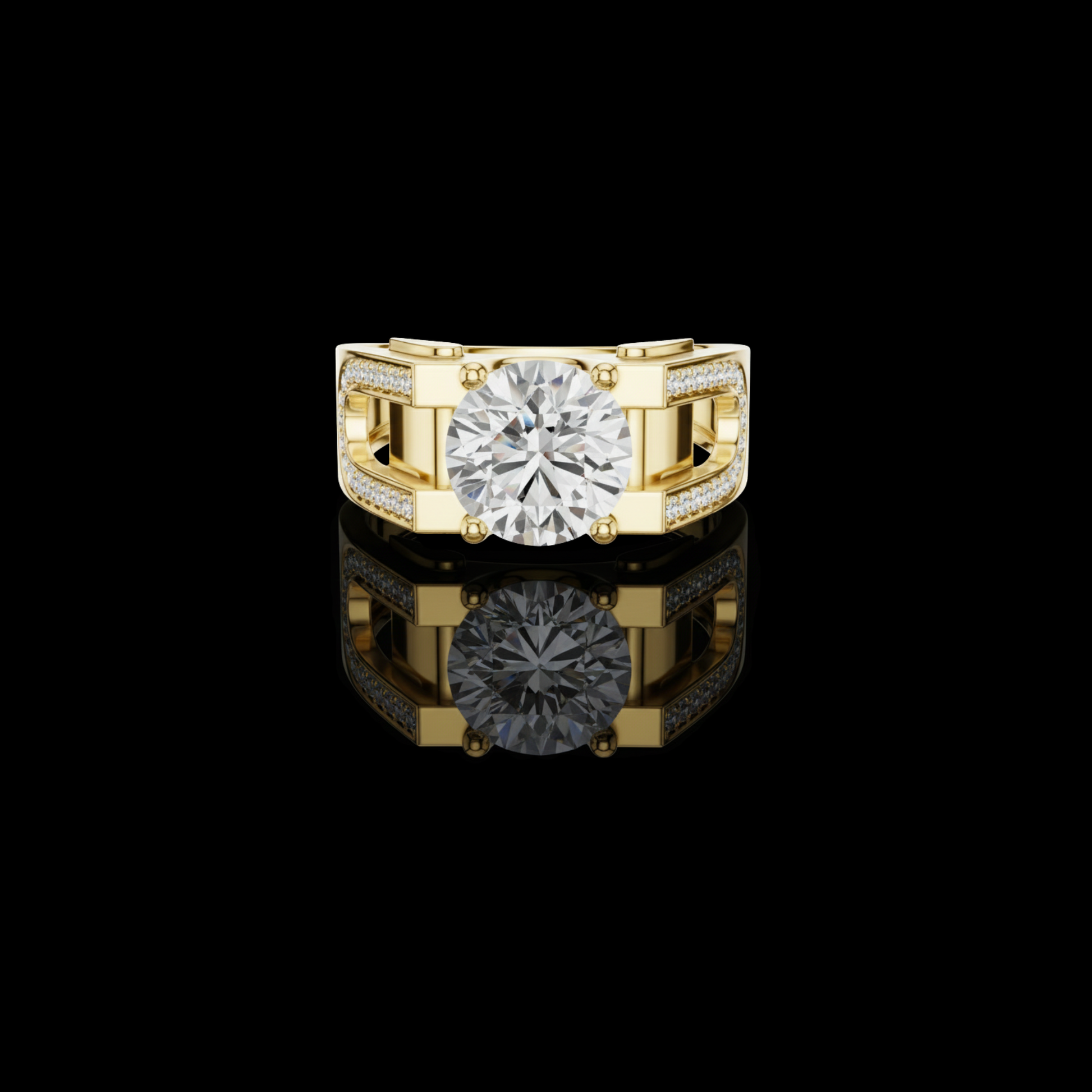 This extraordinary ring centers on a luminous round-brilliant diamond, celebrated for its fire, symmetry, and timeless appeal. Held within a bold, structured setting, the design features refined pavé-set diamonds along the sides, adding depth, sparkle, and visual strength.The wide, sculptural band showcases precision craftsmanship and a confident aesthetic, blending modern architecture with classic diamond brilliance.