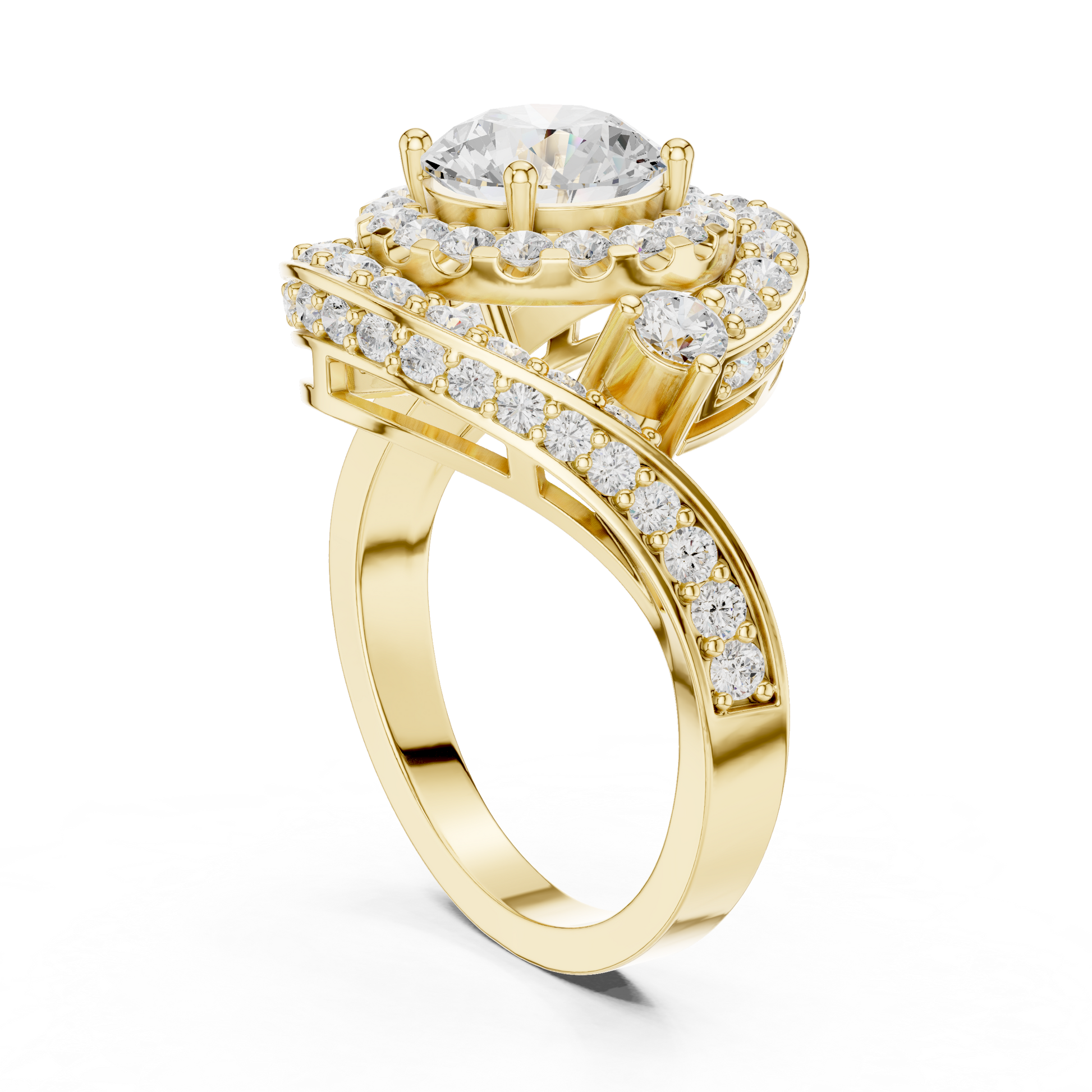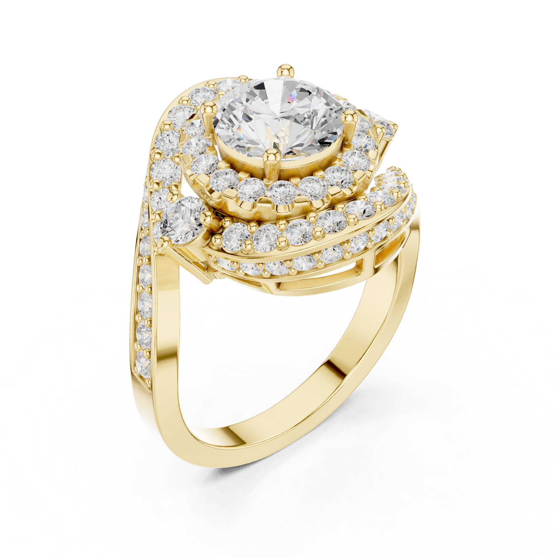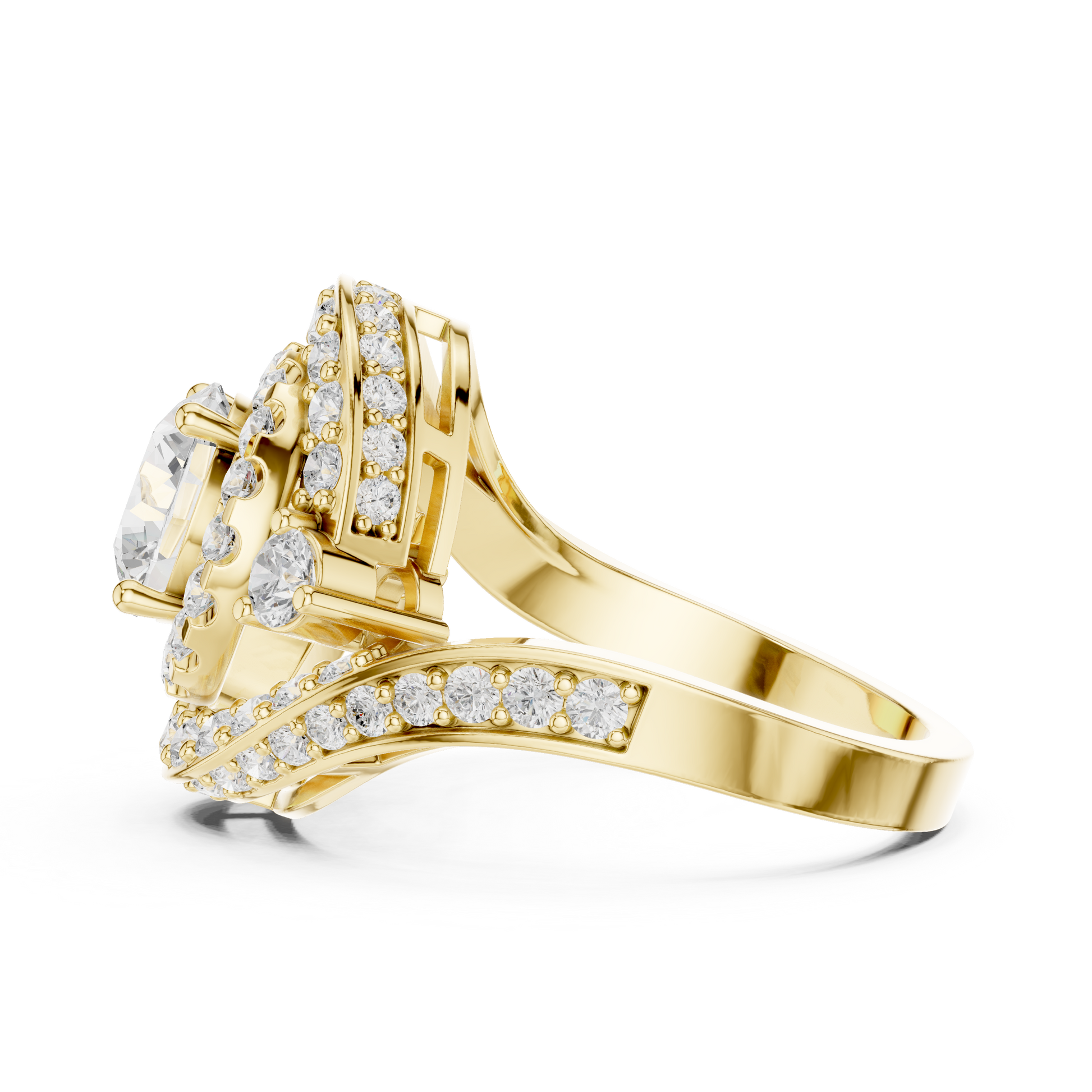 Crafted to shine from every angle, this round-cut diamond ring features a luminous center stone surrounded by a dramatic layered halo that creates depth, dimension, and intense brilliance. The wide pave set band adds a bold, luxurious presence while maintaining refined elegance. Finished in polished gold, this design is perfect for those who want a standout engagement ring or a powerful symbol of everlasting love.