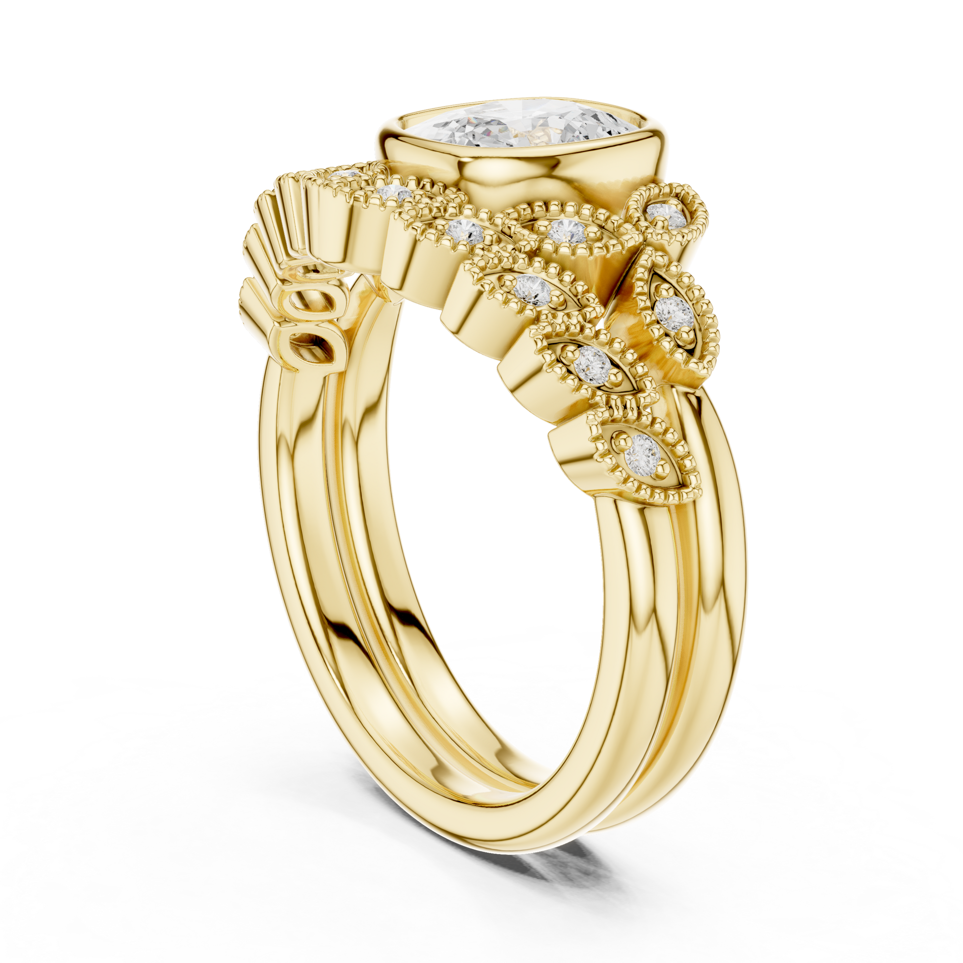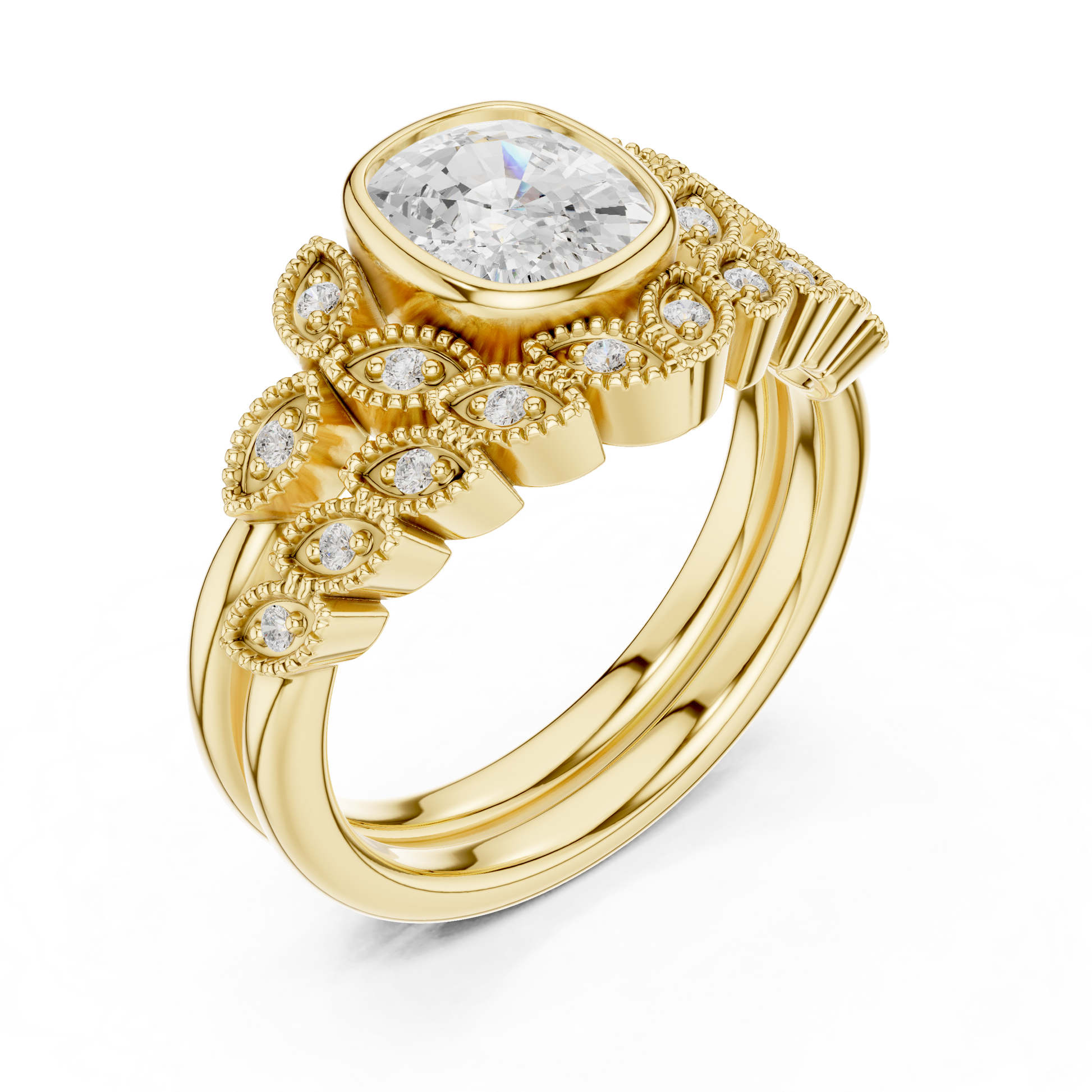 This breathtaking gold ring features a brilliant cushion-cut center diamond framed by an ornate vintage-inspired halo. Intricately detailed gold work and shimmering accent diamonds create a rich, luxurious look that blends timeless elegance with bold craftsmanship. Perfect for engagements, anniversaries, or a statement of everlasting love, this ring is designed to captivate from every angle.