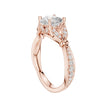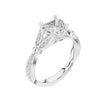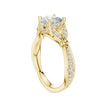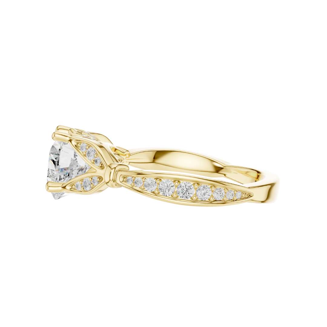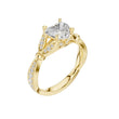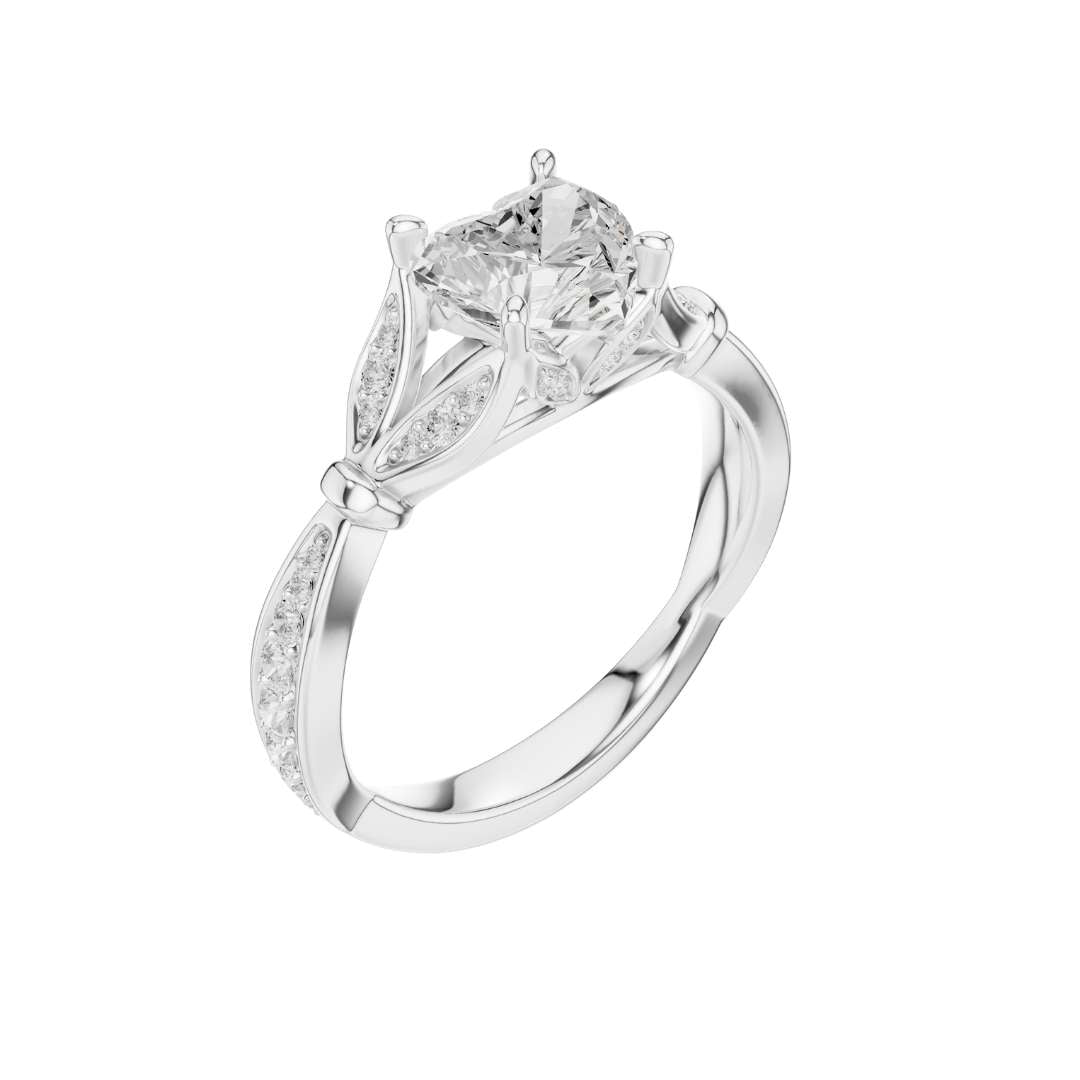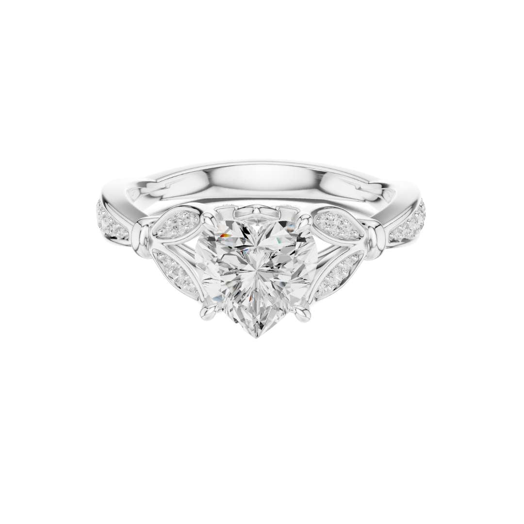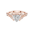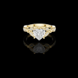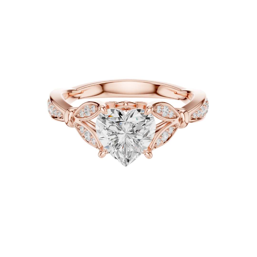This romantic engagement ring features a brilliant heart-shaped center diamond set in luminous gold, symbolizing love in its purest form. Graceful vine-inspired detailing sweeps along the band, accented with sparkling pave diamonds that add depth, texture, and continuous shimmer. The sculpted curves and delicate craftsmanship create a design that feels both timeless and expressive, making this ring a captivating choice for a love story that is truly one of a kind.