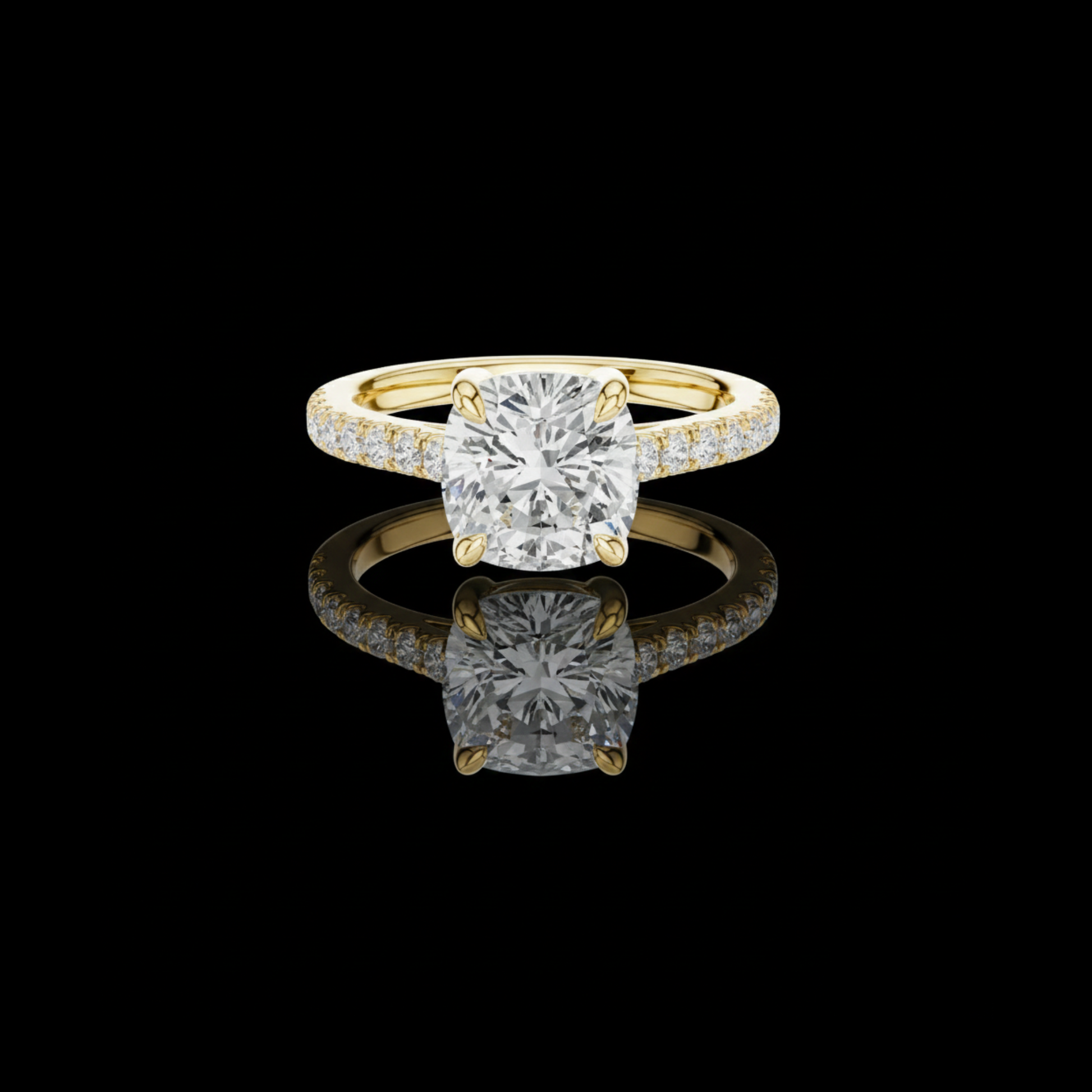 This exquisite Cushion Cut Diamond Engagement Ring from Ivevar Luxury blends timeless elegance with modern brilliance. The cushion-cut center stone captures light beautifully, creating a radiant sparkle from every angle. A sleek gold band lined with pavé-set diamonds adds extra shine and sophistication, making this ring perfect for proposals or meaningful celebrations. Crafted with precision and luxury detailing, it stands as a symbol of love, commitment, and refined style.